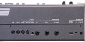 Le clavier présente à l’arrière 4 sorties MIDI, un port USB MIDI, deux entrées pour pédales de contrôle continu et une autre pour pédale de sustain. Tout cela est alimenté sur secteur et vous pourrez également alimenter un dispositif USB.