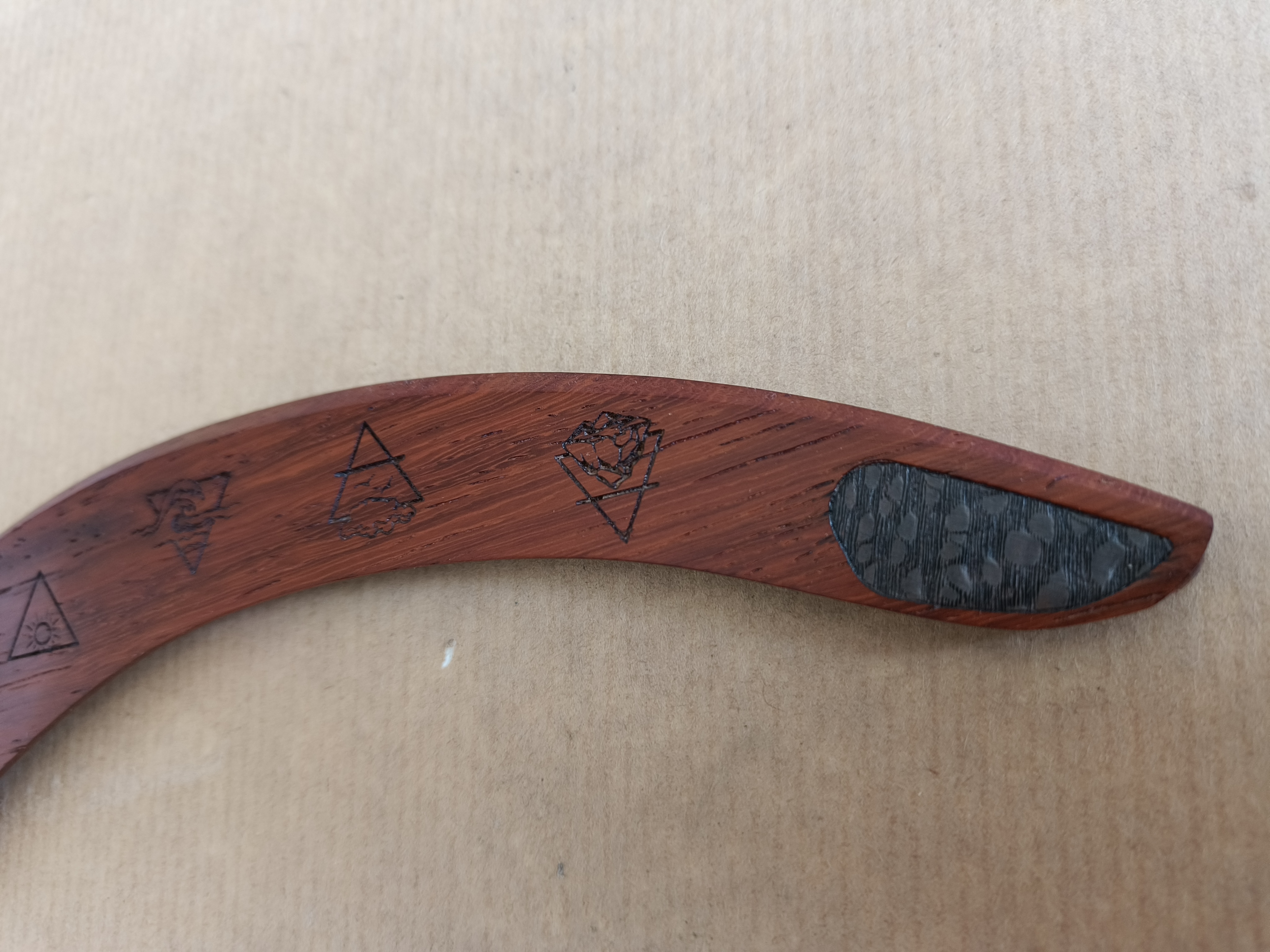 La petite pièce en ronde gravées est en acajou pommelé et encollée sur une fine pièce de tabu gris clair.