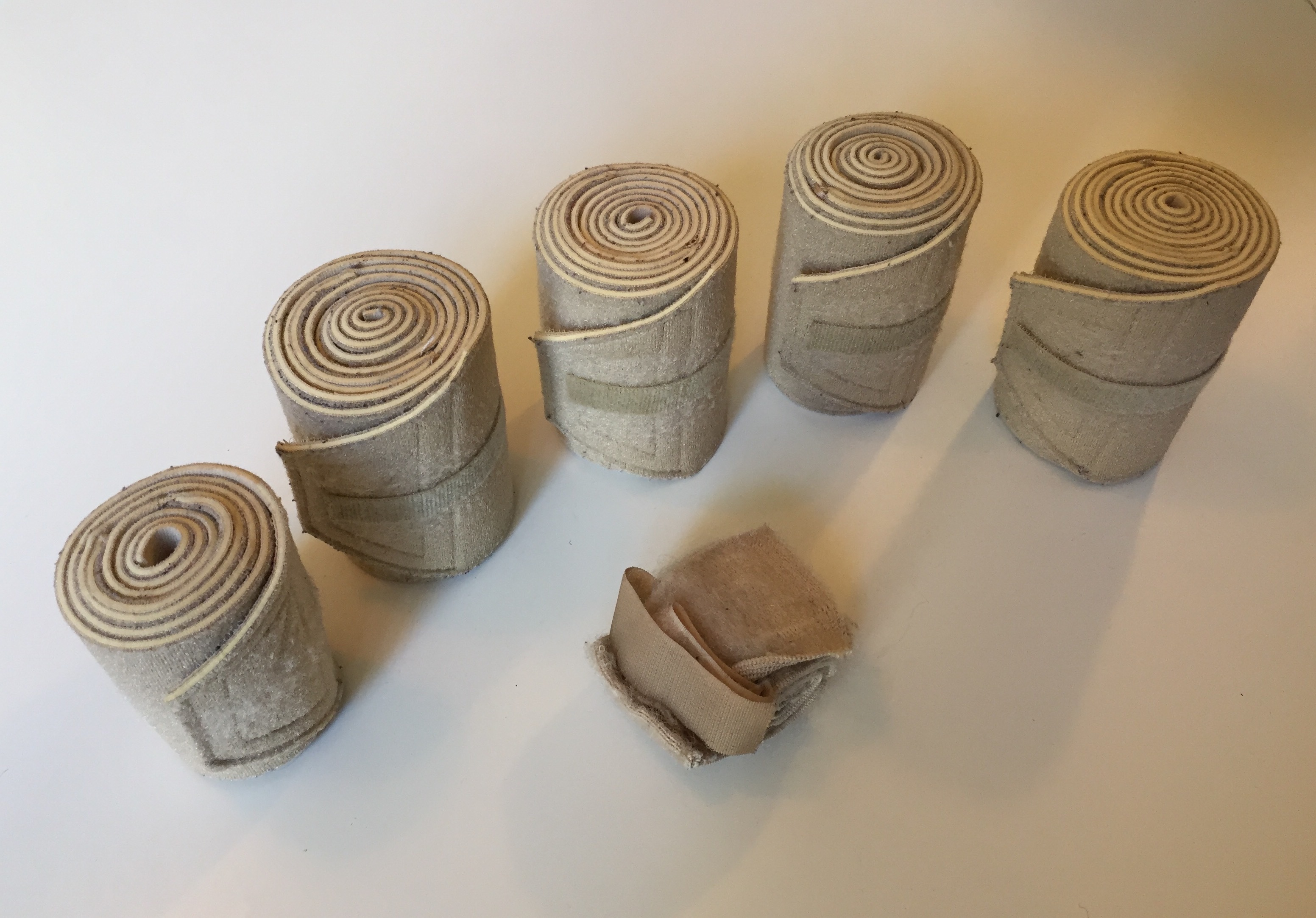 4 ceintures, 1 jarretière, 1 chevillèreValeur neuf l'unité : ceintures 30€, jarretière 20€, chevillère 15€