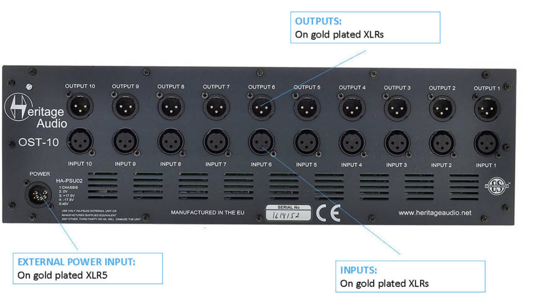 Le OST-10 est un châssis 500 Series au format rack 3U, pouvant accueillir jusqu’à 10 modules. Comme le reste de la gamme de châssis 500 Series de Heritage Audio, il intègre la technologie « ON SLOT Technology » (OTS).