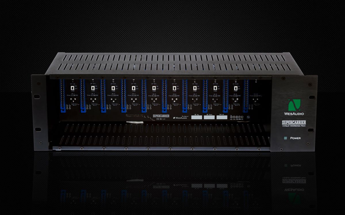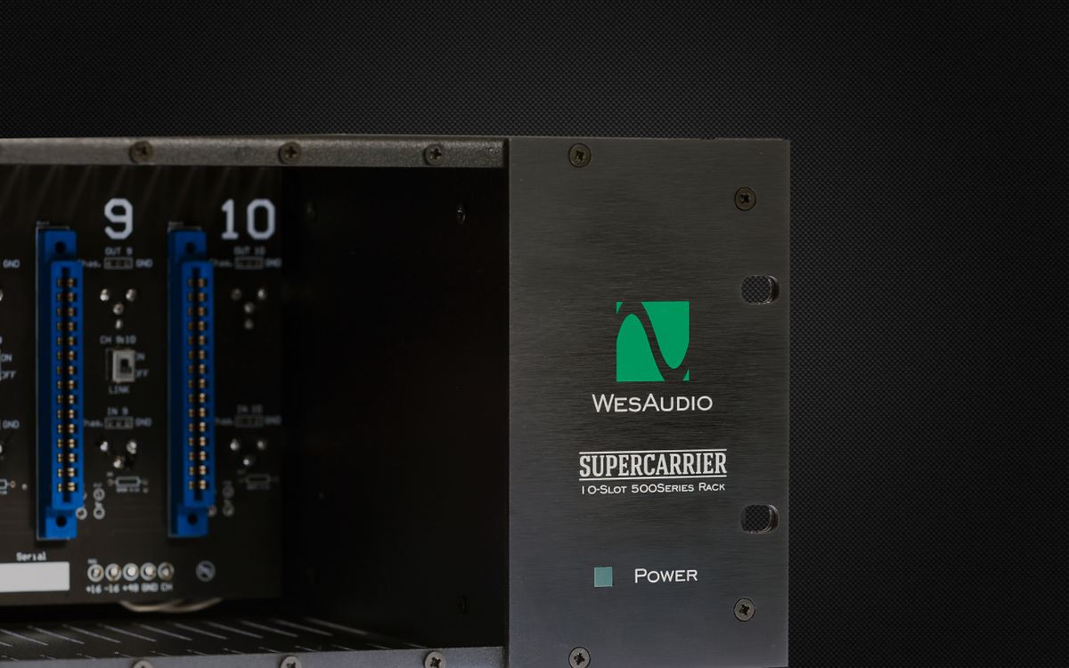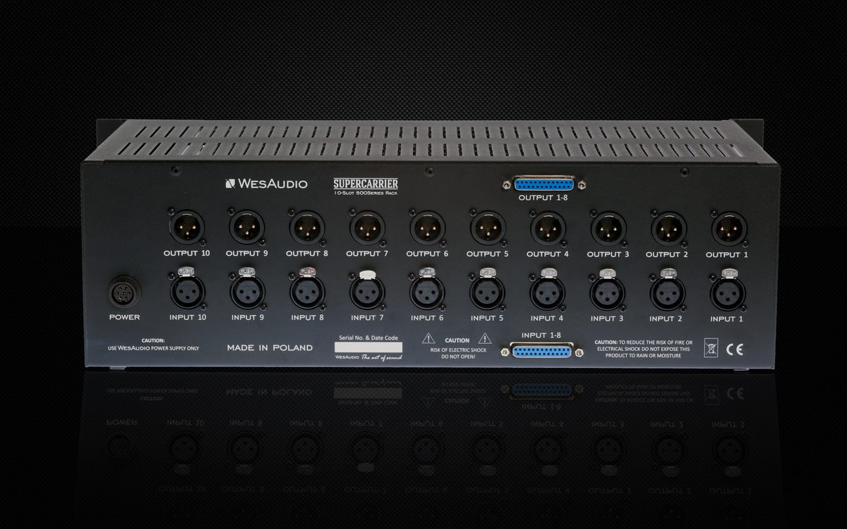 Le Supercarrier est un rack 19” pouvant accueillir un maximum de 10 modules au format 500. Il dispose d’une alimentation externe développant 5 ampères, d’un switch Link stéréo permettant le couplage de modules (compresseurs par exemple) et les 8 premiers modules peuvent être connectés via DSub au standard Tascam en plus du XLR.