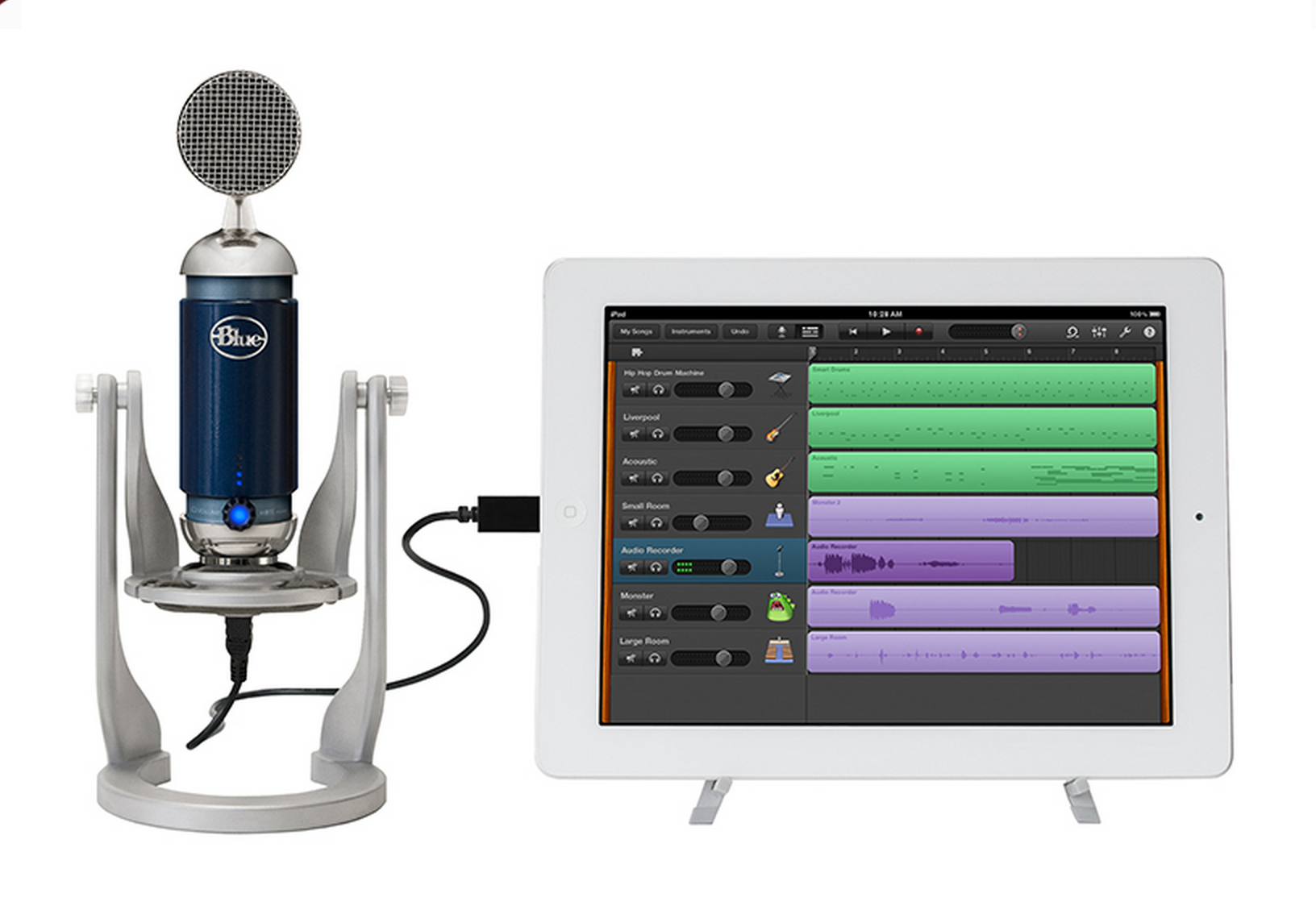 Une interface audio permet d’utiliser n’importe quel micro sur XLR, soit un choix immense de modèles, et notamment des micros que vous possédez déjà. Si vous ne voulez pas d’interface audio, vous pourrez vous rabattre sur un micro compatible iOS à relier directement au connecteur Dock de votre iDevice, par exemple l’Apogee MiC 96K (127€), le Blue Microphones Spark Digital (199€) ou l’IK Multimedia iRig Mic HD (132€). Vous pourrez économiser de l’argent en optant pour un micro iOS à connecter directement au jack de votre iDevice, auquel cas le micro sera couplé au casque qui permet de vous entendre, au prix toutefois d’une perte de fidélité par rapport à un micro relié au connecteur Dock.