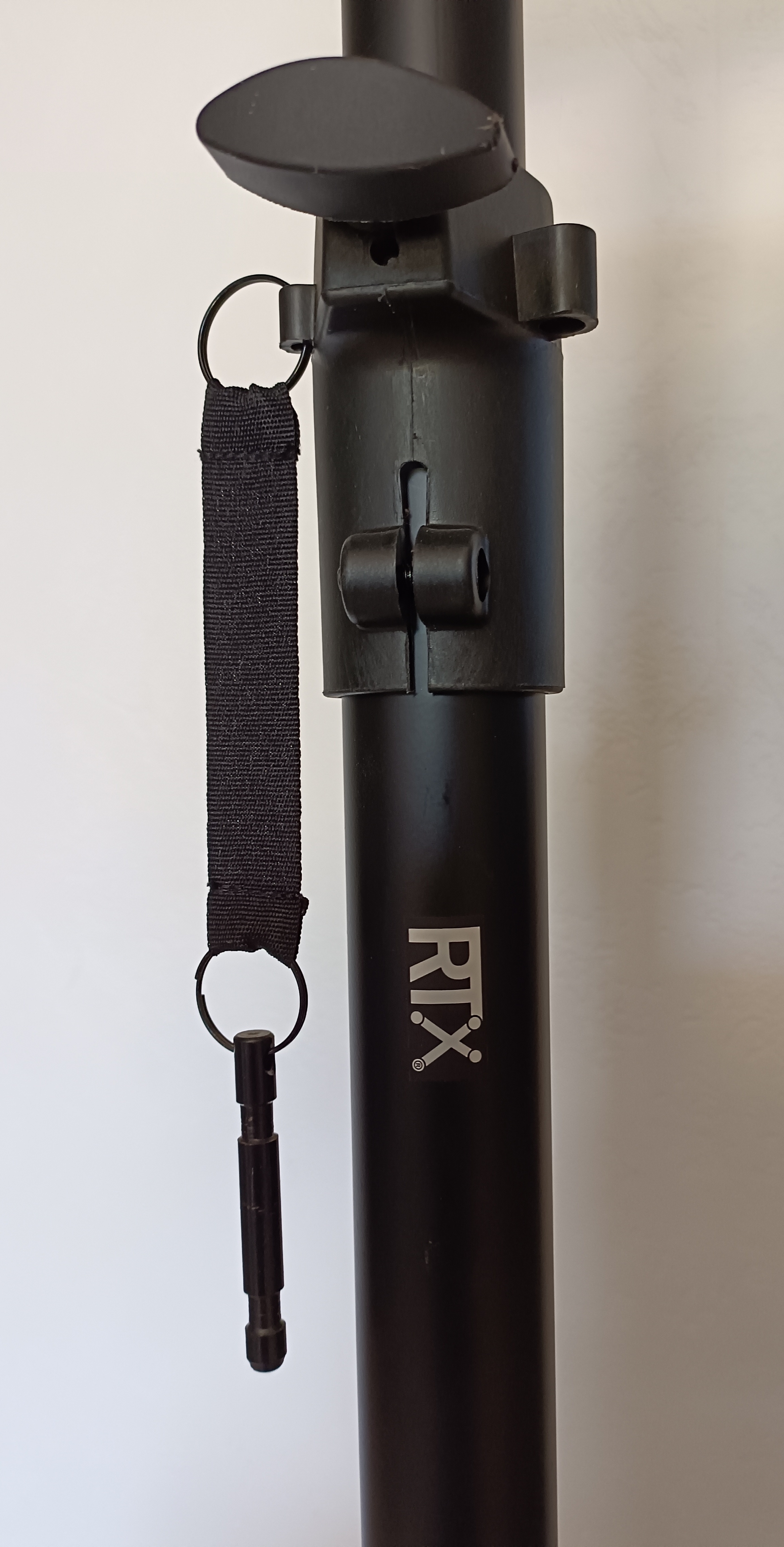 Pied d'enceinte de monitoring RTX SMR . Son embase triangulaire est fournie avec deux types de pieds (pointes ou patins en plastique au choix) ajustables en hauteur. Le tube central est télescopique et il est doté d’une goupille en plus du système de serrage pour éviter que le tube ne bouge avec les enceintes les plus lourdes.