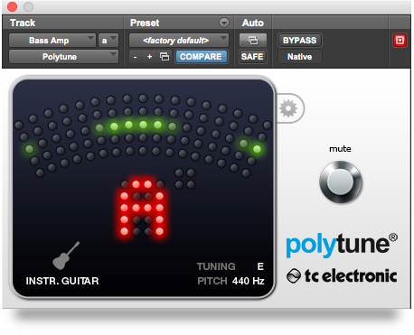 L’interface reproduit l’aspect de la pédale, ainsi que ses fonctionnalités principales : accordeur chromatique avec une précision de +/- 0.5 centième, jusqu’à 5 demi-tons pour le flat tuning, changement du pitch de référence et bouton Mute pour vous accorder en silence.