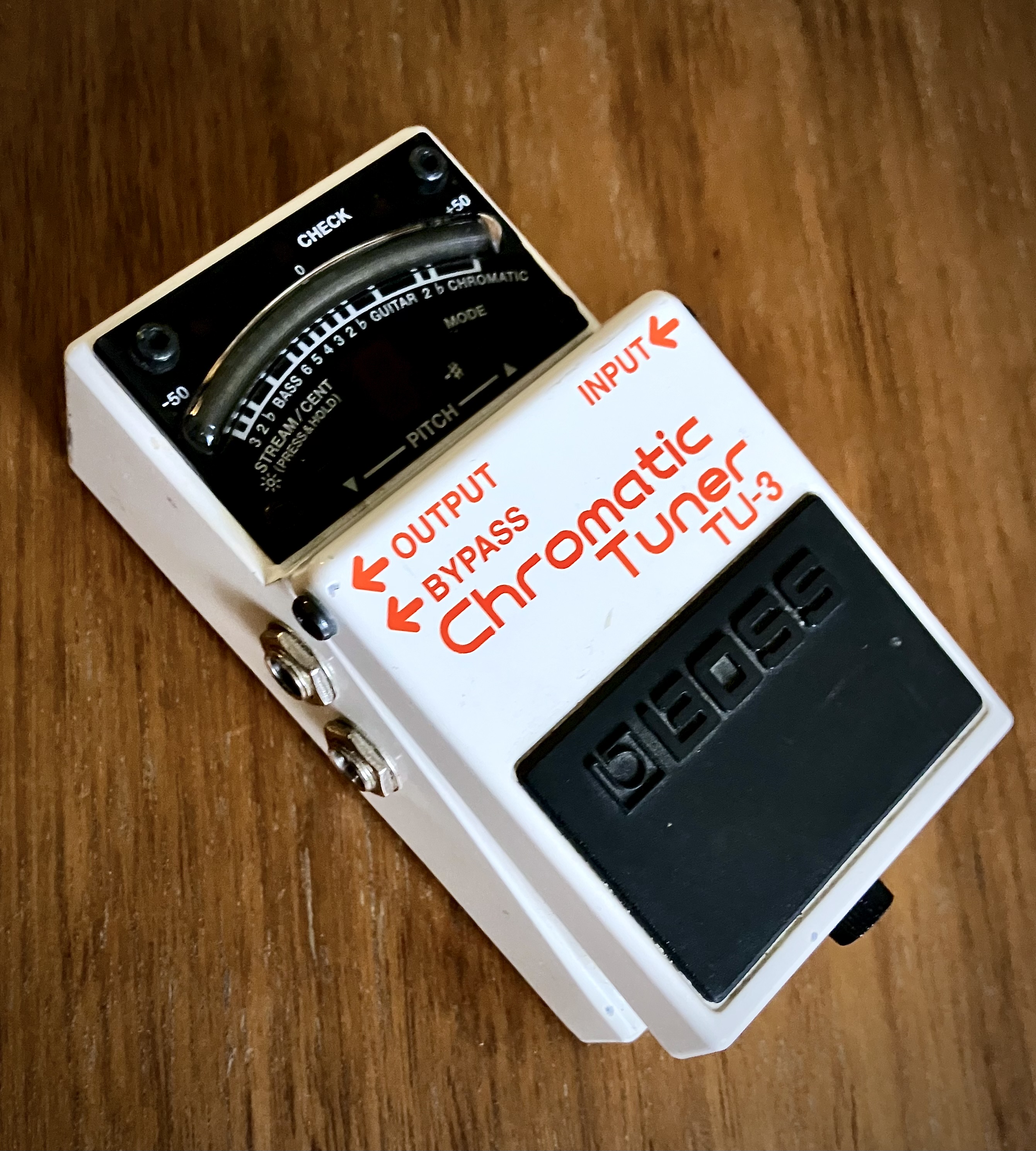 Je l'utilise uniquement dans le mode chromatique qui permet d'accorder chaque cordes, passer en drop etc sans rien toucher, il est toujours alimenter avec mes autres pédales Boss et possède une sortie pour alimenter une autre pédale.