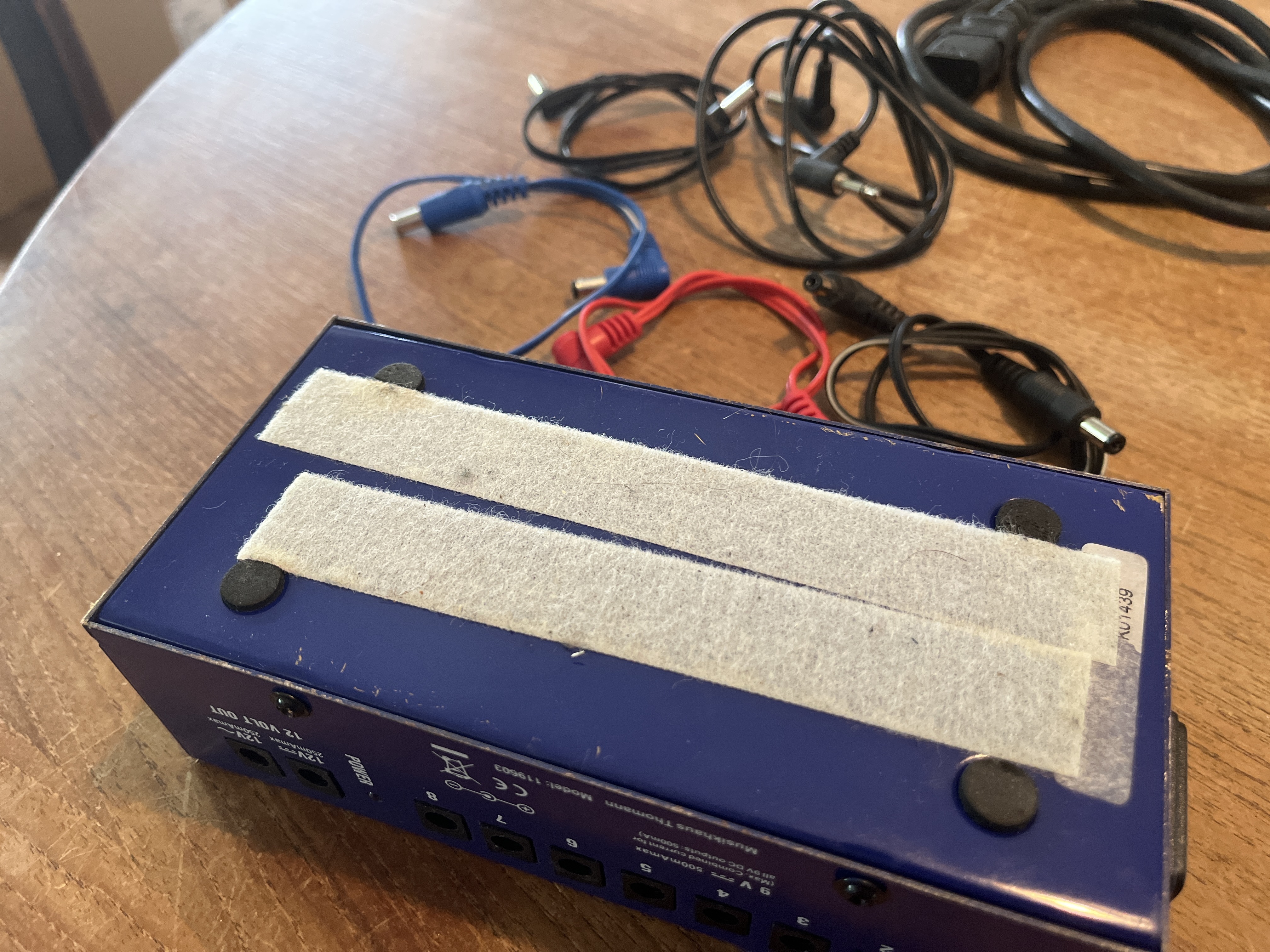 Je n’ai plus tous les cables d’origine pour relier le boîtier aux pédales. Ils étaient de faible qualité et se sont vite abîmés… J’en ai racheté 4 (un rouge, un bleu, et deux noirs), plus un câble d’origine, en sortie mini Jack, (je ne m’en suis jamais servi…).
