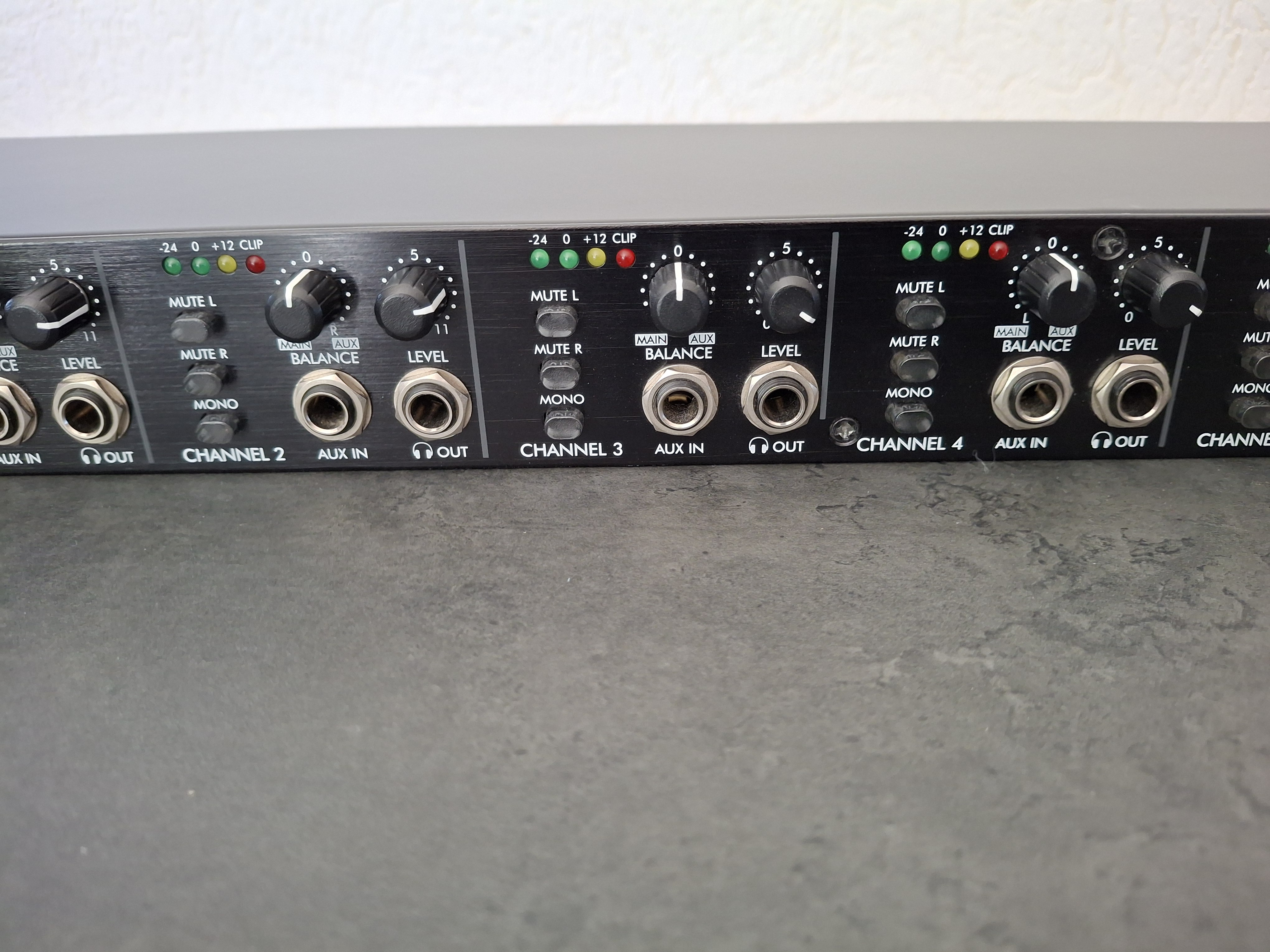 Un jack TRS panneau frontal supplémentaires pour les 1/4 pouce stéréo pour outrepasser correctif rapide des intrants panneau arrière est inclus pour l'insertion rapide de n'importe quelle source stéréo. Indicateurs de niveau LED huit segments fournissent une rétroaction visuelle le niveau de signal sur tous les canaux ainsi que sur le bus de signal principal.