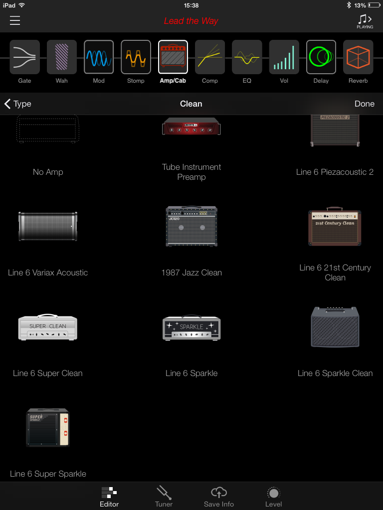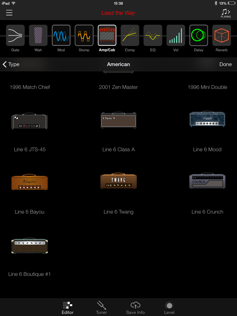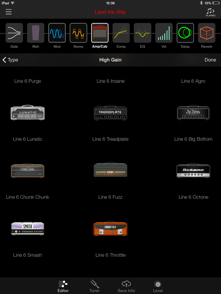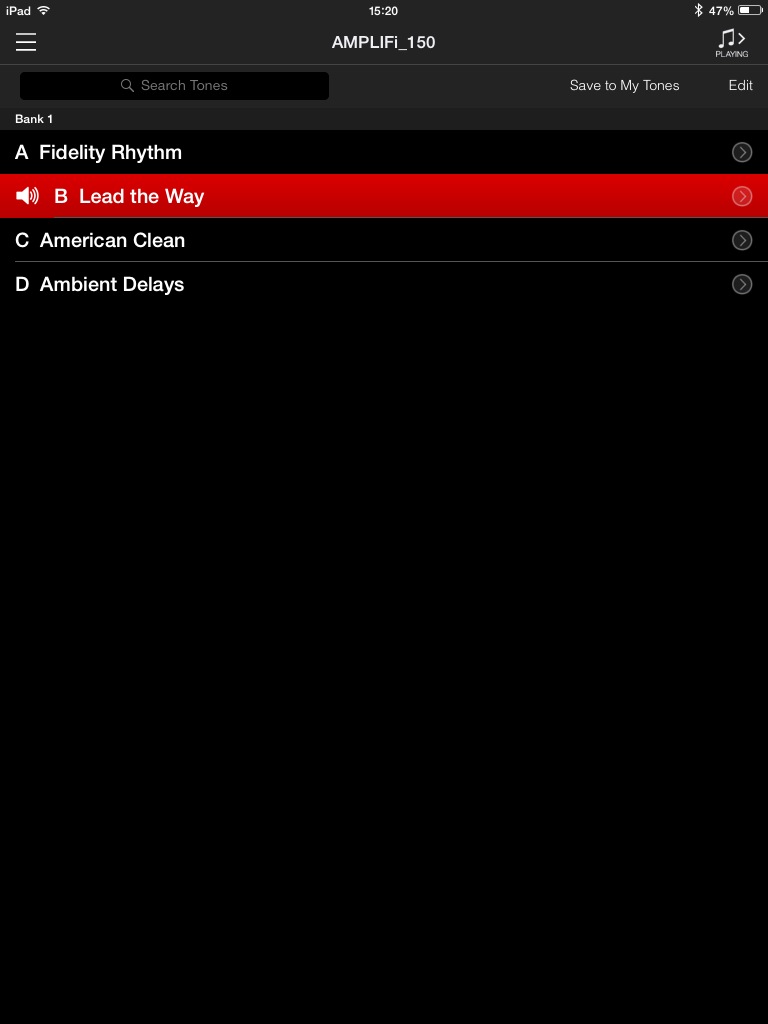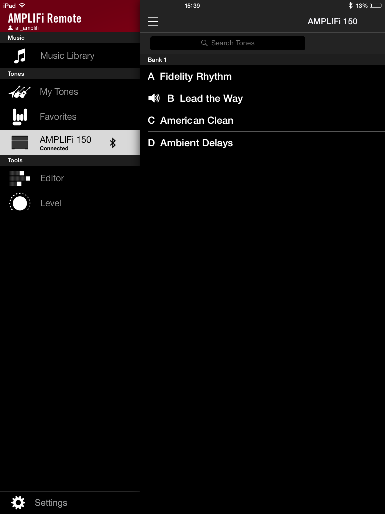 Vous remarquerez que le nom de l’onglet est en anglais. Dans l’iPad gracieusement prêté par Line 6 était installée une version BETA de l’app (avec un tout petit crash). Espérons qu’elle sera traduite dans notre langue et qu’elle gagnera en stabilité, ce dont je ne doute pas, connaissant le sérieux de la marque dans ce domaine. J’ai aussi remarqué que si l’on bascule de l’AMPLIFi REMOTE à une autre application, la connexion Bluetooth se perd avec l’ampli. Elle revient automatiquement dès qu’on relance l’application.
