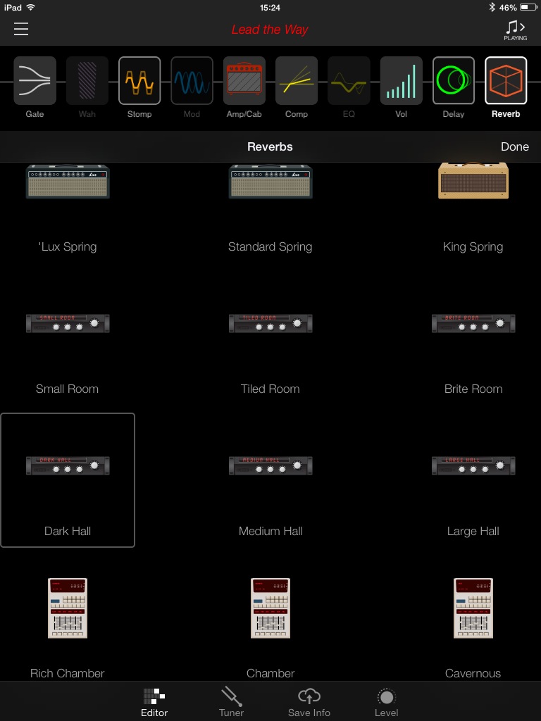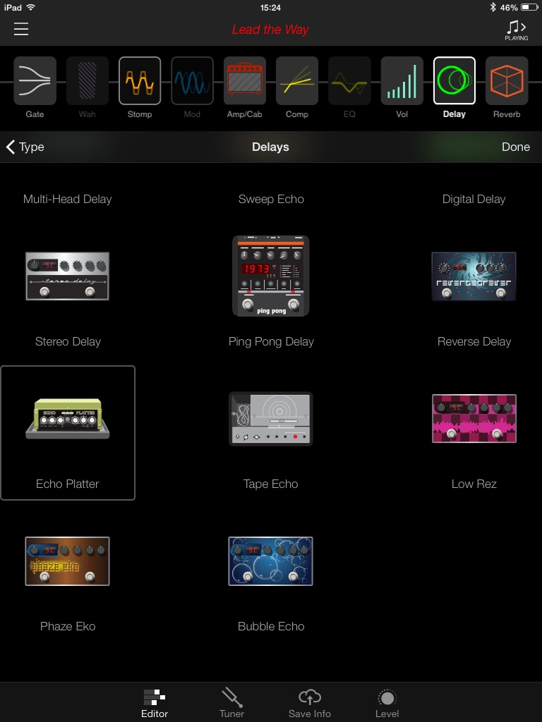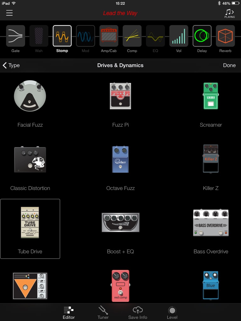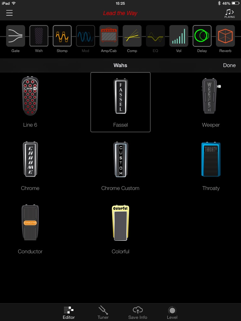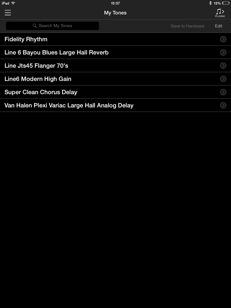 Vous remarquerez que le nom de l’onglet est en anglais. Dans l’iPad gracieusement prêté par Line 6 était installée une version BETA de l’app (avec un tout petit crash). Espérons qu’elle sera traduite dans notre langue et qu’elle gagnera en stabilité, ce dont je ne doute pas, connaissant le sérieux de la marque dans ce domaine. J’ai aussi remarqué que si l’on bascule de l’AMPLIFi REMOTE à une autre application, la connexion Bluetooth se perd avec l’ampli. Elle revient automatiquement dès qu’on relance l’application.