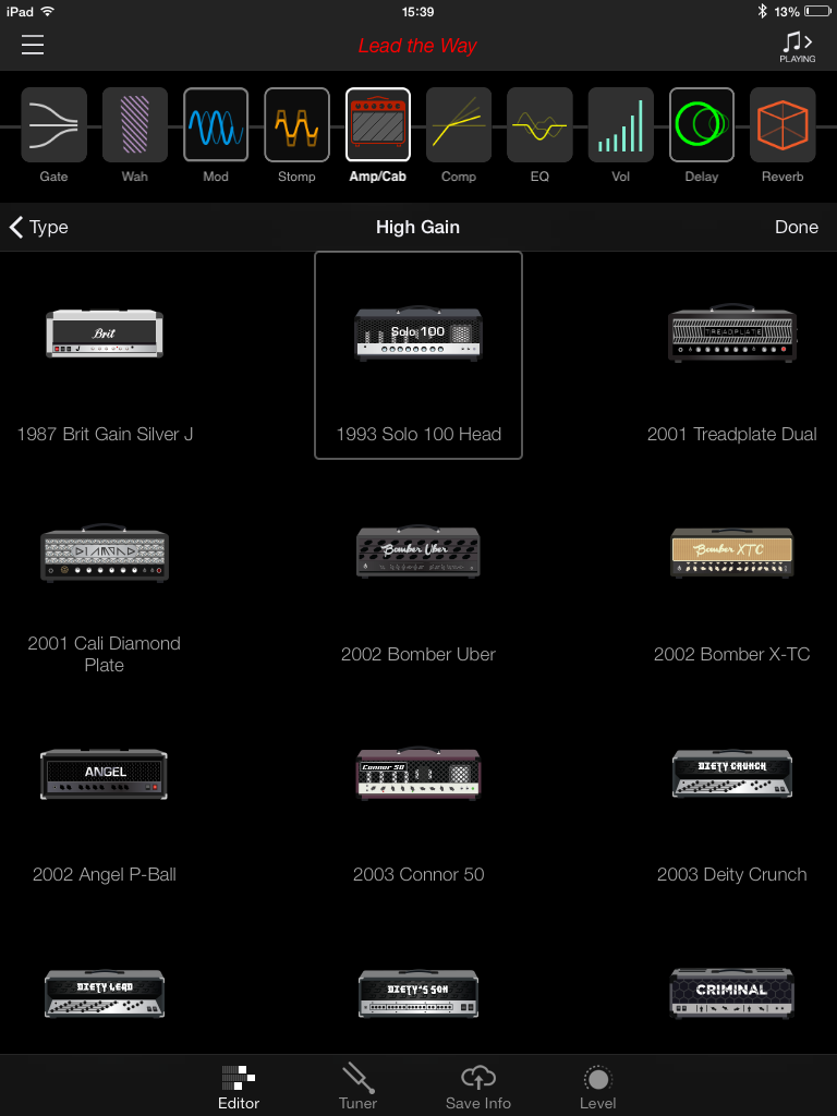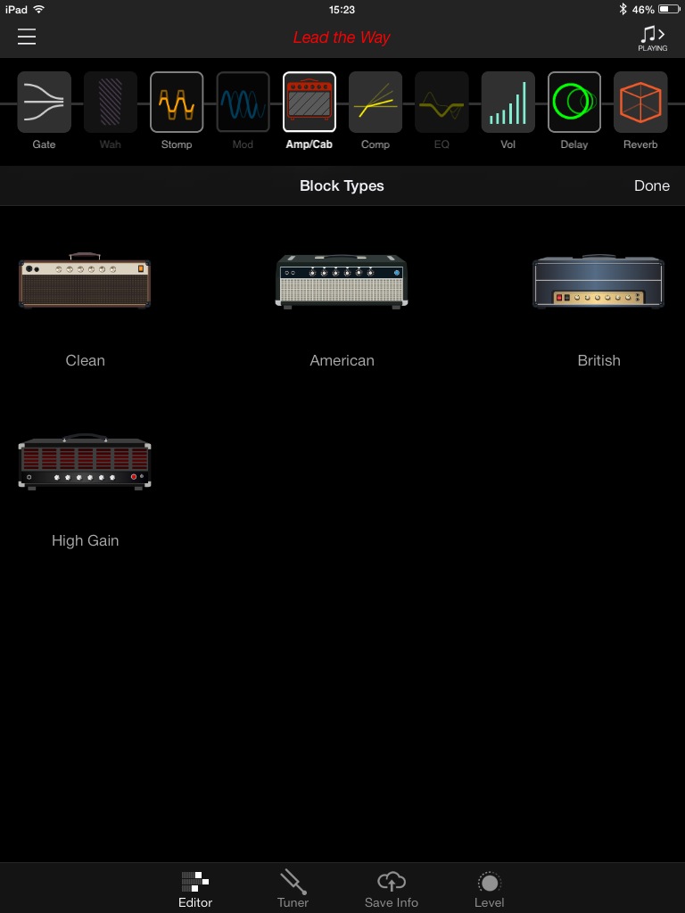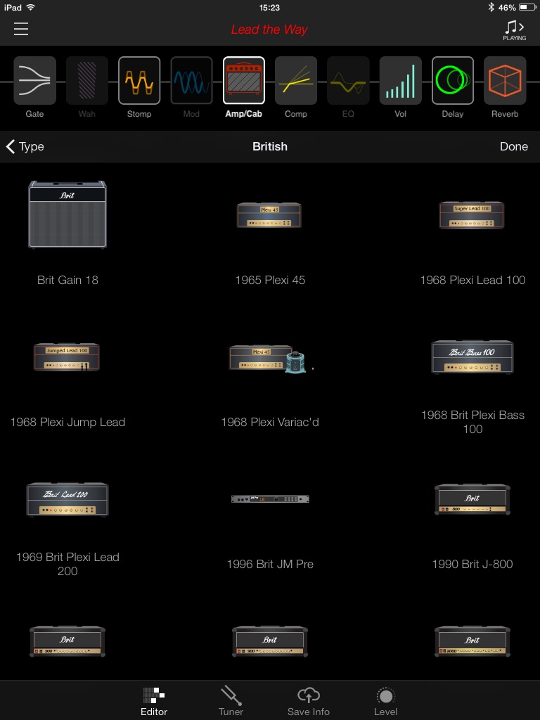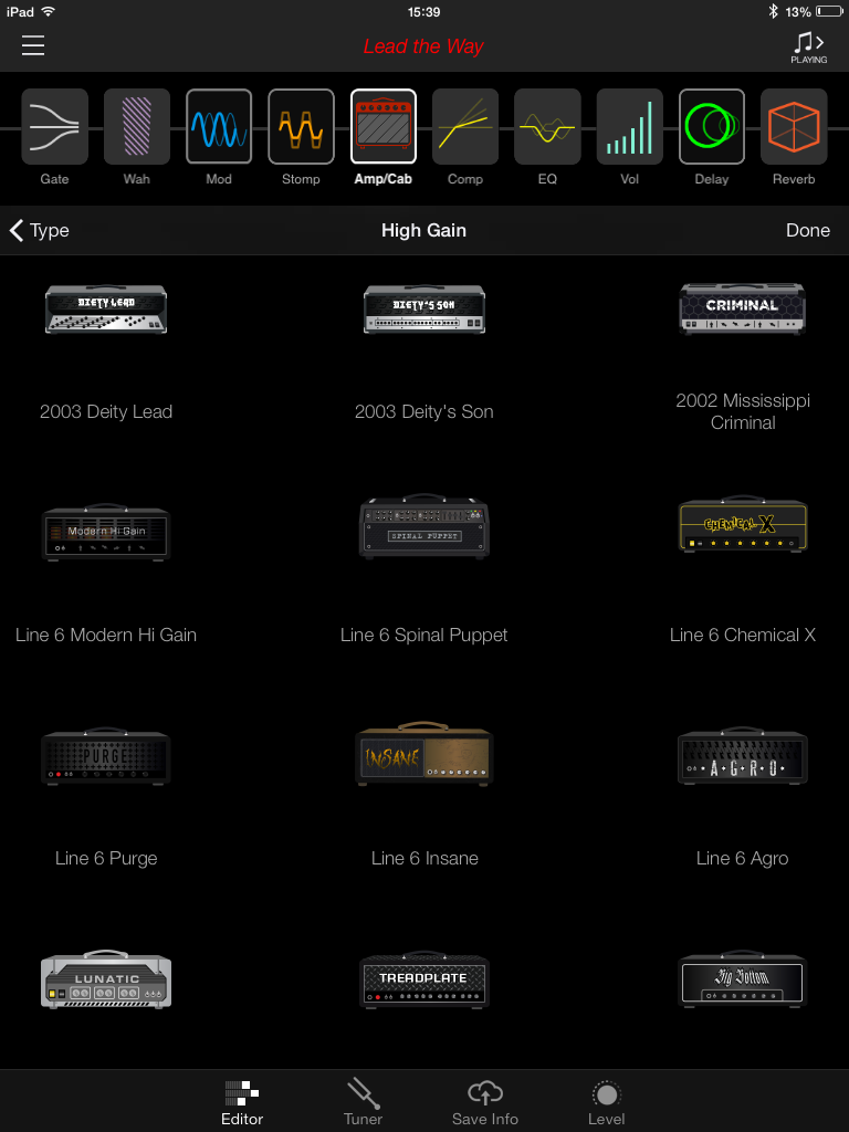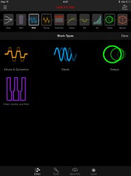 L’interface est agréable et les icônes d’amplis, classés en 4 catégories (CLEAN, AMERICAN, BRITISH, HIGH GAIN), sont clairement identifiables. La firme américaine annonce plus de 200 amplis et effets. Pour les amplis, j’en ai compté 52 différents (vous pouvez consulter leur liste en jetant un coup d’œil aux captures d’écran, ils y sont tous). Changer l’ordre de la chaîne ou passer d’un onglet à l’autre s’effectue sans accroc sauf quand il s’agit de changer d’ampli ou d’effet. Il faut alors appuyer sur une toute petite icône et on s’y reprend souvent plusieurs fois avant de passer à la page désirée. Enfin, tout ça est quand même infiniment plus pratique et ludique que de connecter notre ampli à son ordi ou devoir le paramétrer sur un petit écran LCD.