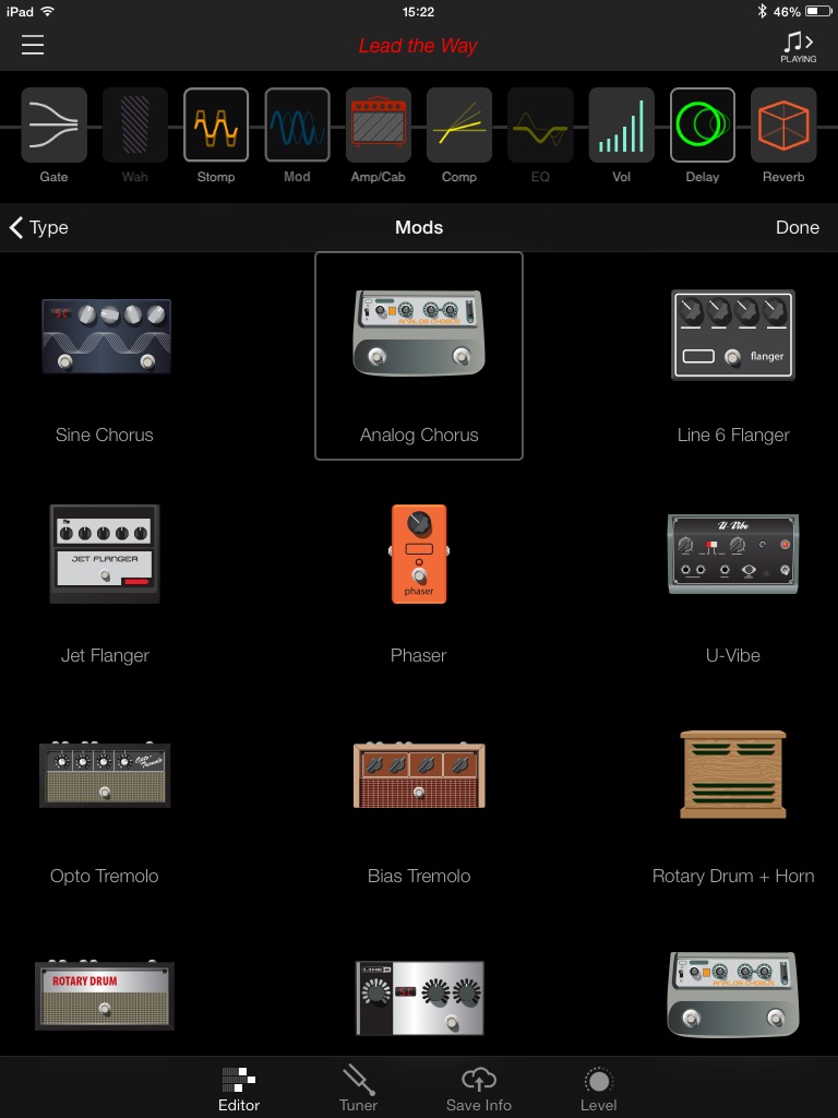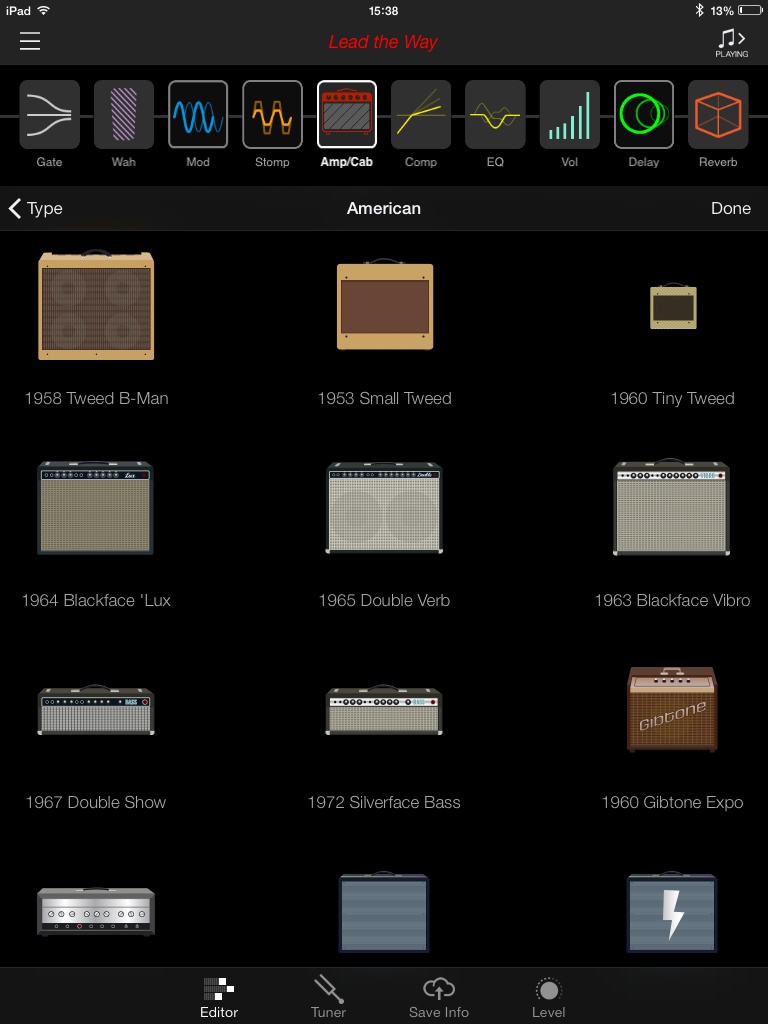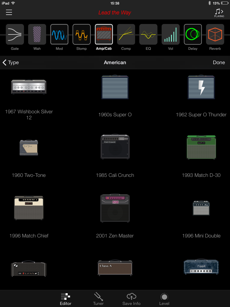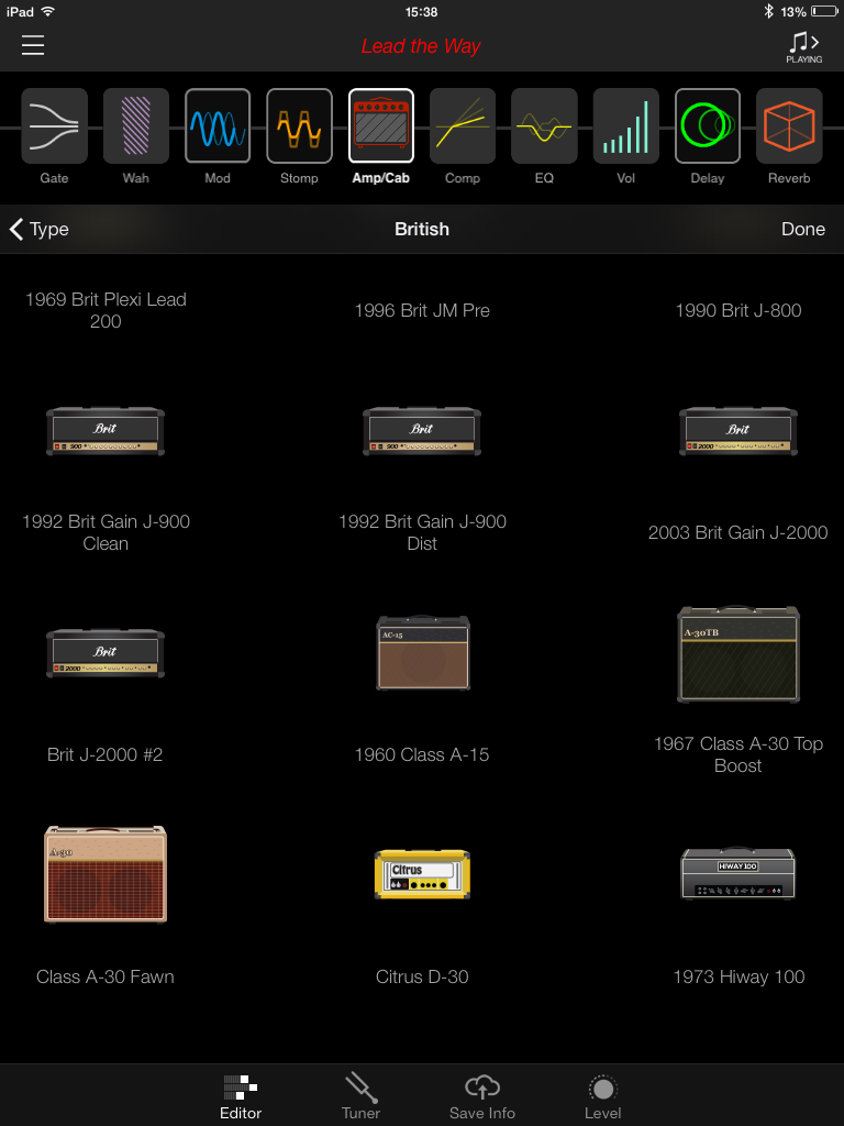 L’interface est agréable et les icônes d’amplis, classés en 4 catégories (CLEAN, AMERICAN, BRITISH, HIGH GAIN), sont clairement identifiables. La firme américaine annonce plus de 200 amplis et effets. Pour les amplis, j’en ai compté 52 différents (vous pouvez consulter leur liste en jetant un coup d’œil aux captures d’écran, ils y sont tous). Changer l’ordre de la chaîne ou passer d’un onglet à l’autre s’effectue sans accroc sauf quand il s’agit de changer d’ampli ou d’effet. Il faut alors appuyer sur une toute petite icône et on s’y reprend souvent plusieurs fois avant de passer à la page désirée. Enfin, tout ça est quand même infiniment plus pratique et ludique que de connecter notre ampli à son ordi ou devoir le paramétrer sur un petit écran LCD.
