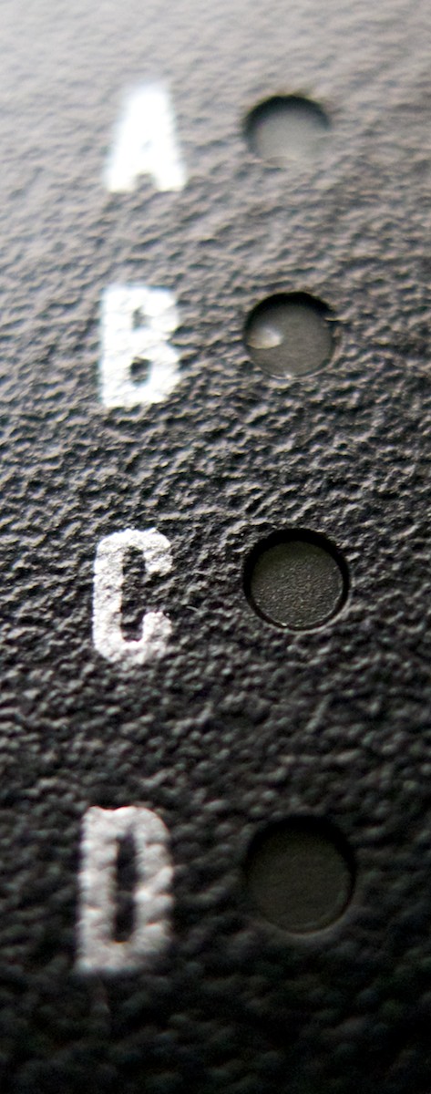 L’entrée jack se trouve à la gauche des potards alors qu’à leur droite, un peu plus haut, se situent 4 leds désignées A,B,C, D représentant chacune un son. Juste à côté, deux boutons, TONE qui permet de sélectionner l’un des quatre présets et TAP qui, comme son nom l’indique, fait office de tap tempo pour les effets.