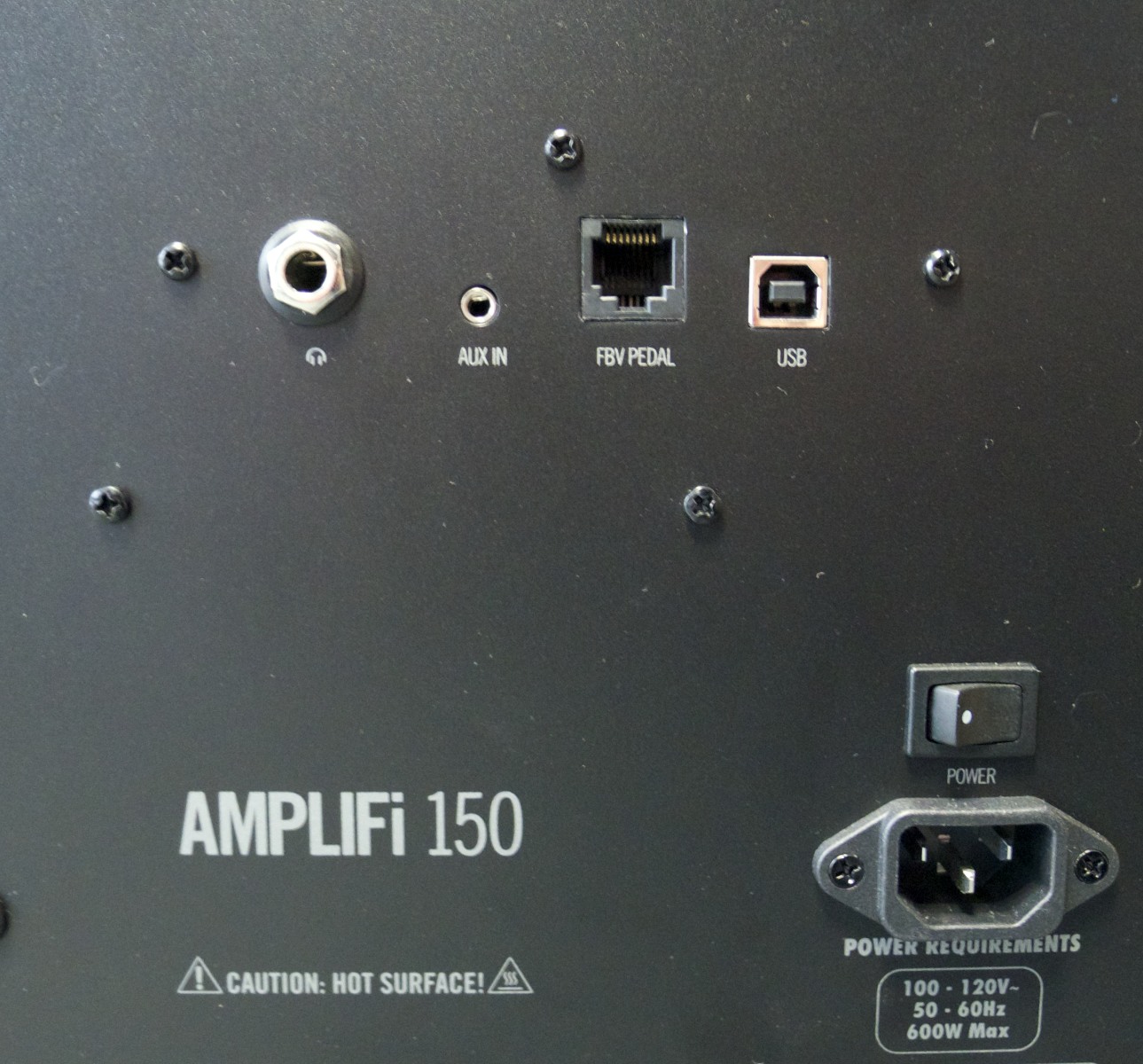 Derrière, de gauche à droite, une prise casque, la prise AUX IN stéréo mentionnée précédemment, une prise pour pédale FBV (vendue séparément, grrr) afin de contrôler les présets aux pieds, et une prise USB (« pour une utilisation future » d’après le guide de pilotage…Mystère…). En dessous nous trouverons la prise pour le câble d’alimentation et le bouton POWER pour allumer notre AMPLIFi. Il est temps d’appuyer dessus et vérifier comment tout cela fonctionne.