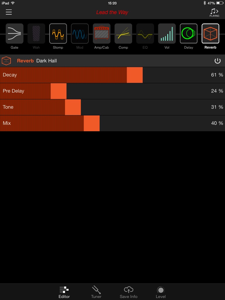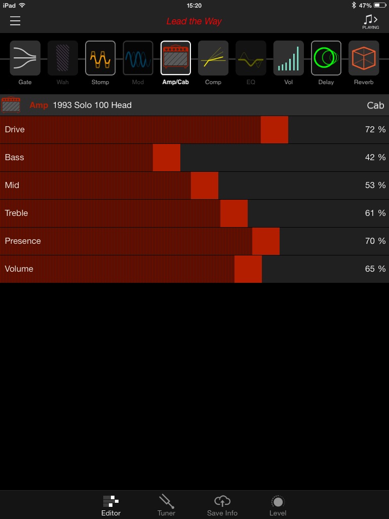 Quand on change un paramètre directement sur l’ampli (et on le fait souvent malgré l’iPad sur nos genoux, par réflexe), le changement sera effectif, mais ne sera pas indiqué sur l’application, on ne pourra pas savoir dans quelle mesure nous avons augmenté le DRIVE, par exemple.