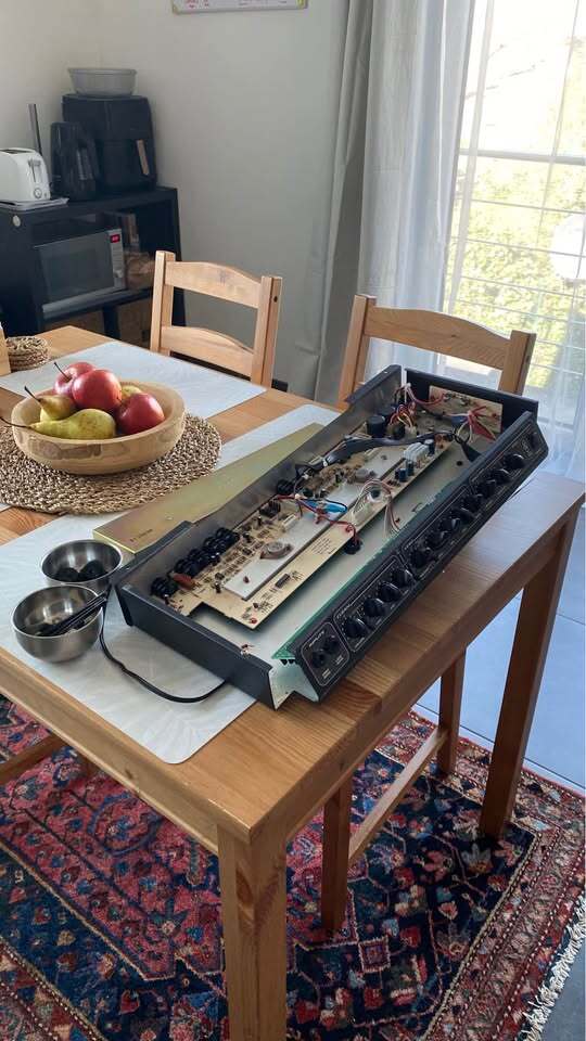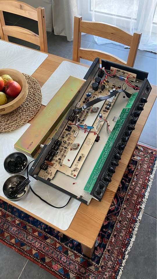 L’amplificateur à été entièrement révisé par mes soins, je suis électronicien de métier. Puissance de 80 watts, peux monter jusqu’à 100 watts avec un haut-parleur externe de 8 Ohms, il est aussi bien à l’aise à la maison qu’en salle de répétition !