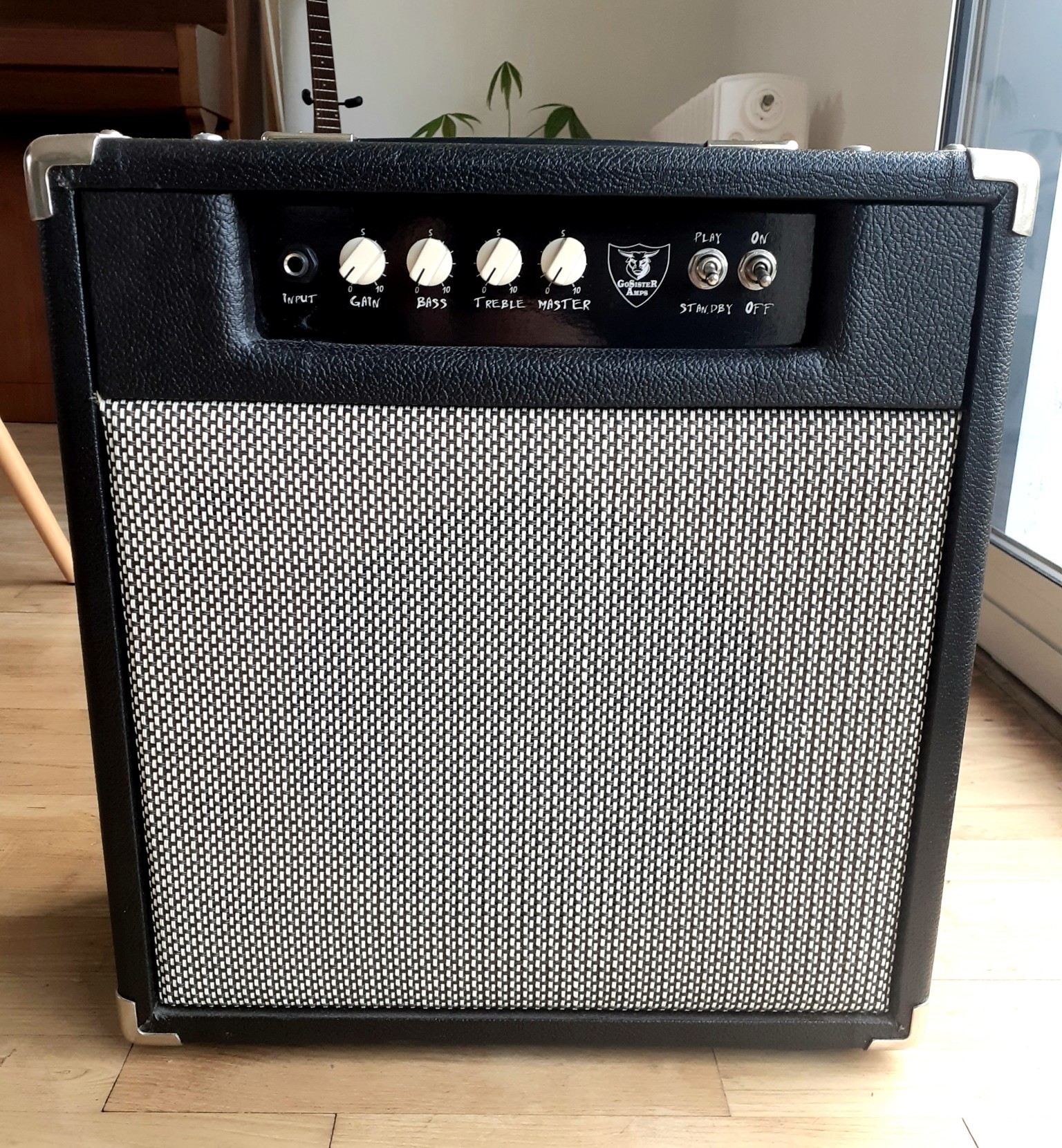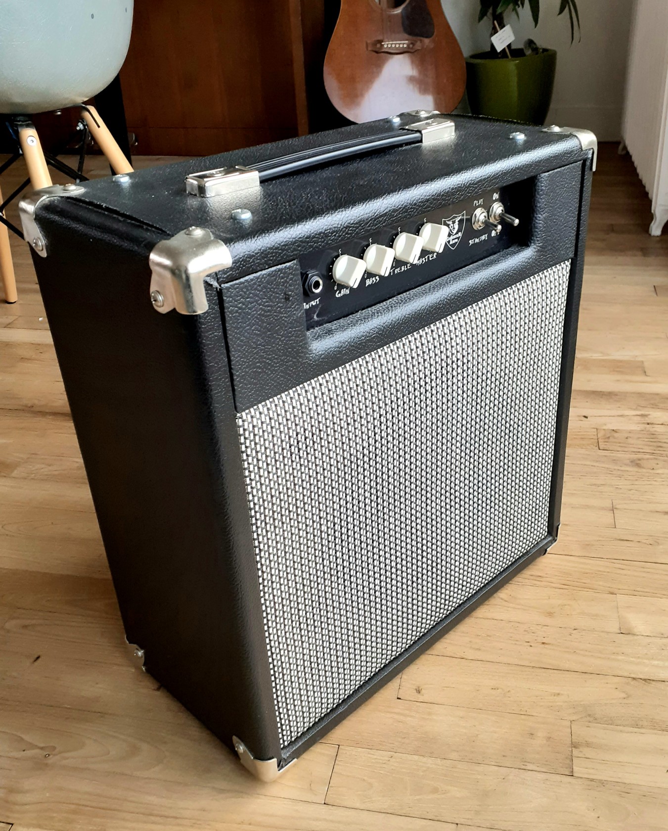 This is a small, practice combo amp. It is only 5 watts but it gets surprisingly loud for an amp of its size and wattage. There aren't much in the way of controls, there are simply volume (gain), master volume, and treble and bass knobs. It has one 1/4" input, and it has the ability to be connected to a larger external speaker via a 1/4" speaker cable.