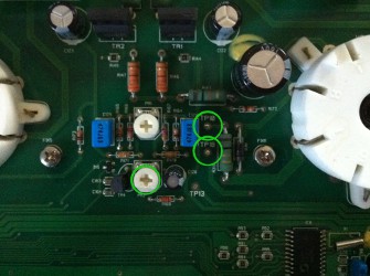 Le bias est une tension qui se mesure avec un voltmètre entre deux « test points » (TP10 et TP18). Le réglage s’effectue en tournant un potentiomètre (PR2) lorsque les lampes sont en fonctionnement.