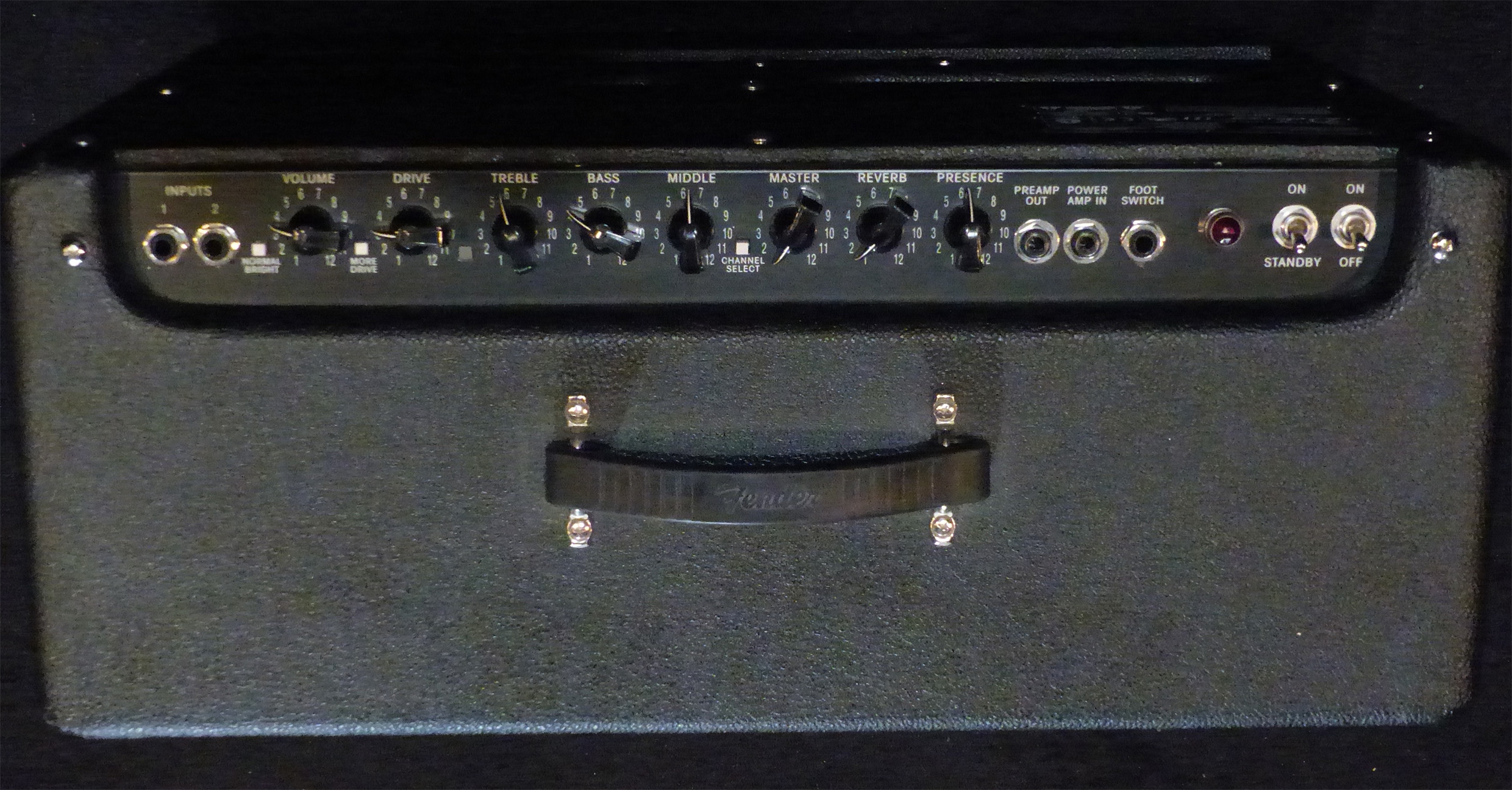 Contrôles canal clean : Presence, reverb, master volume, médiums, graves, aigus