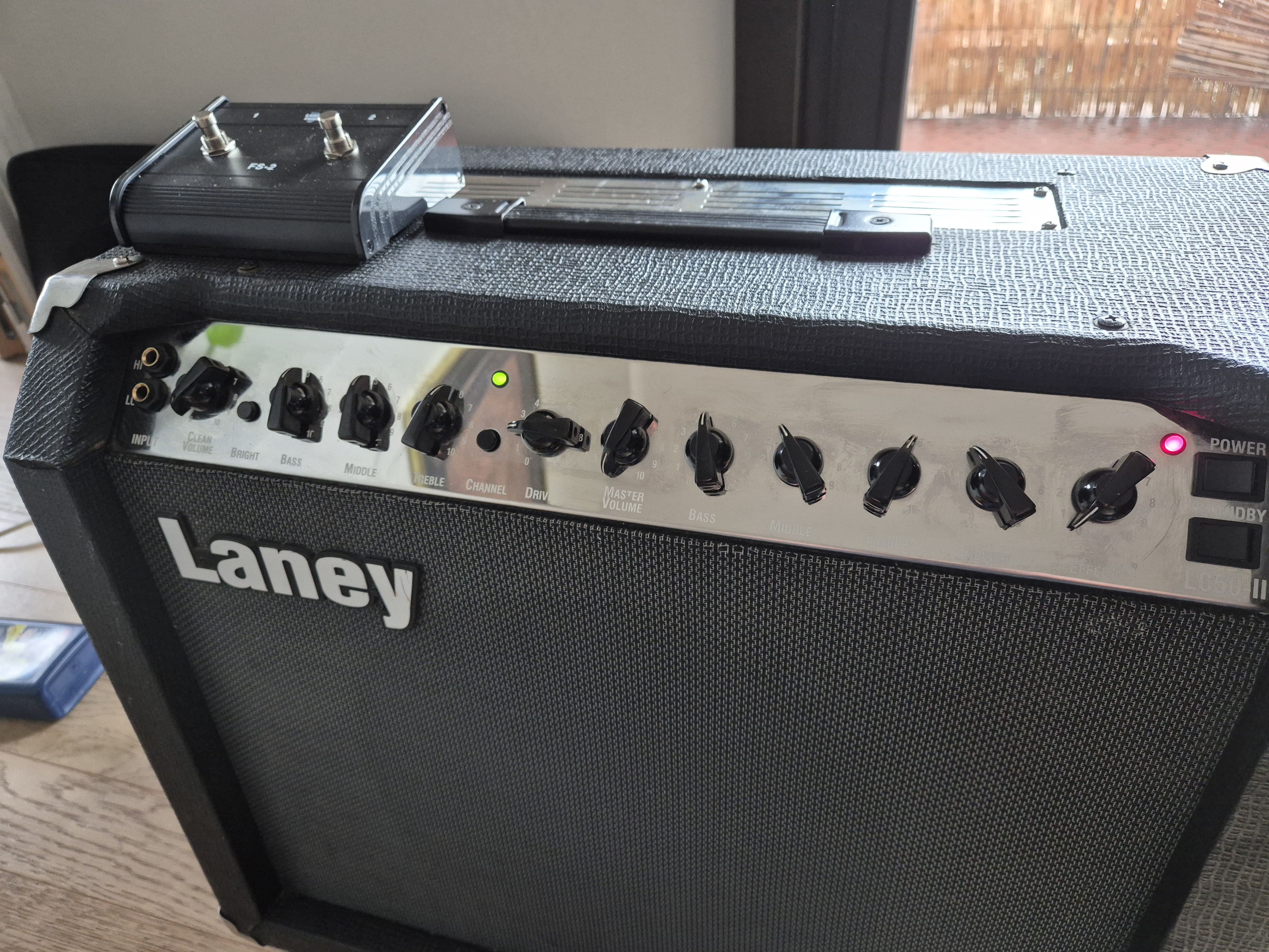 I use a Gibson Les Paul Custom and a small pedalboard consisting of a Fulltone Fulldrive 2, a Line 6 MM4, and a Boss NS-2. The LC50-II has slightly more gain than a Marshall JCM800, but not enough to be considered a “high gain” amplifier. I use the Fulldrive to boost the distortion channel with excellent results. The Laney amps I have played all tend to have a certain “fuzz” on the distortion channel, and the LC50 is no different. It’s not necessarily a bad thing; it’s just the Laney sound. Just listen to Tony Iommi’s guitar tone and you’ll understand what I’m talking about. The clean channel on this combo is amazing. It is VERY loud, VERY clean, and takes pedals well.