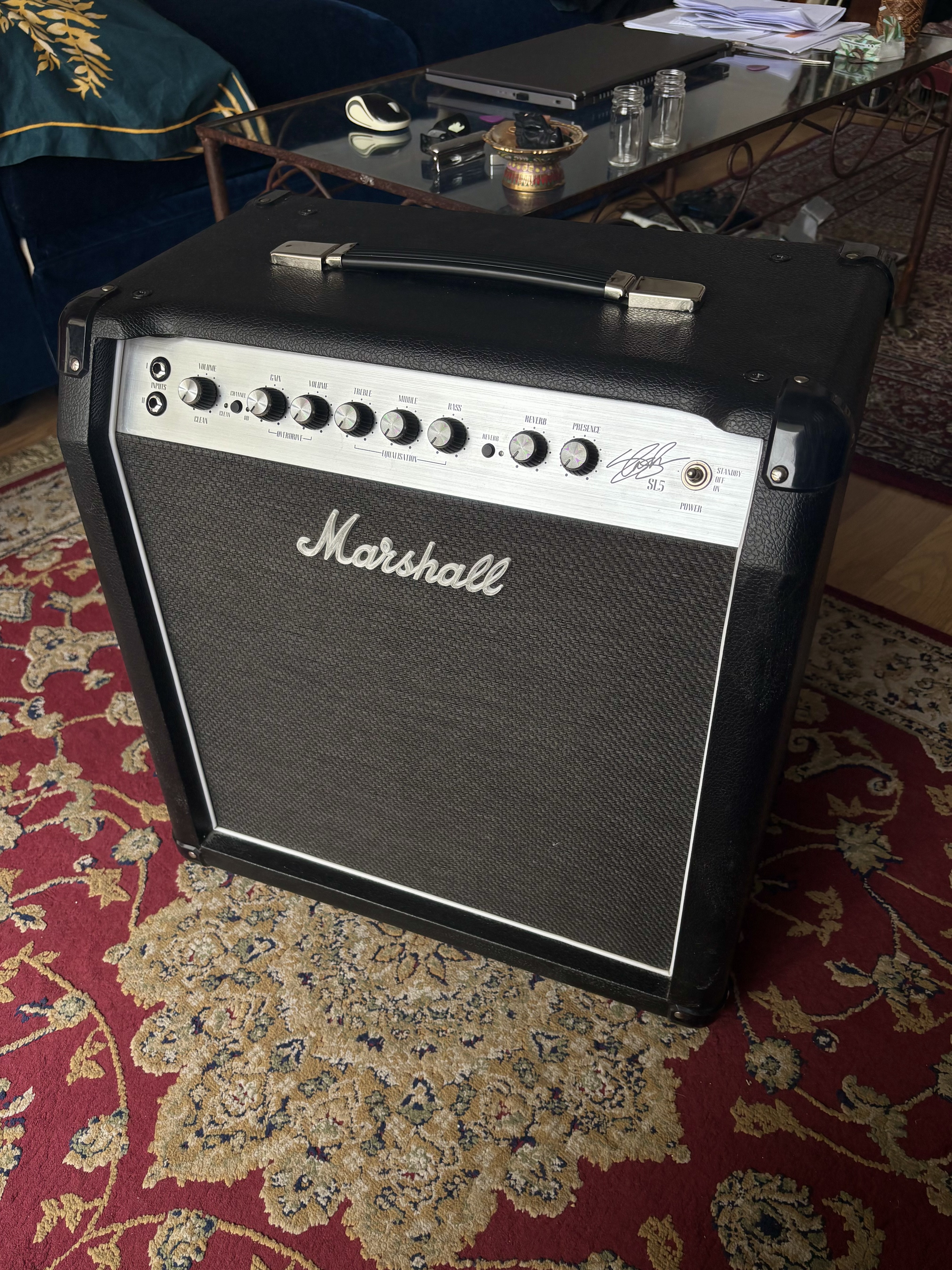 Le SL5 est une signature Slash basée sur l'AFD100. C'est un combo tout lampes 2 canaux de 5W (commutable à 1W) équipé d'un haut-parleur Celestion Vintage 30 de 12 pouces.