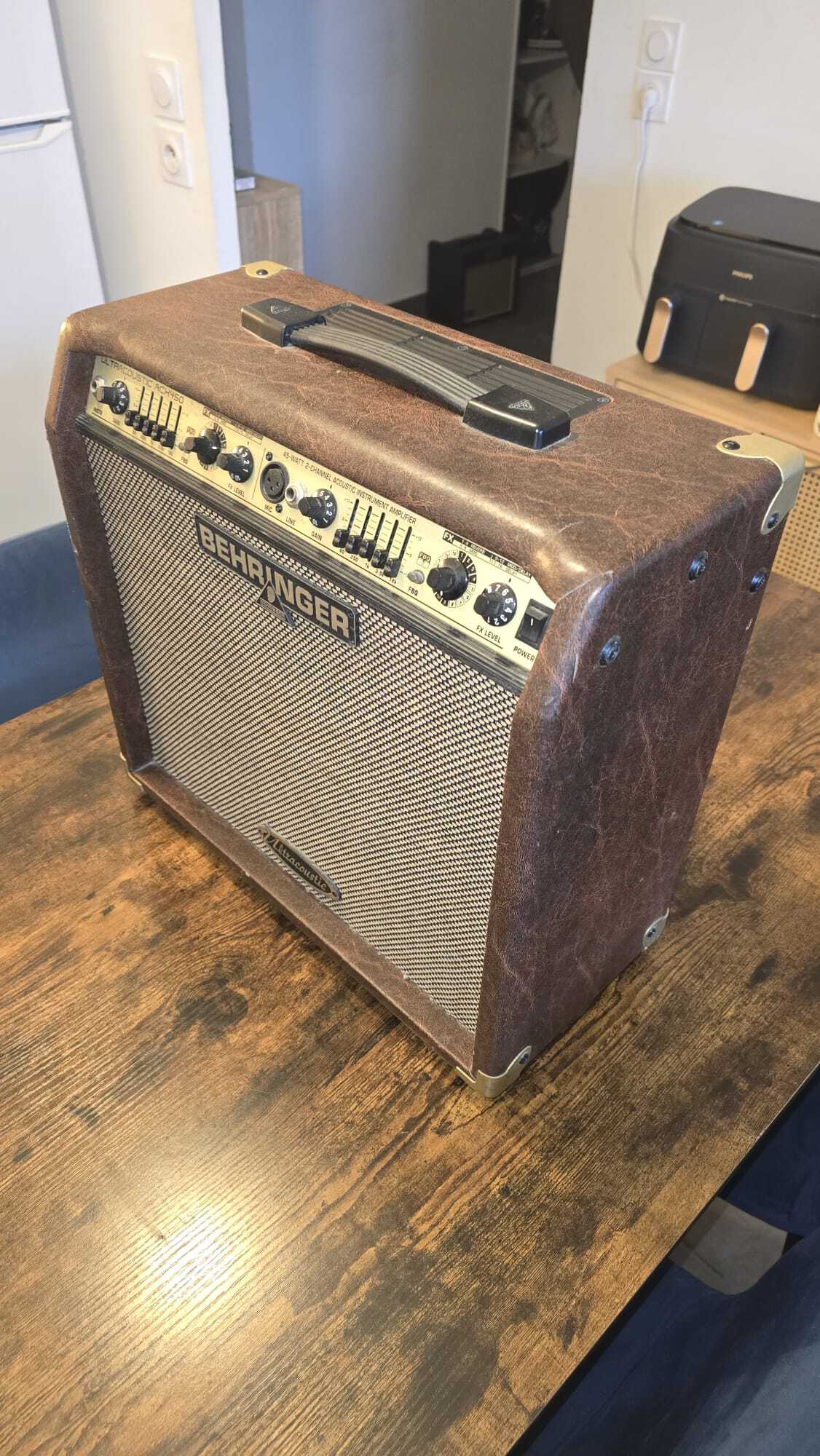 Je vends un Behringer ACX450 en très bon état de fonctionnement.Ampli pratique et polyvalent pour guitare acoustique électro et chant, avec possibilité de brancher deux sources en jack / XLR.