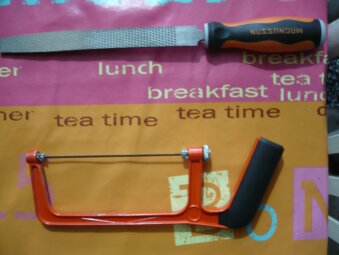 Voici les outils que j'ai utilisé. Rien de spécial, à part que j'ai incliné la lame de ma petite scie à 45 degrés pour pouvoir découper en cercle.