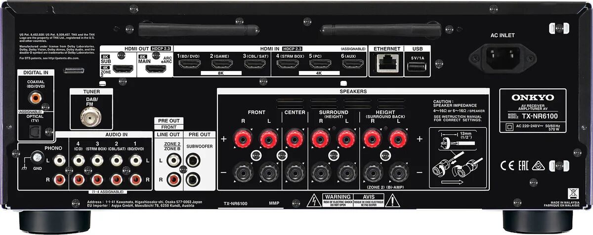 Vends Amplificateur Home Cinema Onkyo TX NR 6100 fonctionnant du stéréo au 5.1 en allant jusqu'au 7.2 ou au 5.2.2 (prend en charge les enceintes d'atmosphère Dolby Atmos) et capable de gérer les sorties vidéos allant jusqu'au 4K 120i/s et au 8K 60i/s via HDMI 2.1.Capable d'envoyer jusqu'à 175W de puissance audio RMS par canaux et certifié THX Select, cet ampli Home Cinema Onkyo prend en charge l'ensemble des standards audio du marché : Dolby Atmos, Dolby Atmos Height Virtualize,DTS:X, DTS Neural:X, DTS Virtual:X, Dolby TrueHD, DTS-HD Master Audio mais aussi le MP3, le FLAC, l'ALAC et le DSD.