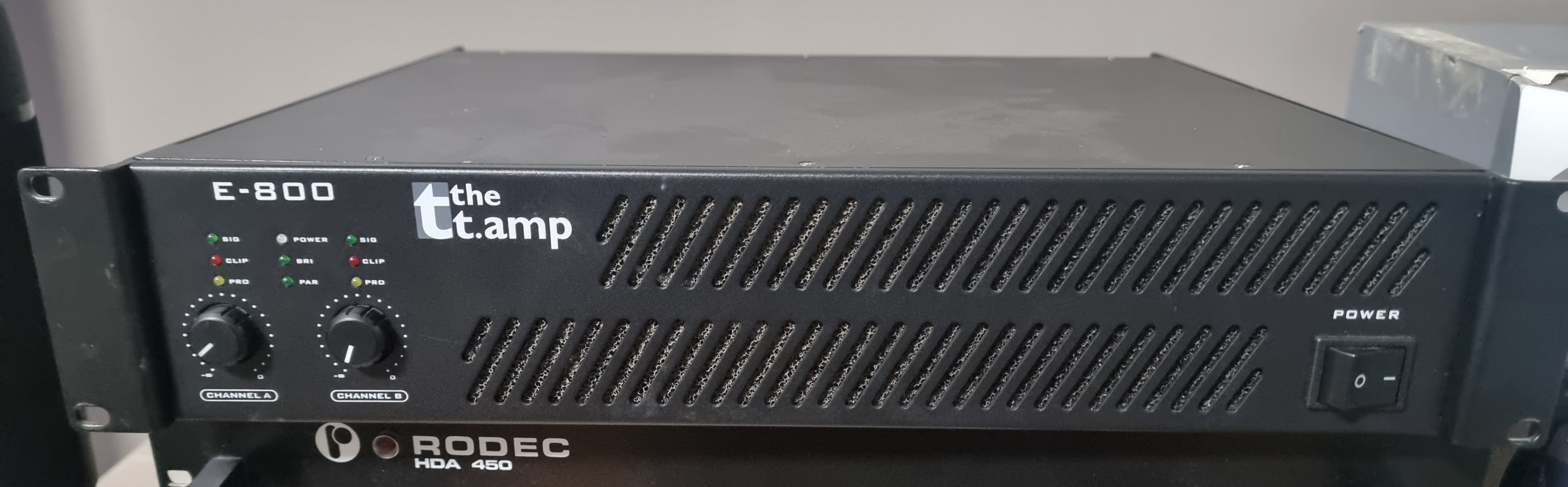 the t.amp E-800 stereo amplifier - output power: 2x 440W into 4 Ohms, 2x 240W into 8 ohms (@1kHz, THD<=0.1%). Bridged mode: 1x 800W into 8 Ohms (please check cable configuration for bridged on rear of unit). Frequency response: 10Hz-20kHz; damping factor: >120; inputs: XLR and TRS jack (balanced); outputs: Speakon; DC, short circuit, temperature and limiter protection. Power Supply: 230V~50Hz. 19"/2U rack. Dimensions (WxDxH): 482 x 341.5 x 88mm, 19", 2U