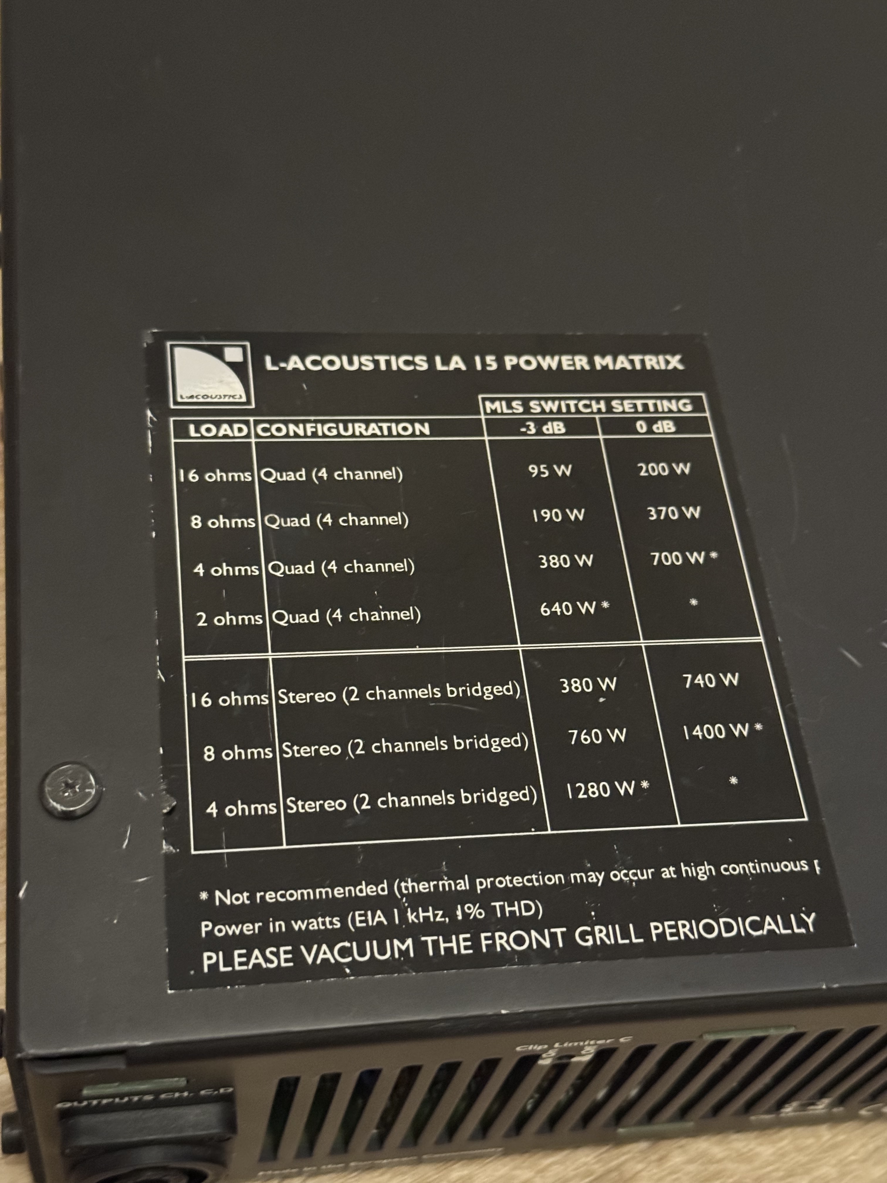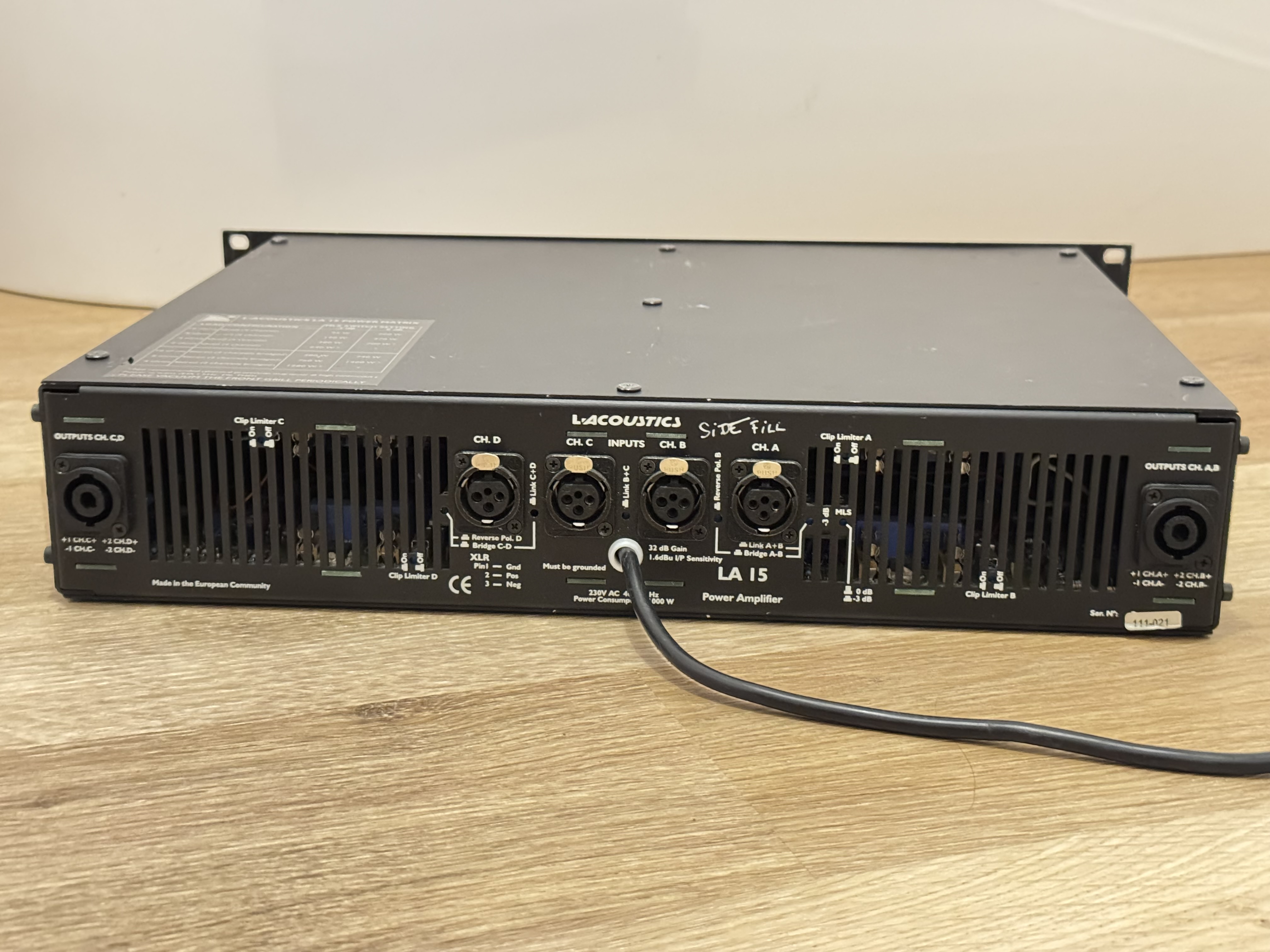 Bonjour Je me sépare de cet ampli L-Acoustics LA15, qui est en fait un Lab Gruppen 1200c rebadgé L-Acoustics. Bon état, marche fort. Utilisé jusqu’à present sur un kit Nexo. Je le vend cause changement de config. Jusqu’à 4x700W @4ohms, ou 2x1400W @8ohms en bridge. Seul défaut à signaler: le capuchon de potar d’attenuateur numéro 4 est rayé. N’empêche pas le fonctionnement normal… À noter quelques rayures cosmétiques sur le châssis… rien de méchant. Pas de paiement via Leboncoin. Remise en main propre préférée (je n’ai pas le carton d’origine), dans l’Ain ou en Suisse romande. Mais un envoi reste possible.