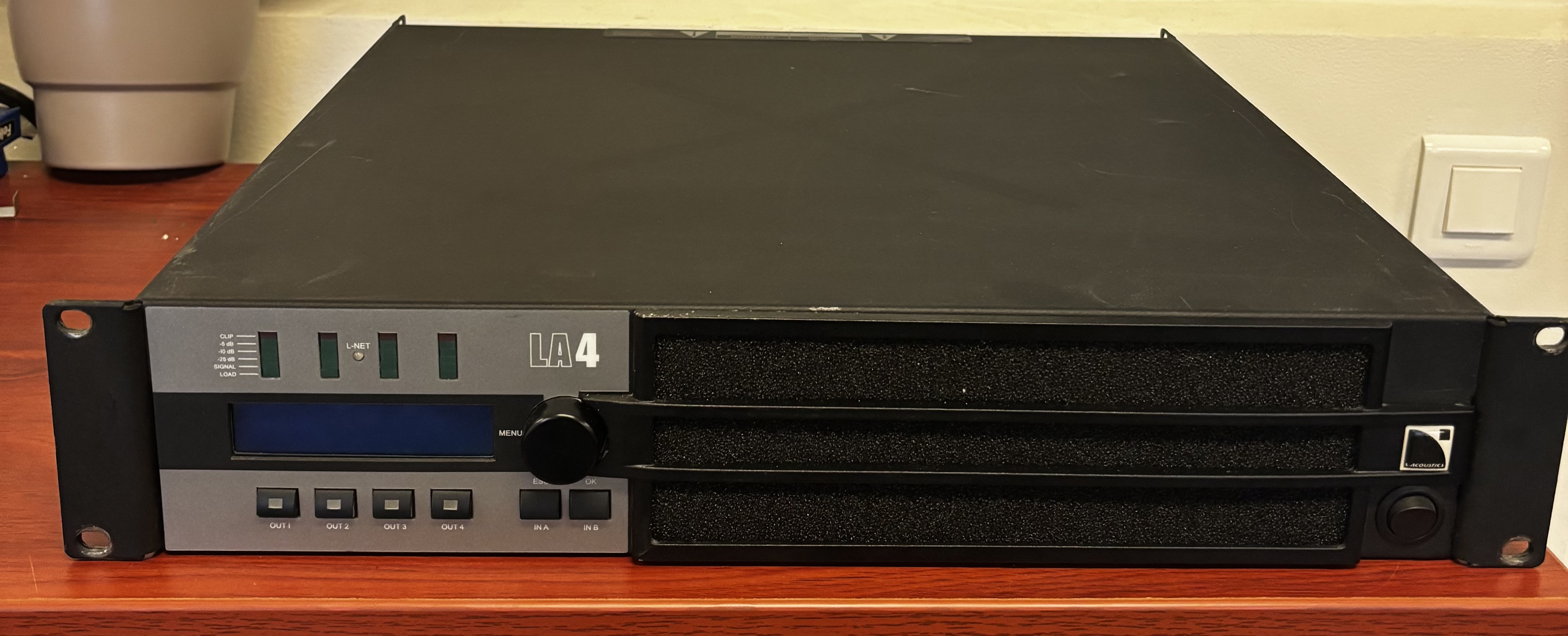 Le contrôleur amplifié LA4 appartient à la génération des contrôleurs intégrés haut de gamme totalement dédiés au pilotage des systèmes d’enceintes L-ACOUSTICS®. Le LA4 regroupe dans un format 2U les ressources d’un DSP 2 x 4 pilotant quatre canaux d’amplification délivrant jusqu’à 1000 watts chacun, une librairie de presets usine complète, une interface utilisateur intuitive, deux ports de connexion Ethernet pour pilotage en réseau, un panneau de connexion pour les entrées audio et les sorties haut-parleurs, et un emplacement pour carte d’entrée AES/EBU optionnelle.