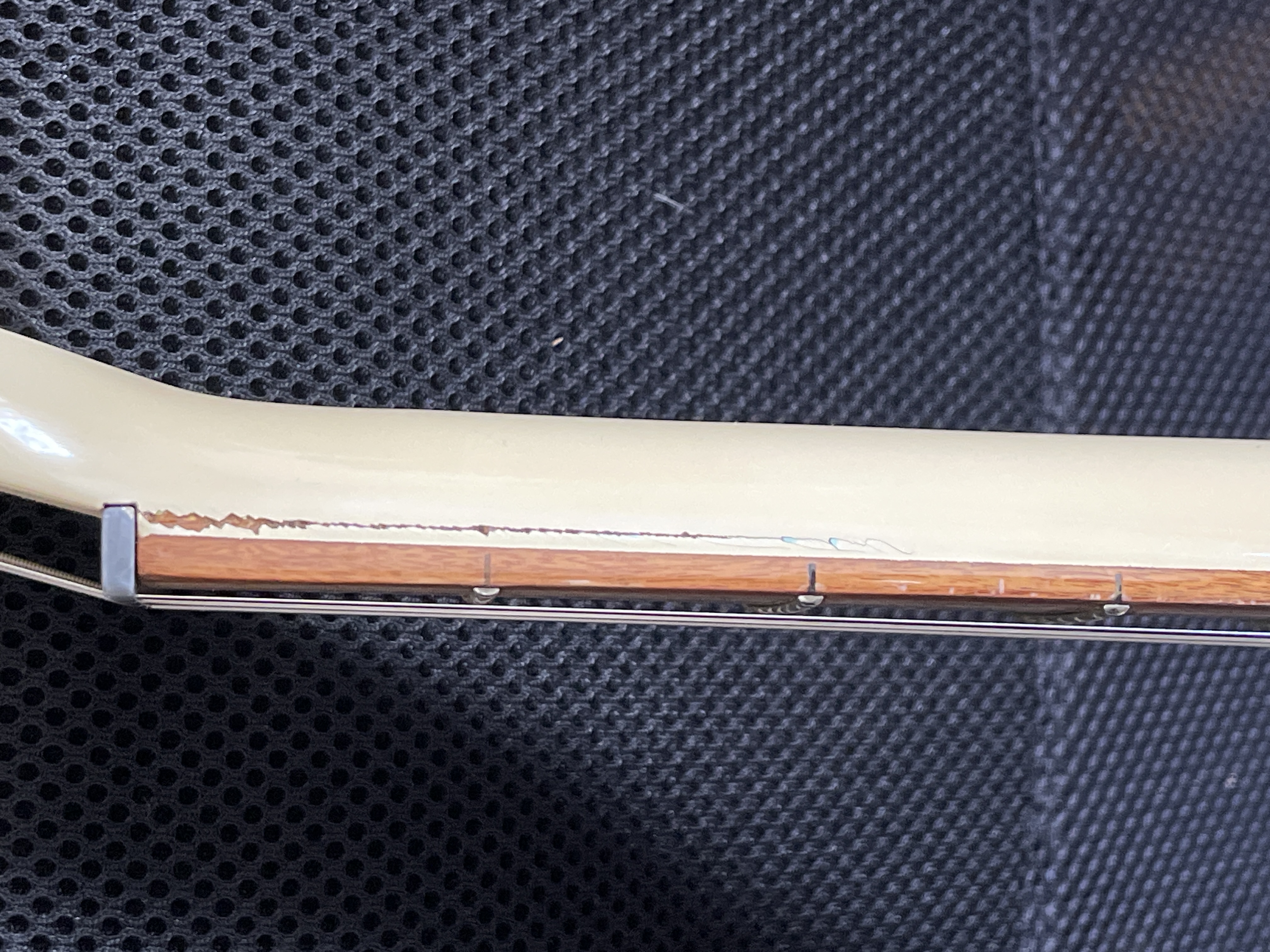 Elle est à ce prix car elle a sûrement subit un choc sur la tête. Le résultat est que la peinture est fendu à la jonction manche touche sur 3 cases mais pour avoir testé s’il y avait un décollage de la touche, elle ne bouge pas du tout.