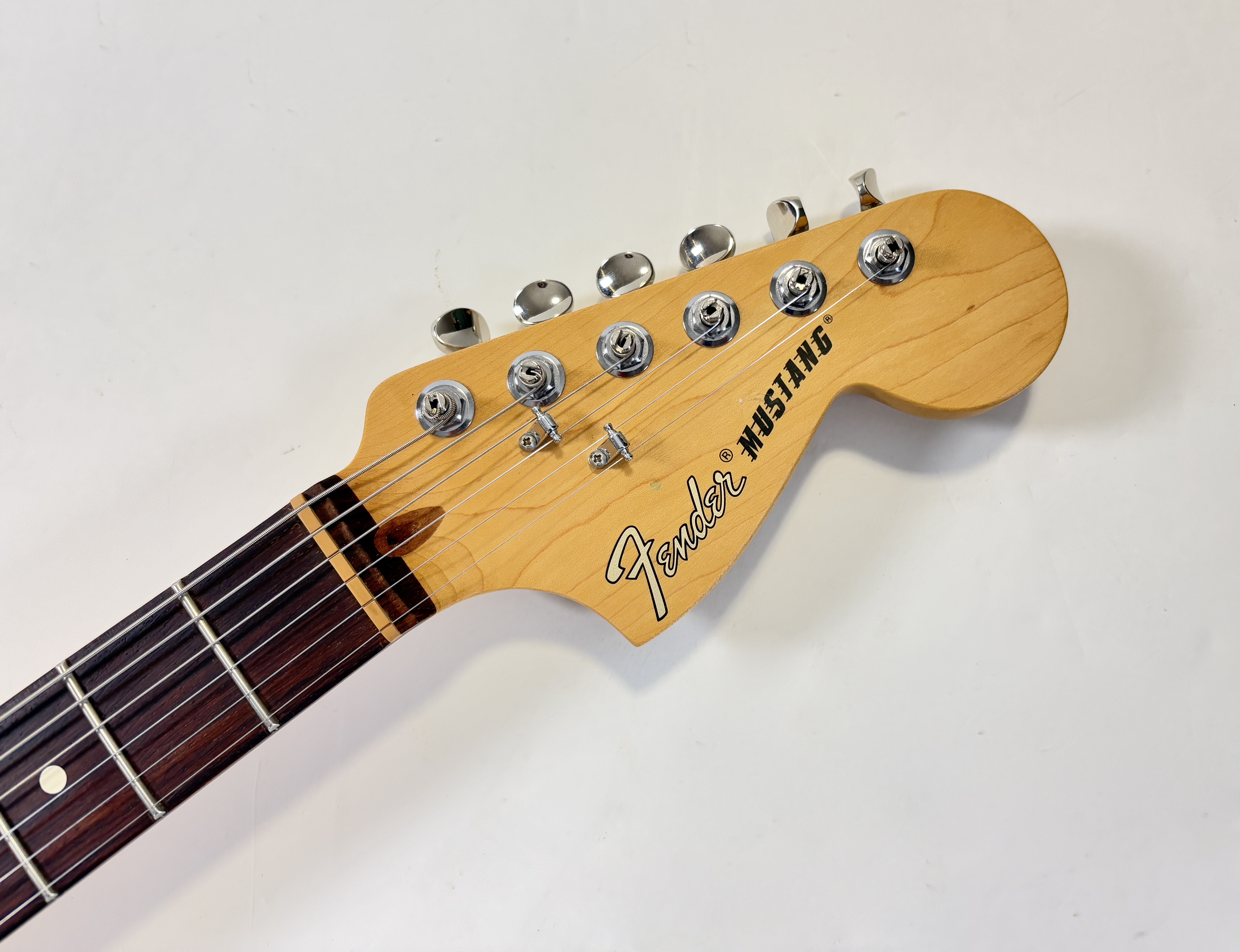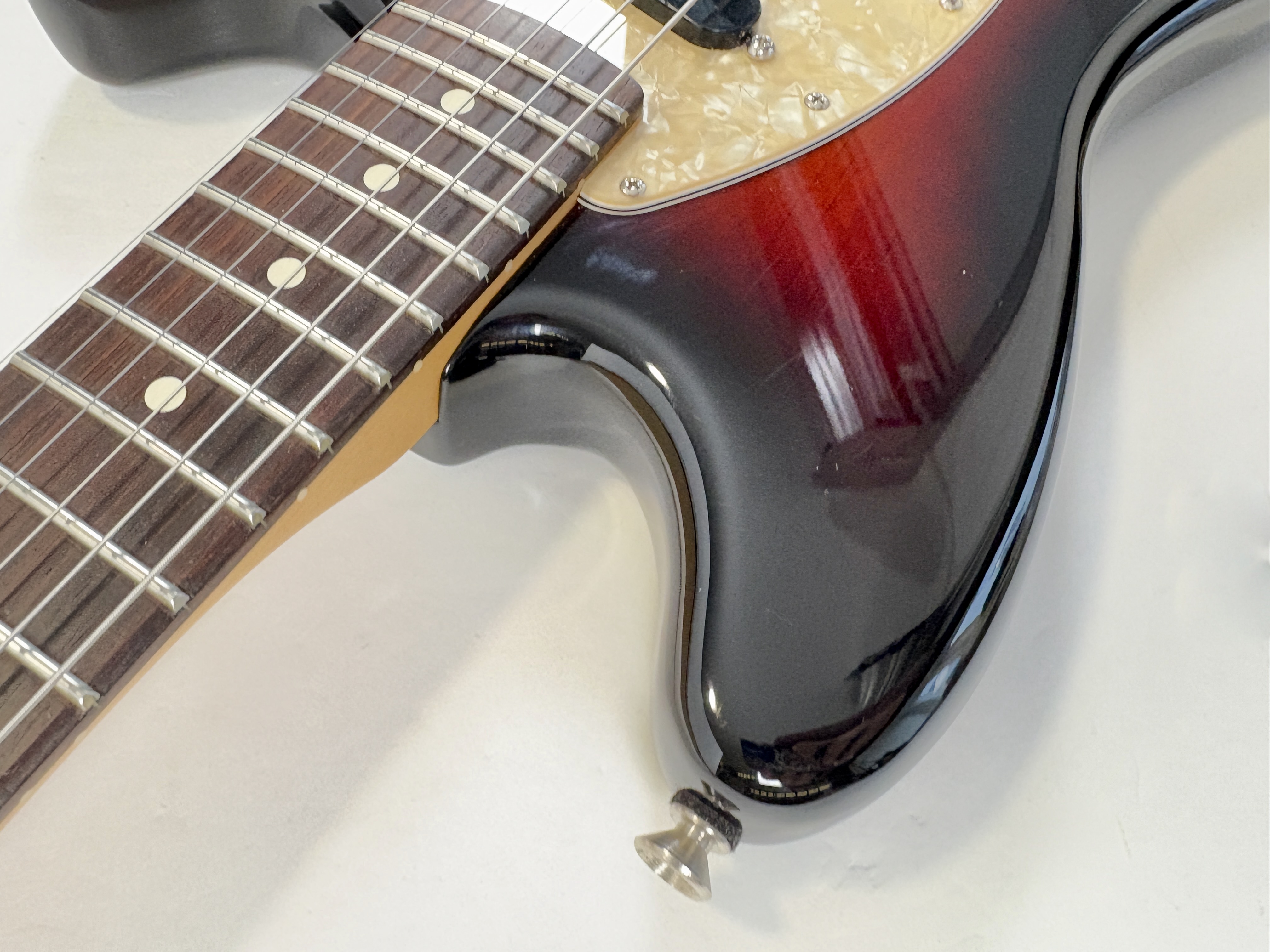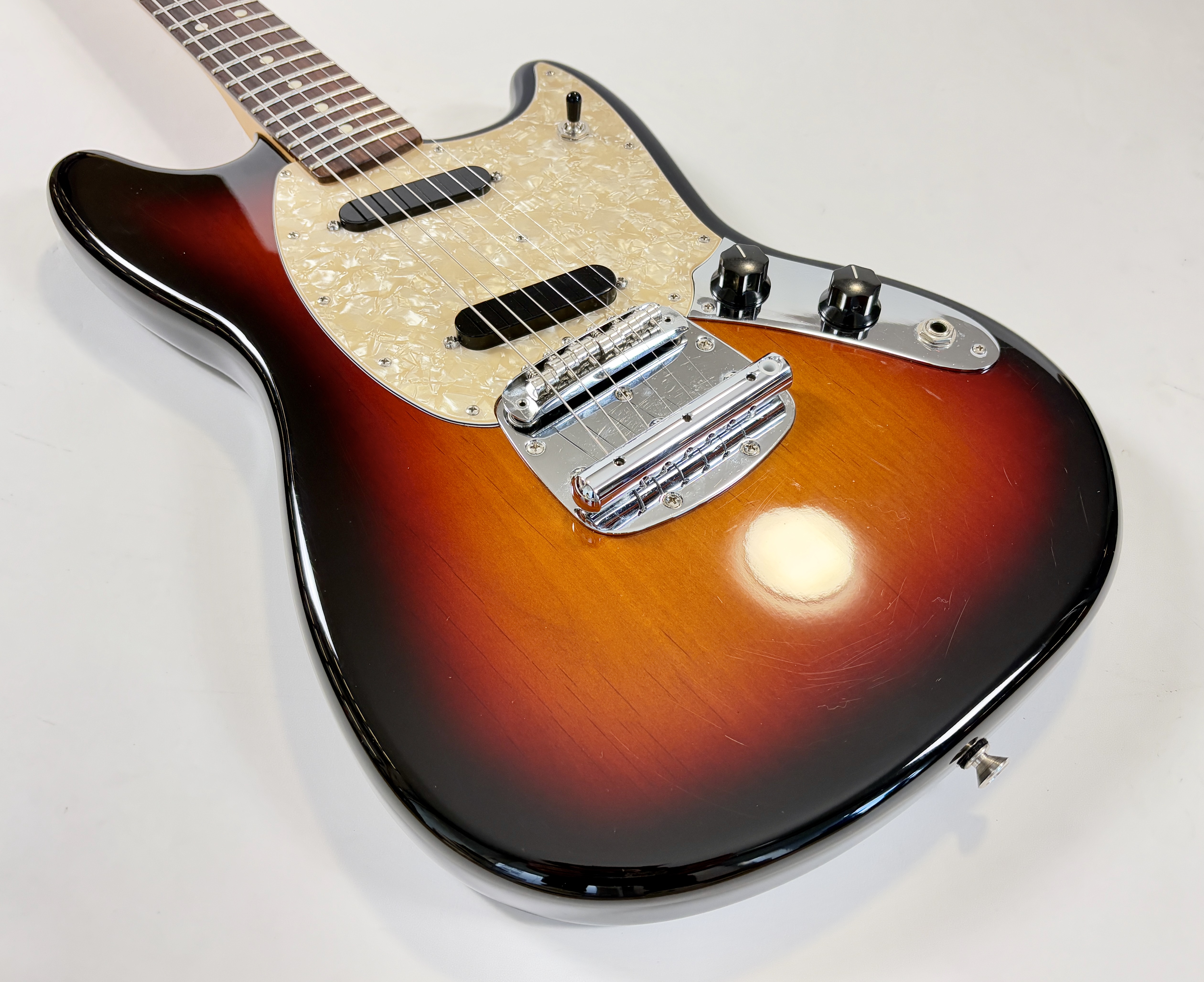 En 1956 apparaissent chez Fender deux guitares destinées aux débutants et aux moins fortunés : la Musicmaster et la Duo-Sonic. En 1964 c’est la Mustang qui entre en scène, sa principale différence avec la Duo est l’ajout d’un vibrato. Voici sa version modernisée : l’American Performer ! L’électronique a ici été simplifiée en revanche la lutherie reste classique : diapason de 24 pouces, corps en aulne, manche en érable profil modern C et touche palissandre au radius de 9,5 pouces. Les micros sont de la série Yosemite. En très bon état.Dépôt-vente, achat, vente, reprise, location.