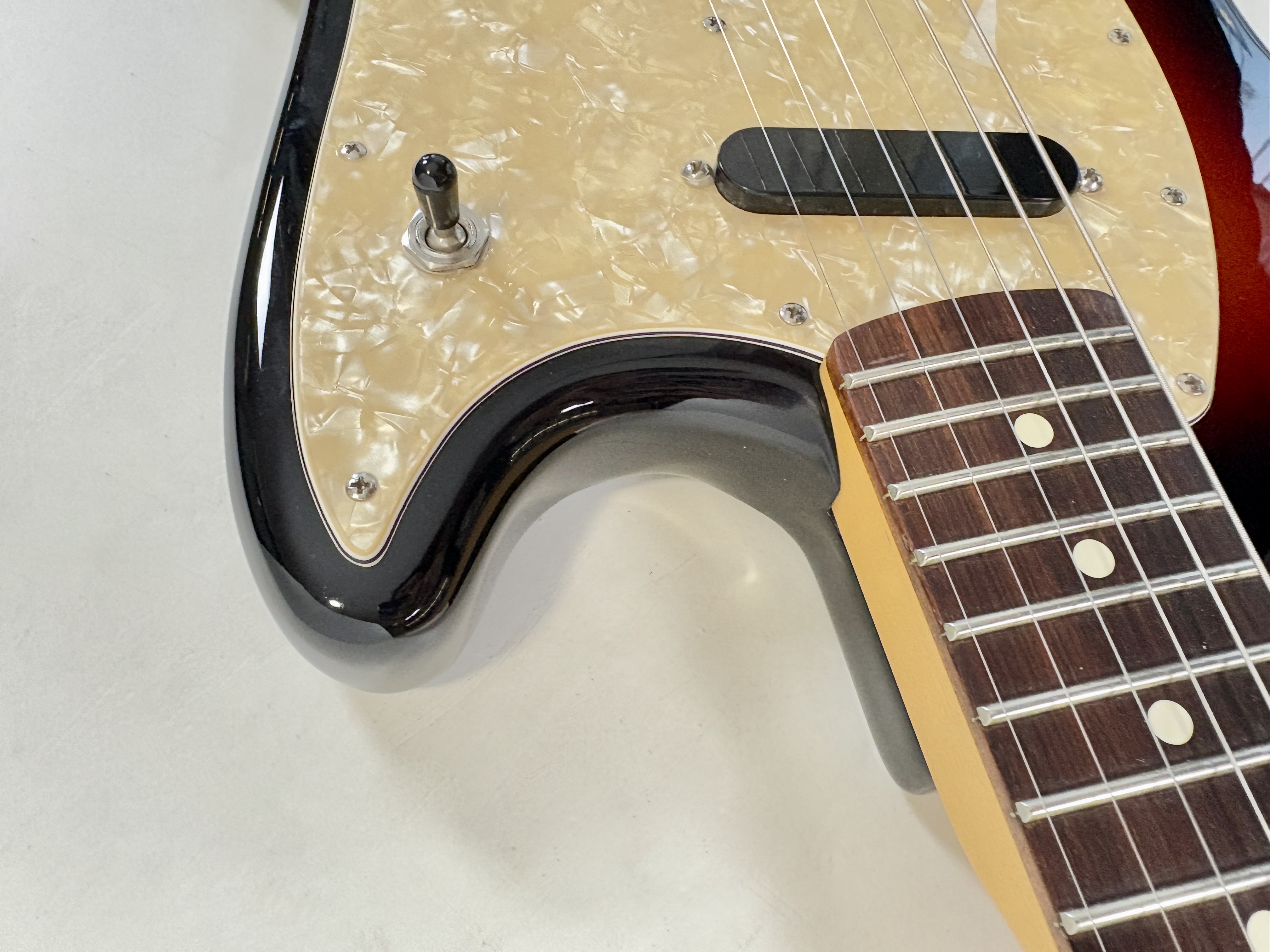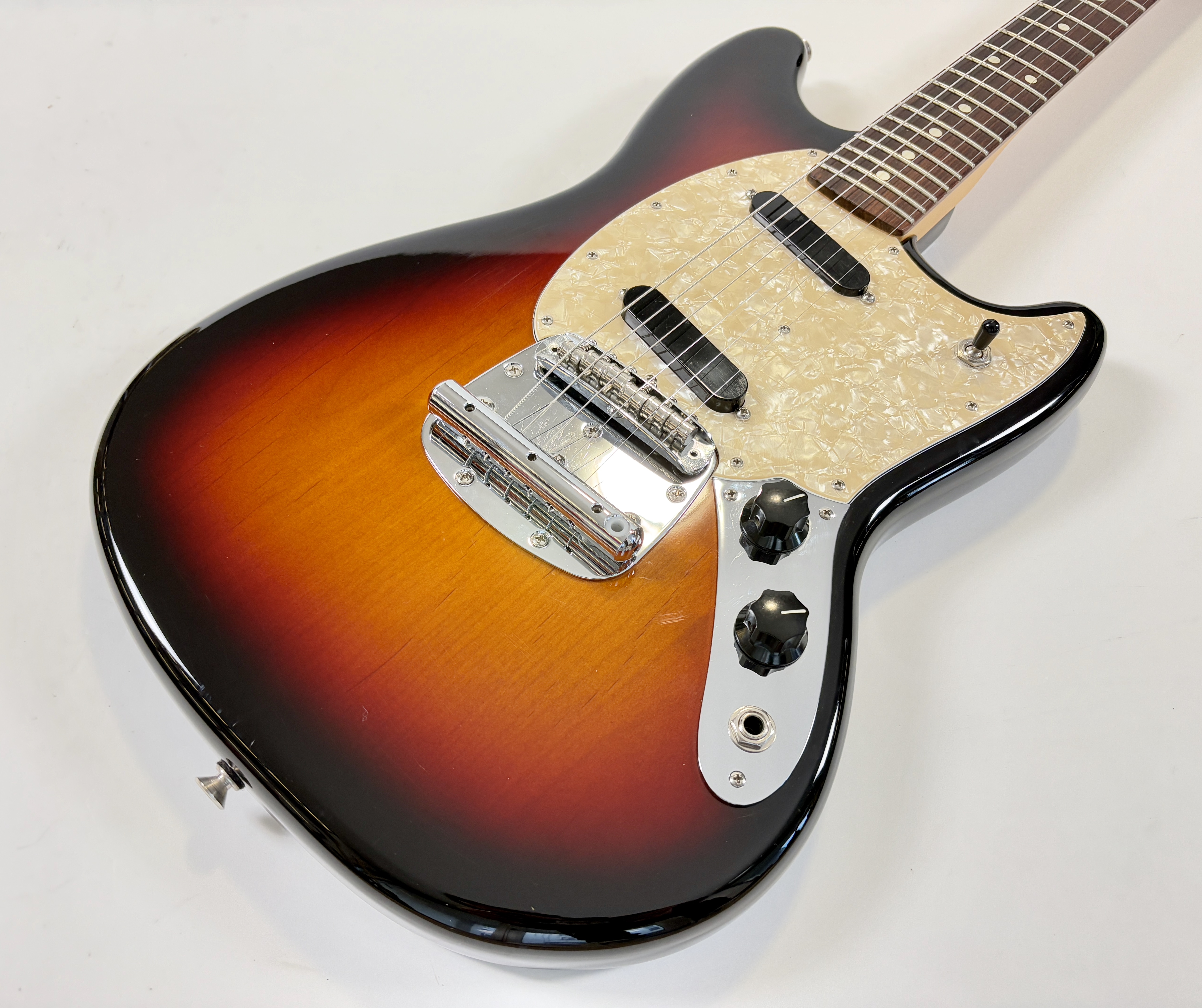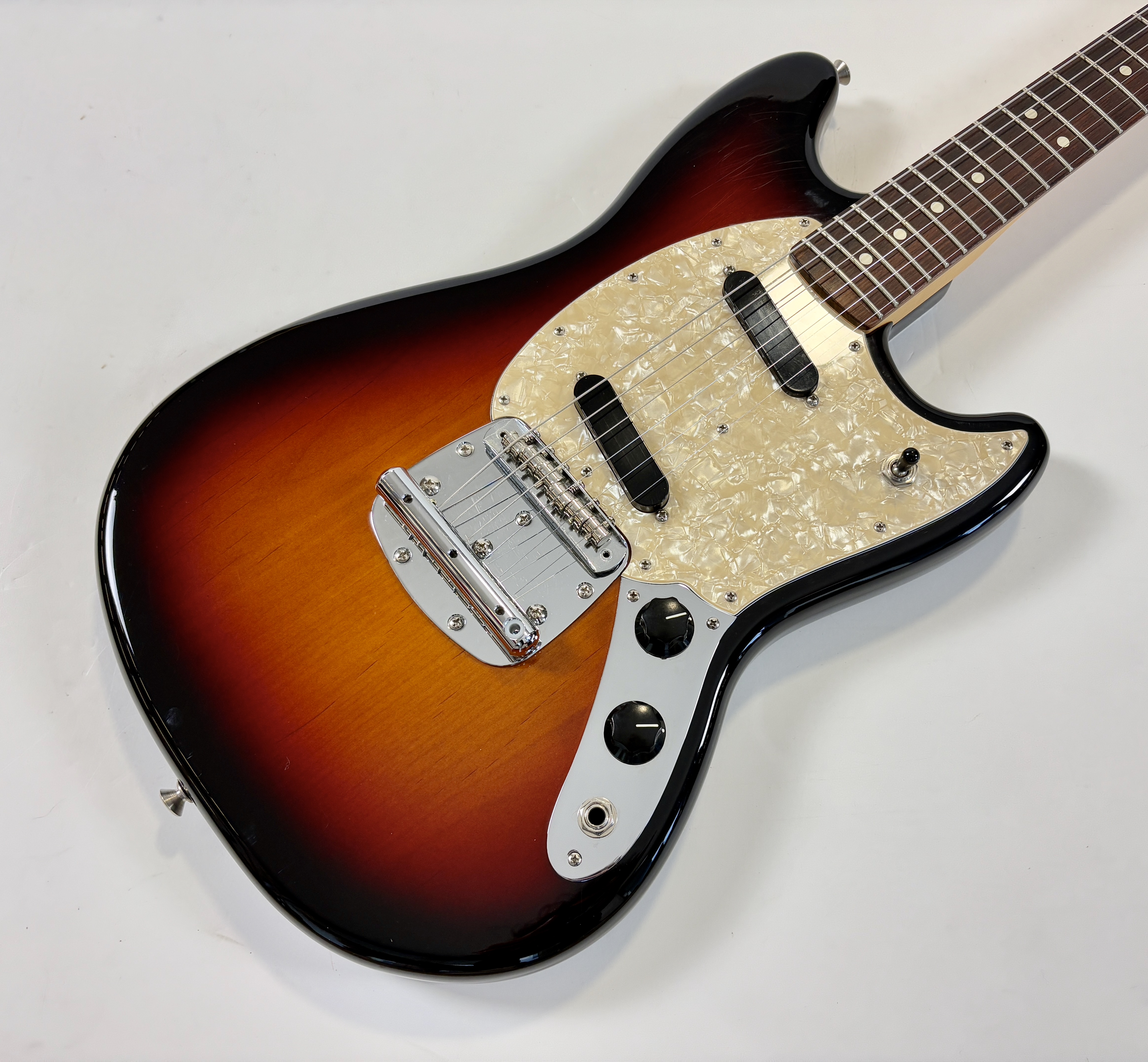 En 1956 apparaissent chez Fender deux guitares destinées aux débutants et aux moins fortunés : la Musicmaster et la Duo-Sonic. En 1964 c’est la Mustang qui entre en scène, sa principale différence avec la Duo est l’ajout d’un vibrato. Voici sa version modernisée : l’American Performer ! L’électronique a ici été simplifiée en revanche la lutherie reste classique : diapason de 24 pouces, corps en aulne, manche en érable profil modern C et touche palissandre au radius de 9,5 pouces. Les micros sont de la série Yosemite. En très bon état.Dépôt-vente, achat, vente, reprise, location.