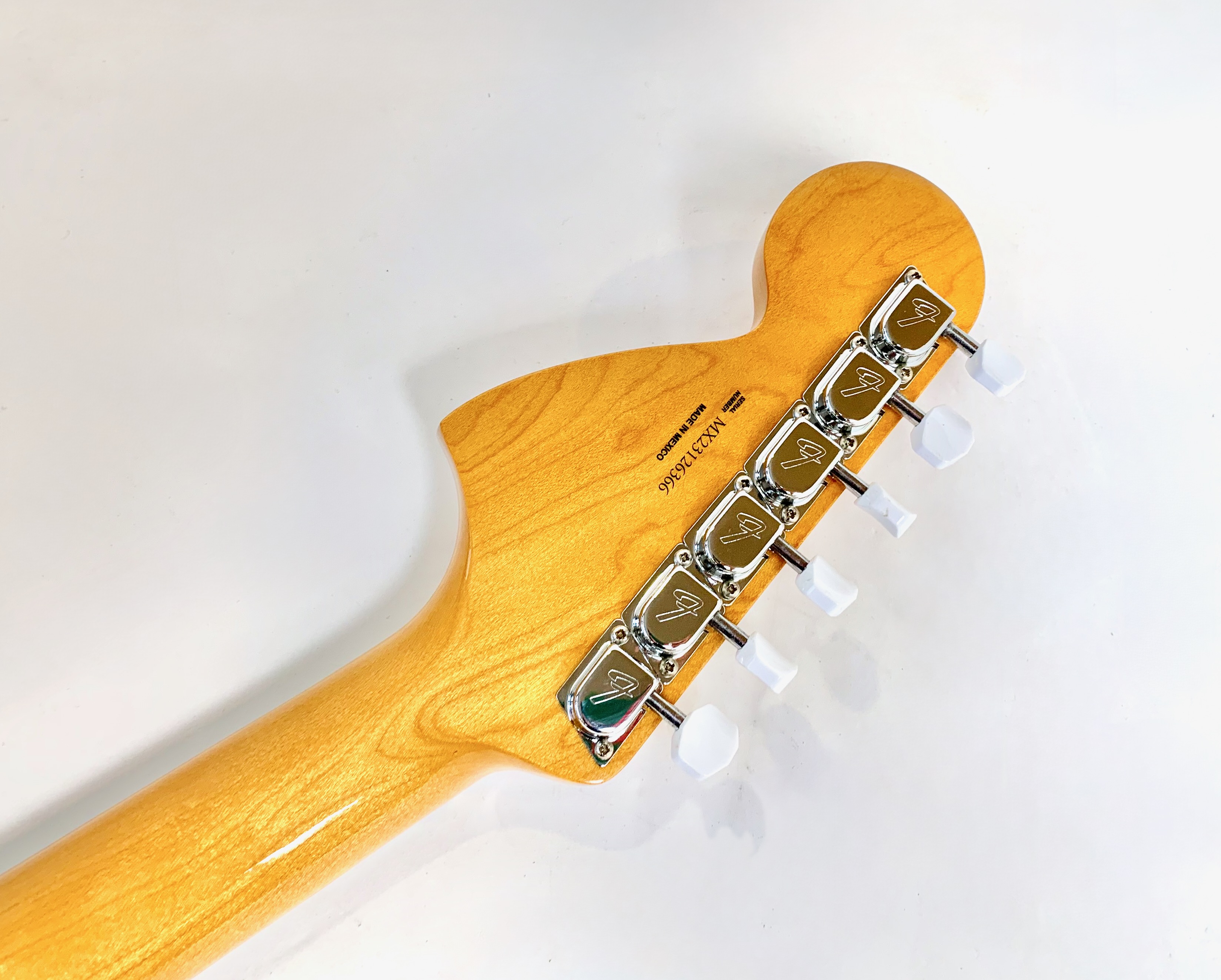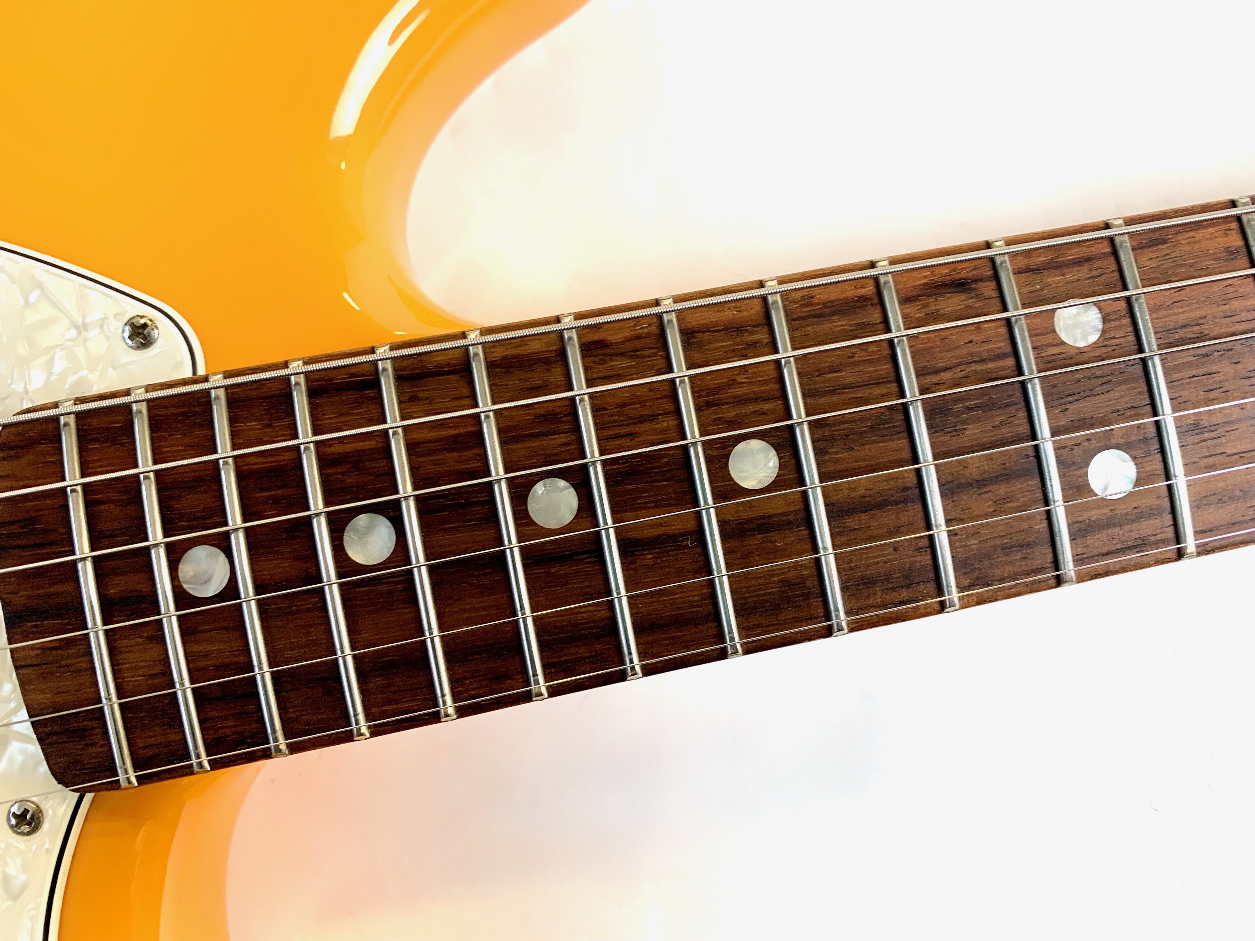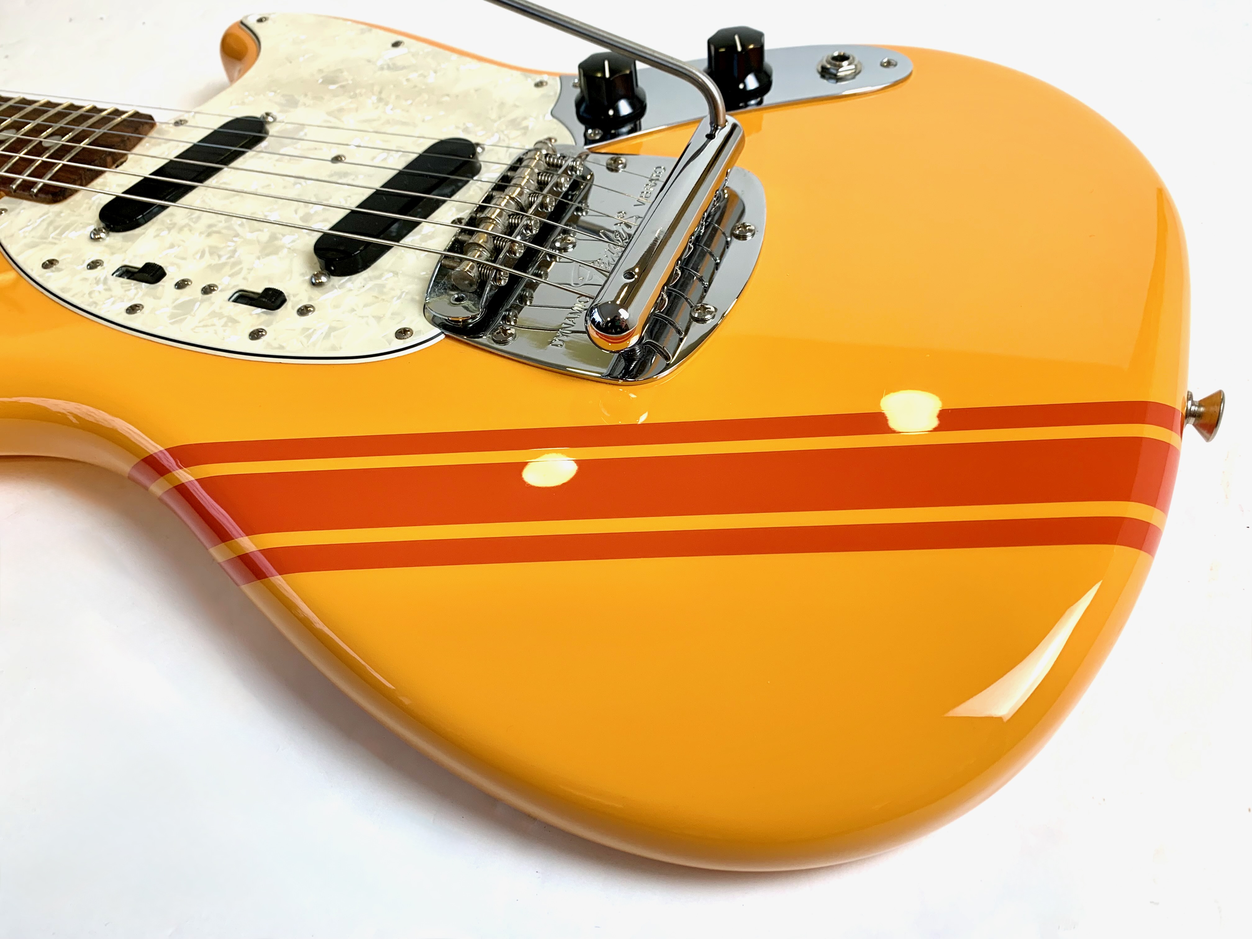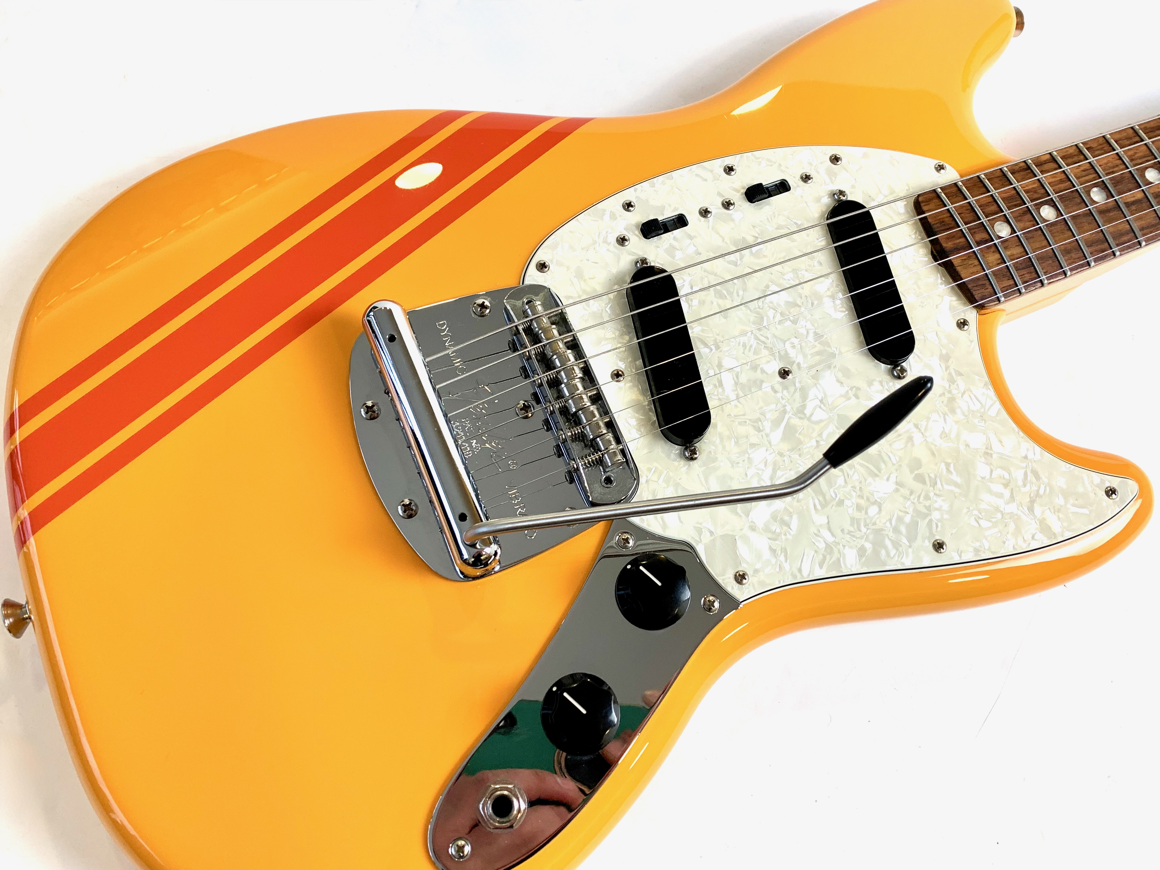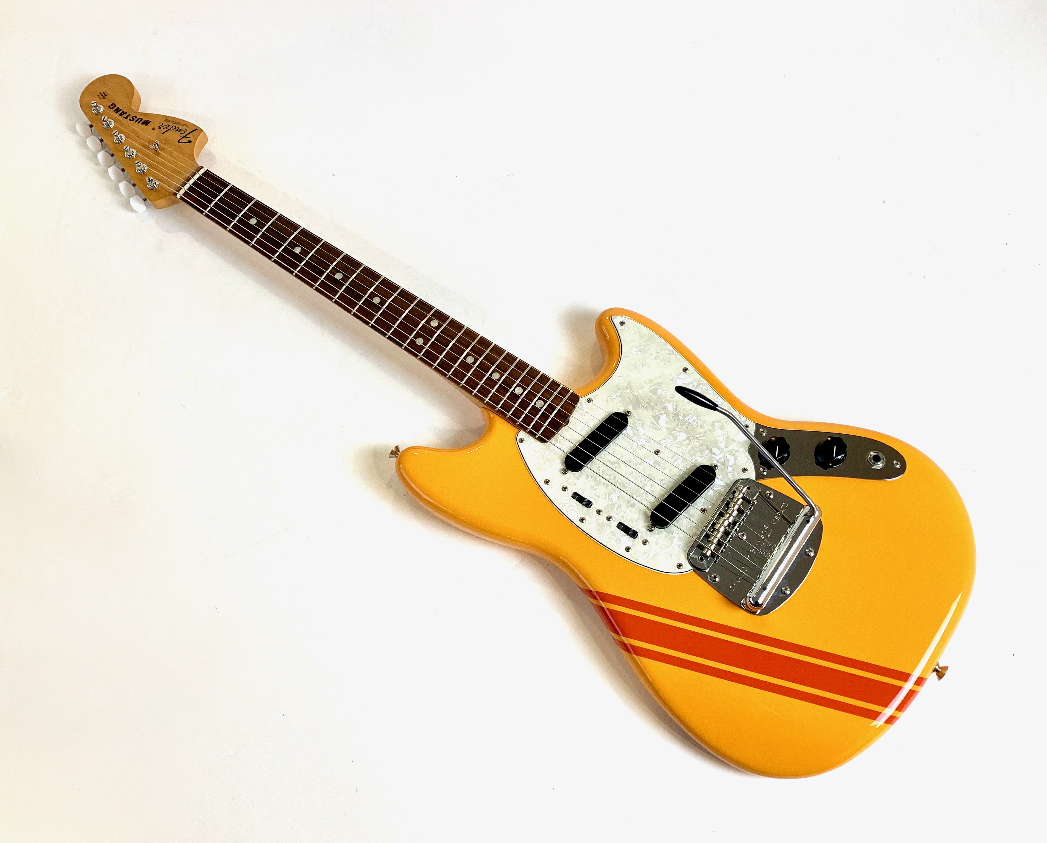 En 1956 apparaissent chez Fender deux guitares destinées aux débutants et aux moins fortunés : la Musicmaster et la Duo-Sonic. En 1964 c’est la Mustang qui entre en scène, sa principale différence avec la Duo est l’ajout d’un vibrato. Avec ses deux bandes, la Competition proposée dès 1969 s’inspire de l’univers automobile. La voici en réédition, issue de l'excellente série Vintera.Location, achat, vente, reprise, dépôt-vente.