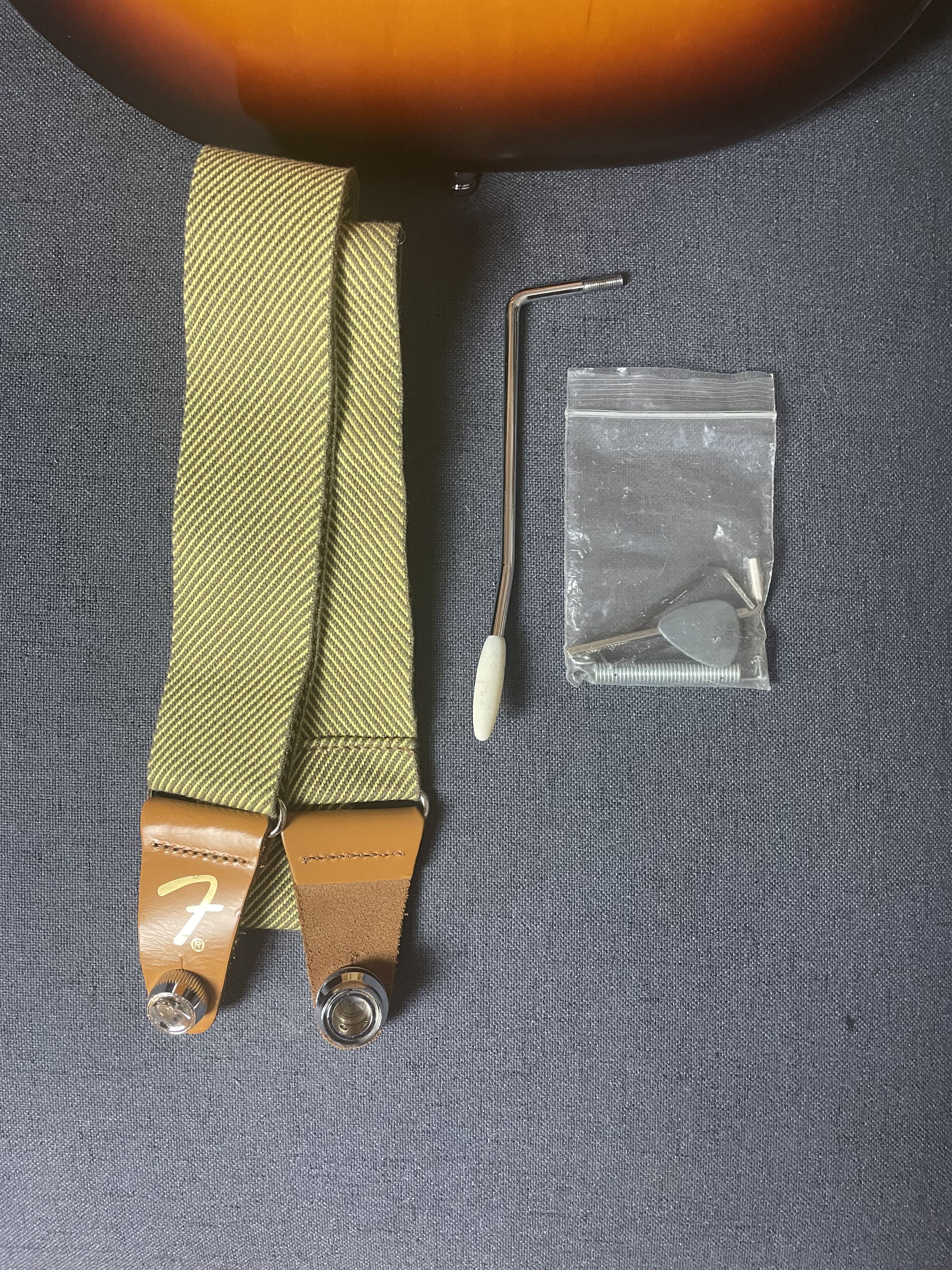- Une sangle Fender assortie avec Strap Locks Fender (système d'attache rapide sécurisé) déjà montés sur la guitare (plus aucun risque que la sangle se décroche en jouant)/