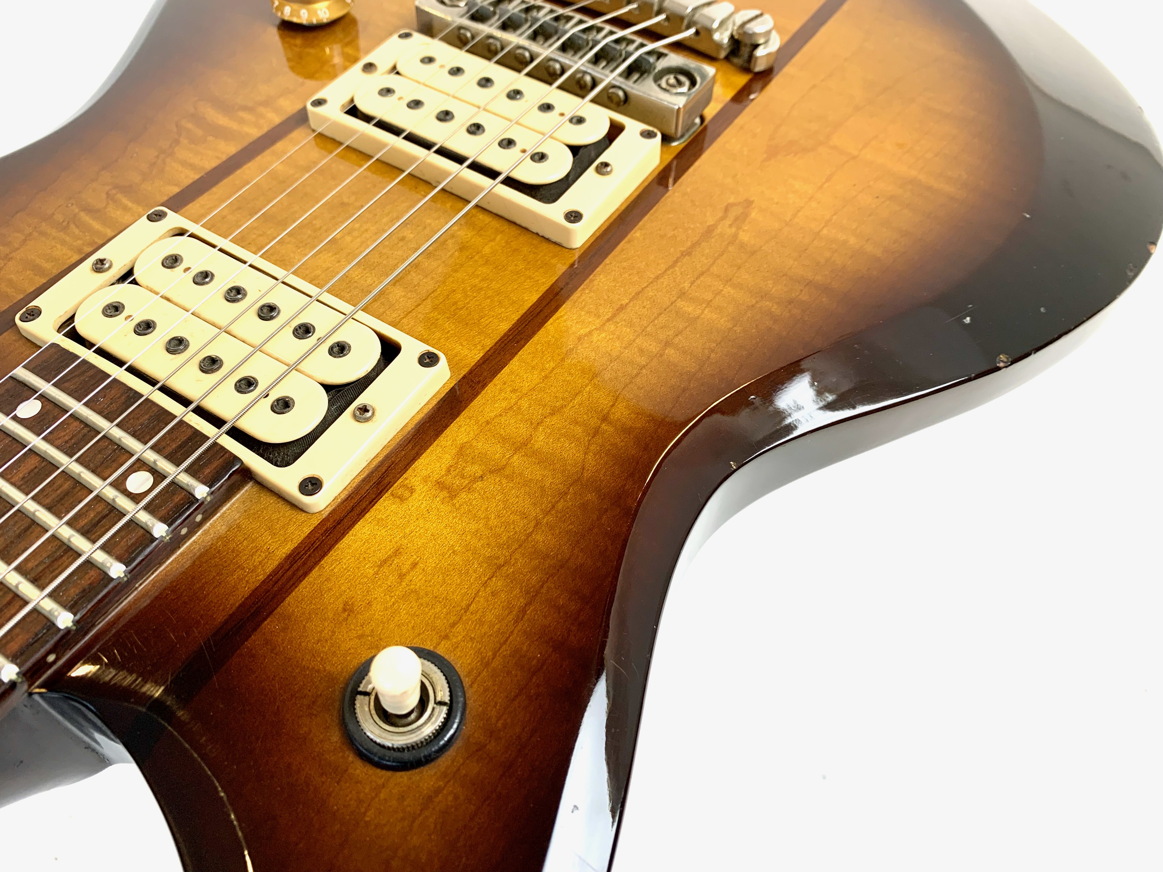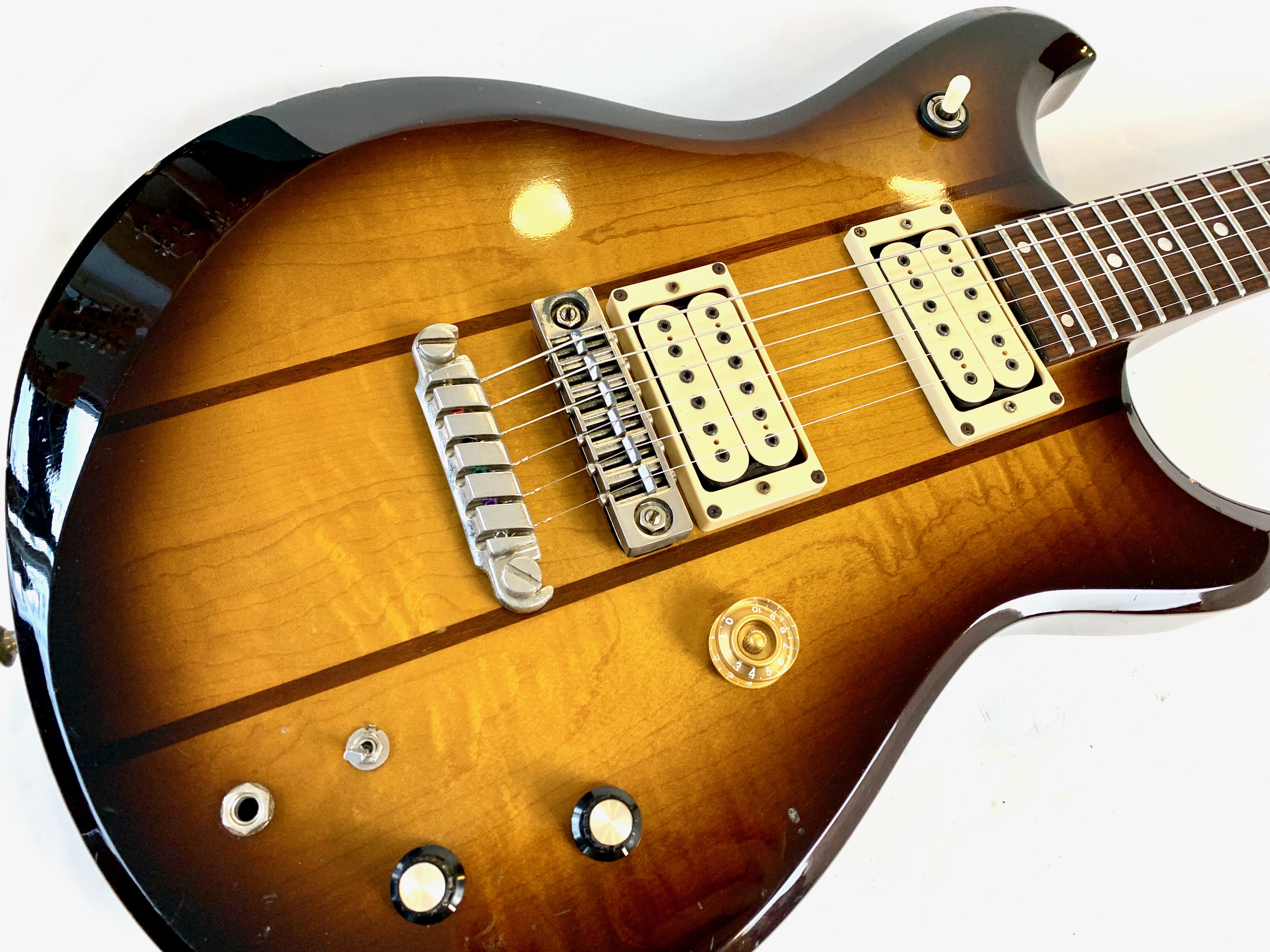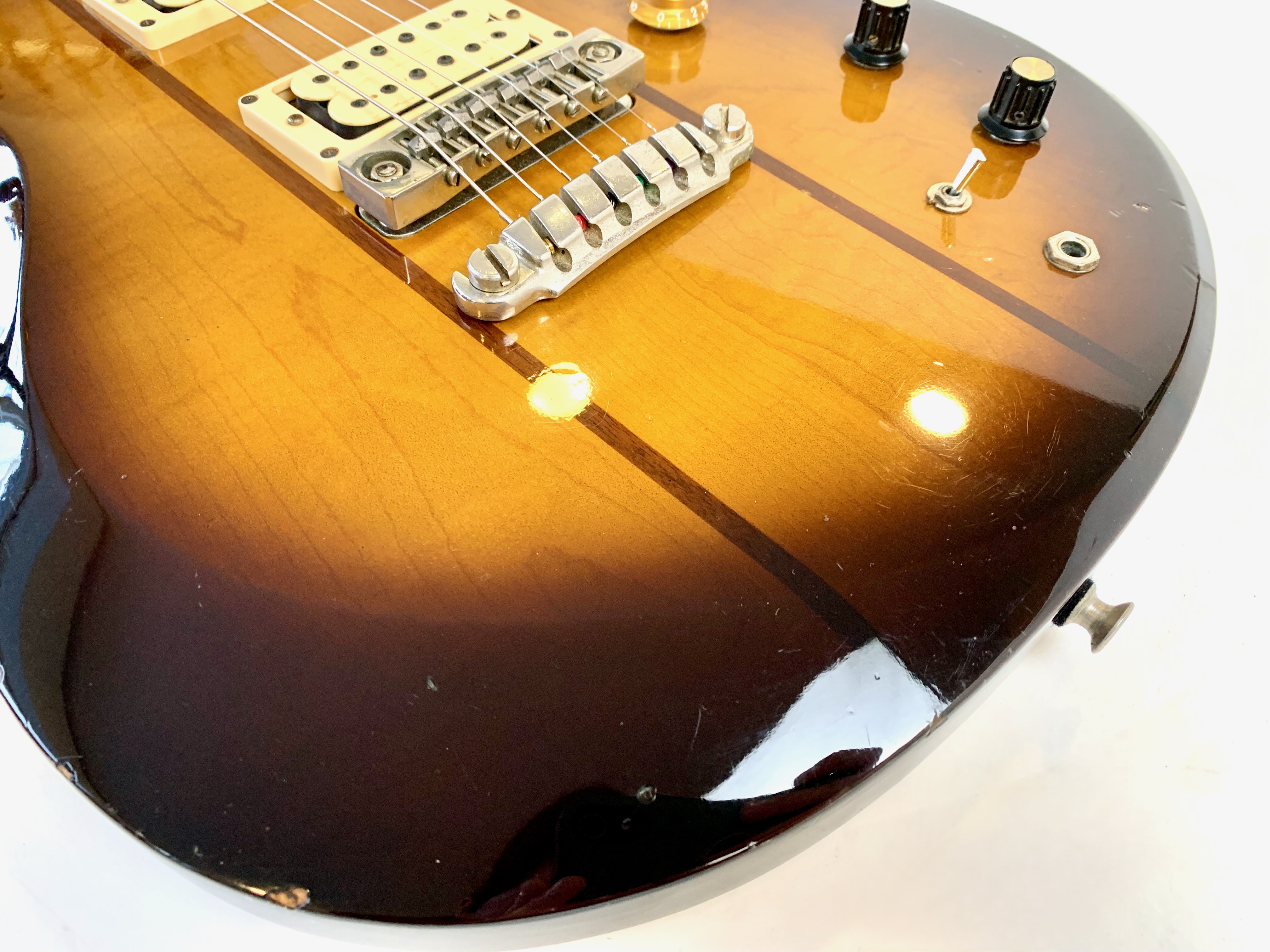 La ST200 est bien sûr une belle Made in Japan ! Le corps est fait d'érable en trois parties avec deux tranches de noyer. Le manche en érable également trois pièces et une touche en palissandre. En configuration HH, elle offre une paire de humbuckers accouplée à un électronique active. Comme d’habitude on retrouve la qualité de lutherie et l’assemblage sans faille typiquement nippons. Vendue en étui rigide.Location, achat, vente, reprise, dépôt-vente.