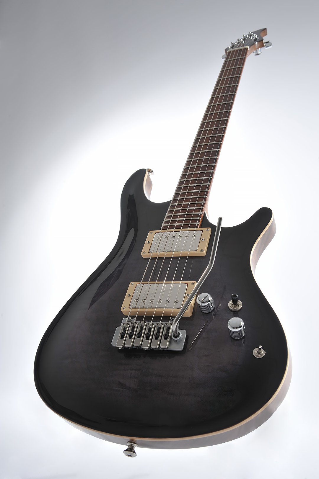- Manche en noyer flammé avec une touche en amourette de 24 frettes.