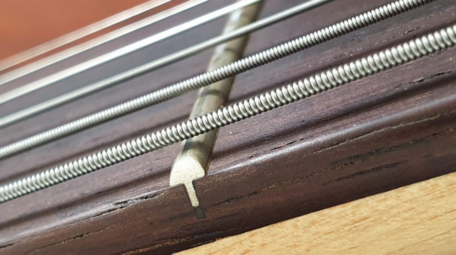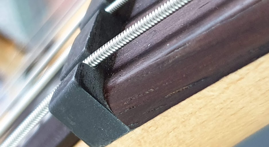 On voit le bord arrondi du manche et l'angle d'usinage des frettes