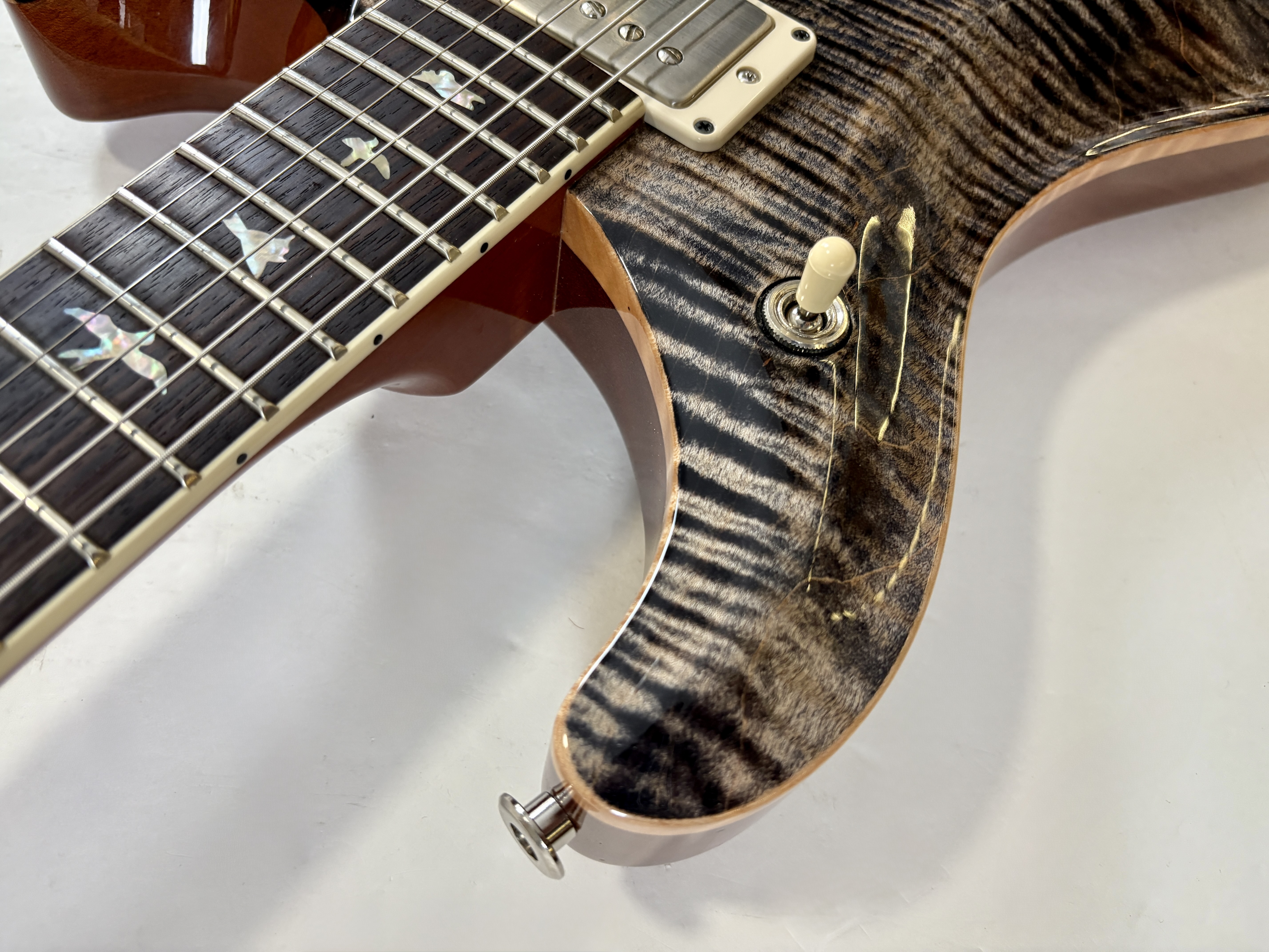 Cette Paul Reed Smith est toute de flamme vêtue dans sa livrée Charcoal Burst. Le manche en acajou (tout comme le corps) est au profil pattern vintage et sa touche en palissandre se pare des « birds » signature de la marque. Les deux humbuckers sont des 58/15 sur cette Ted Mc Carty (ancien directeur de la firme Gibson et consultant pour PRS). Celle-ci est en excellent état, vendue avec ses papiers dans son étui d’origine.Dépôt-vente, achat, vente, reprise, location.