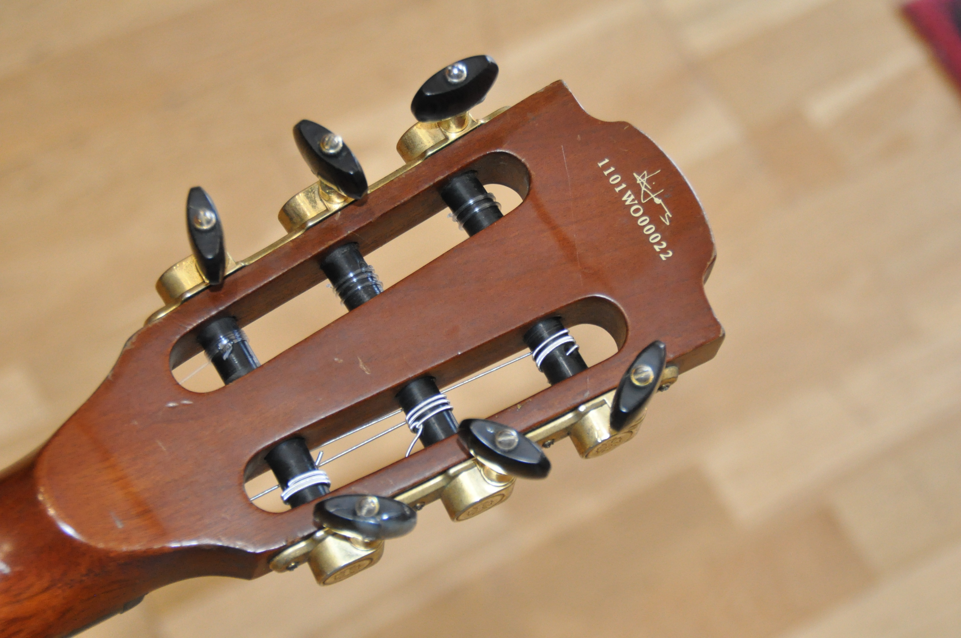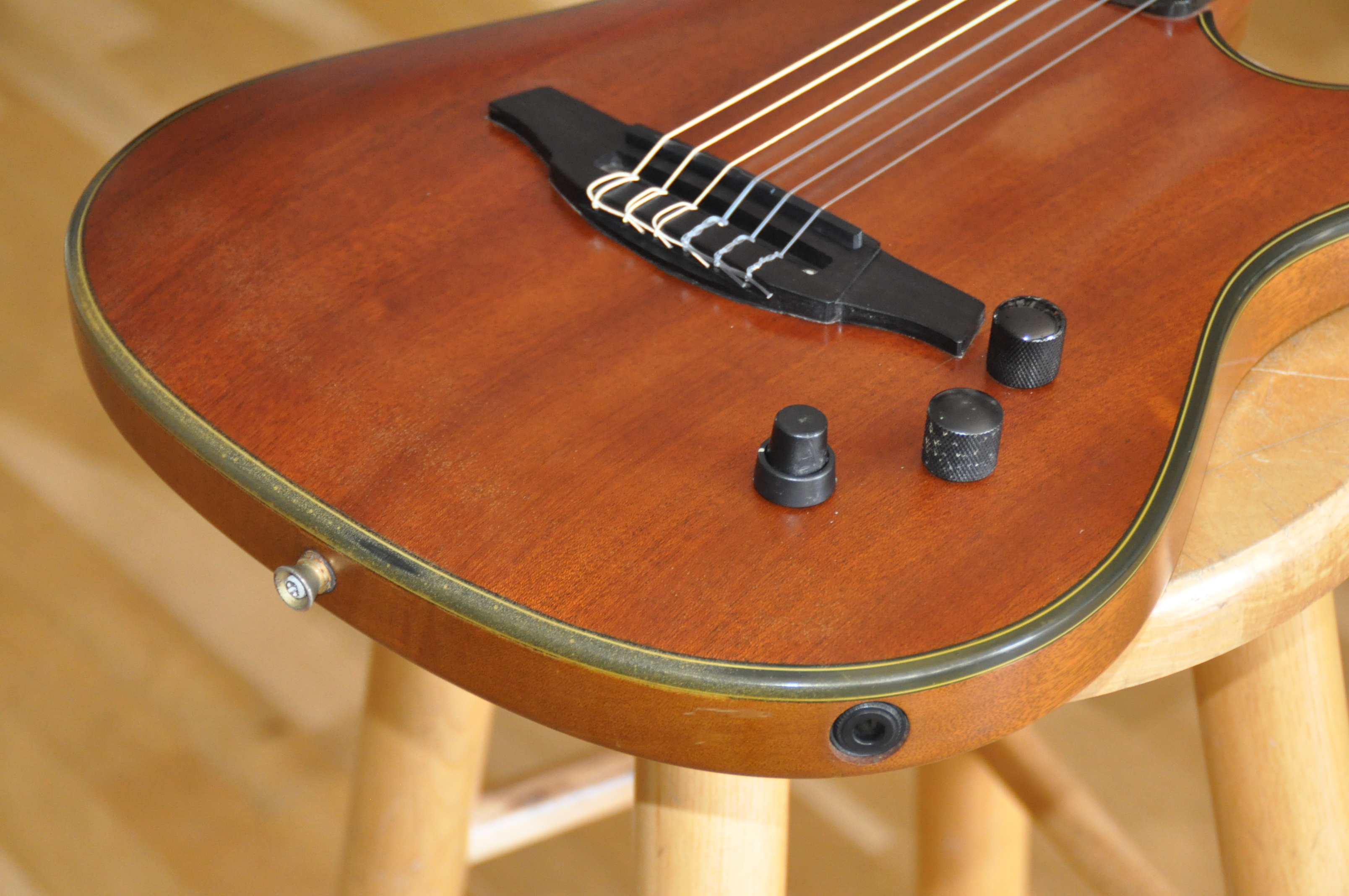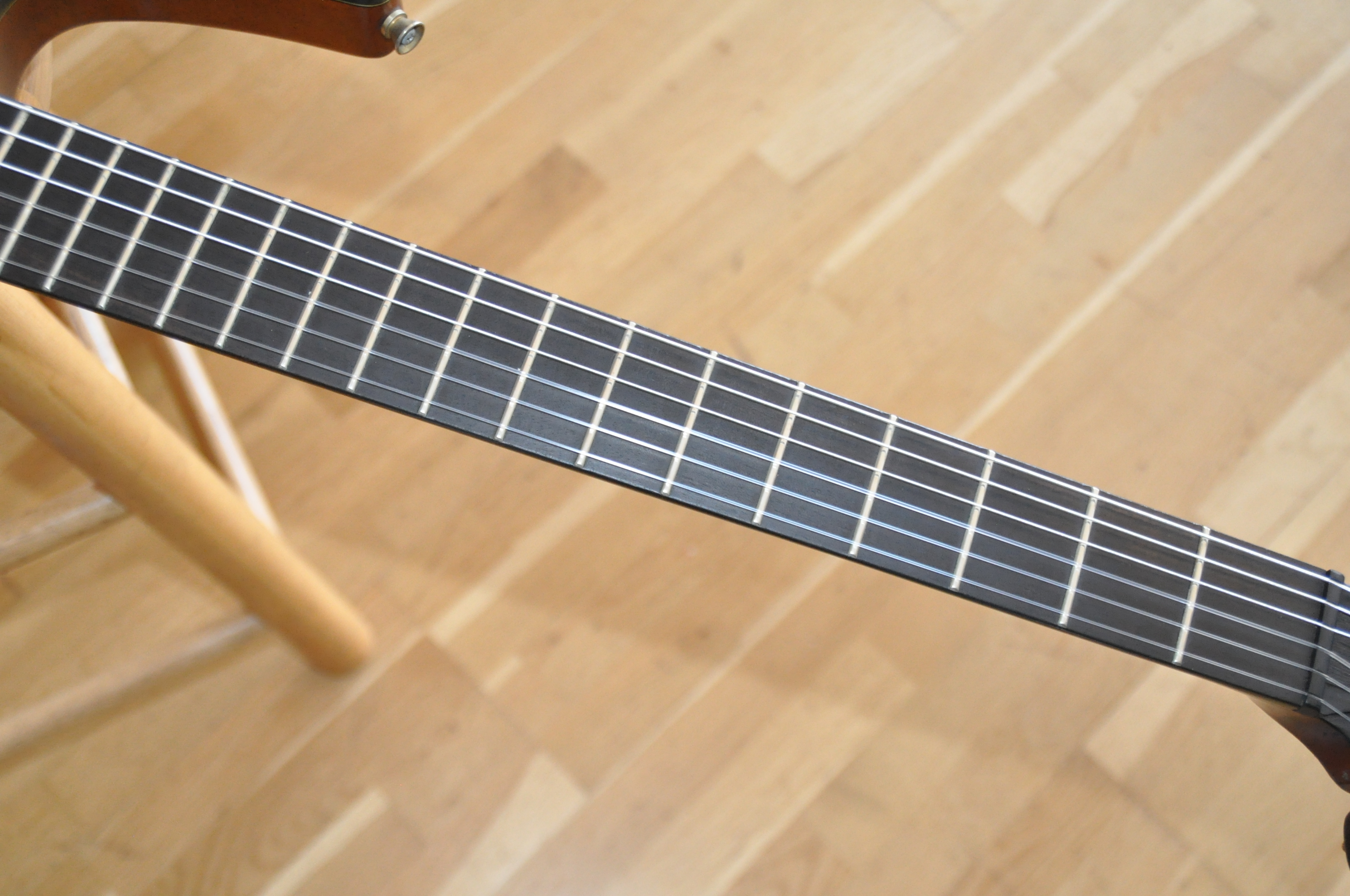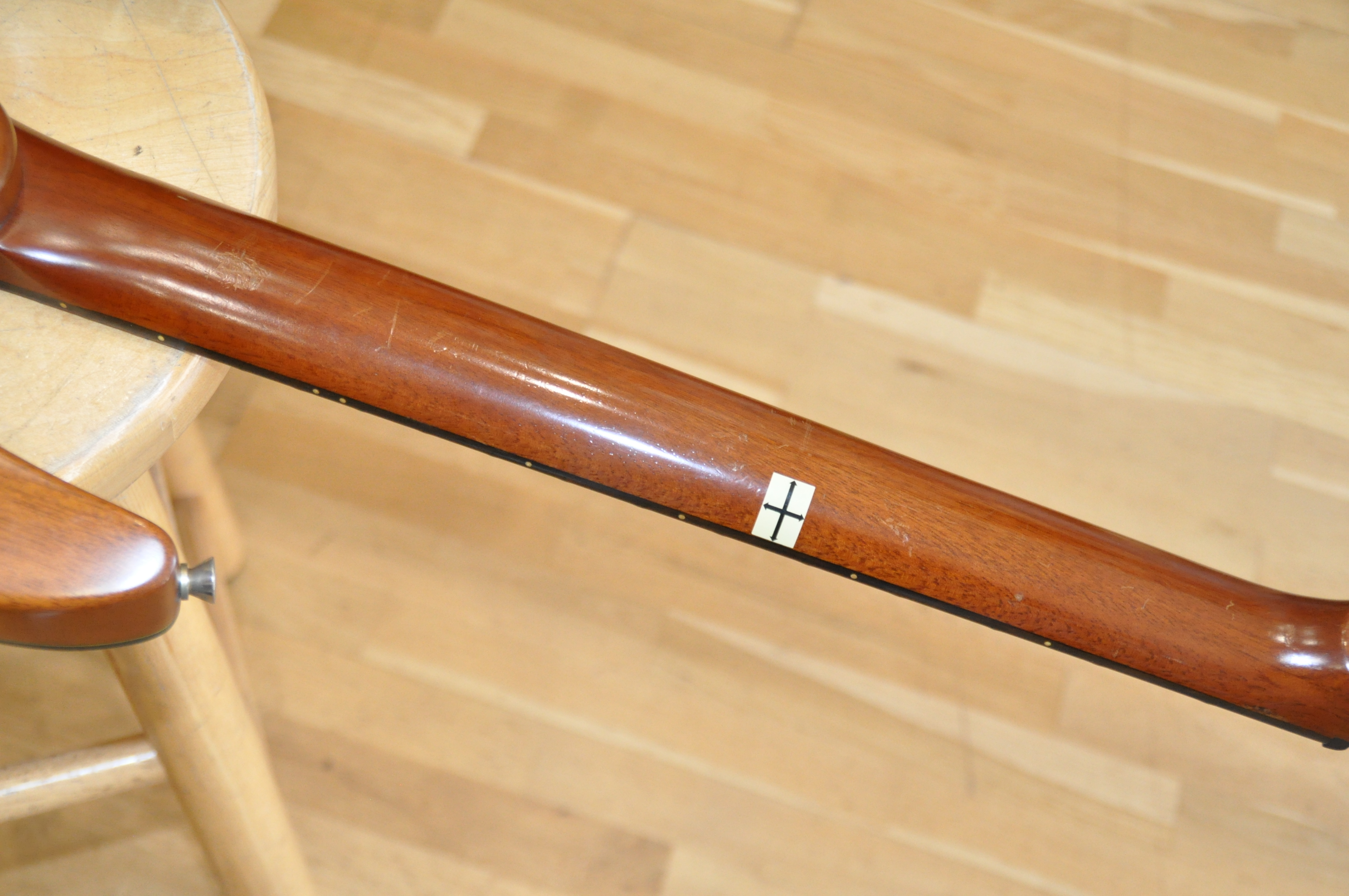 Manche : Acajou vissé, finition satin, renfort érable au talon