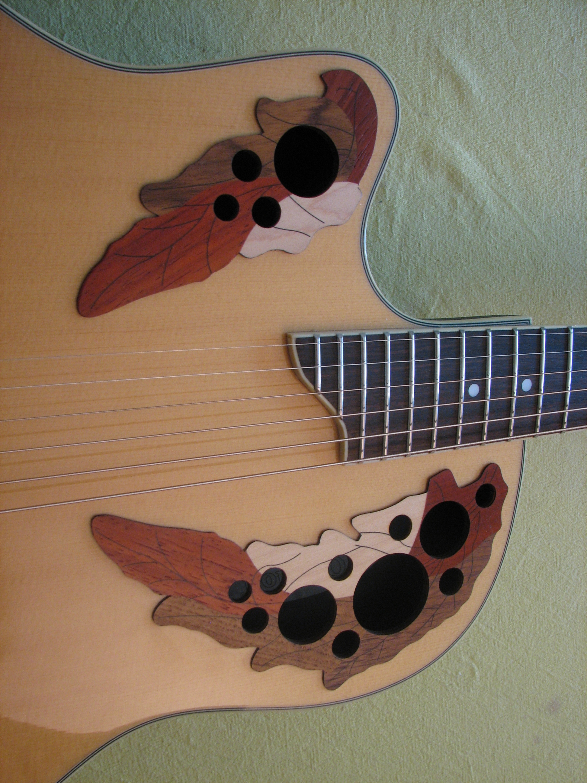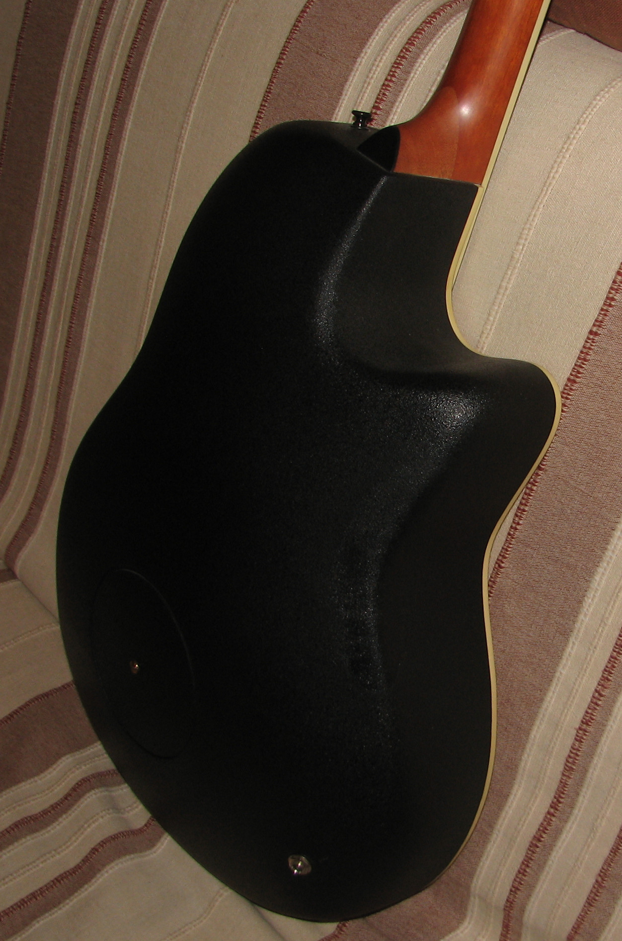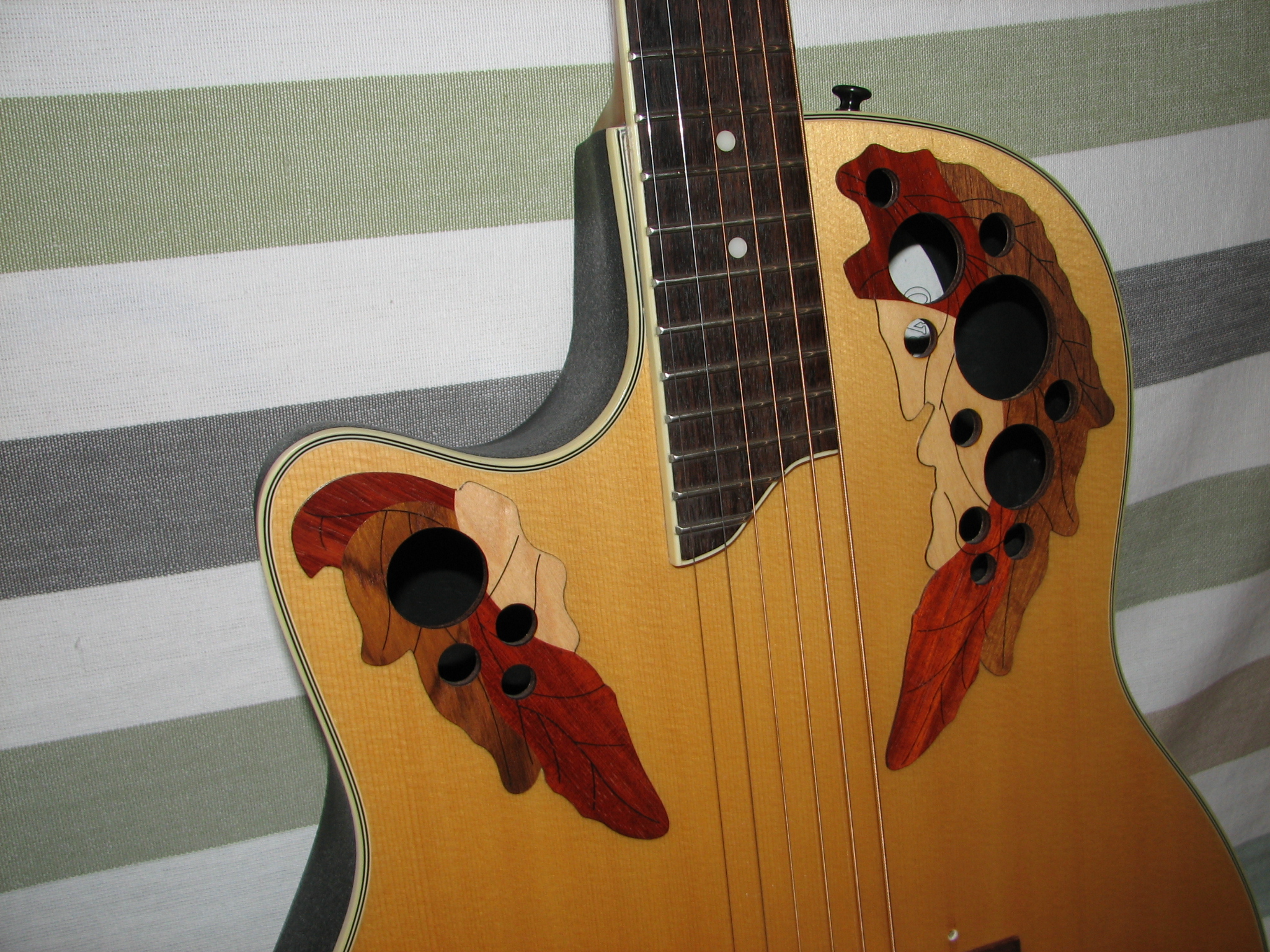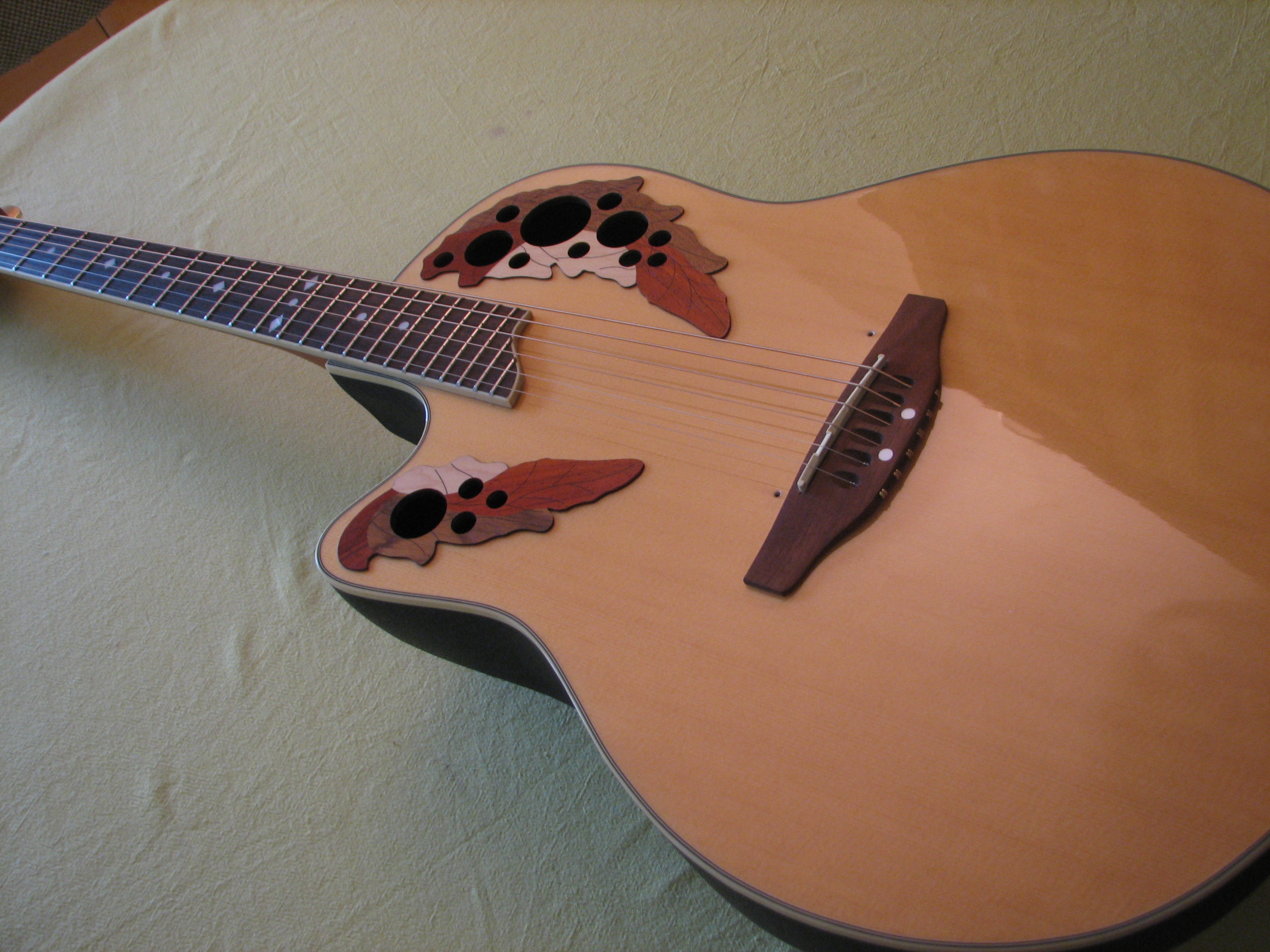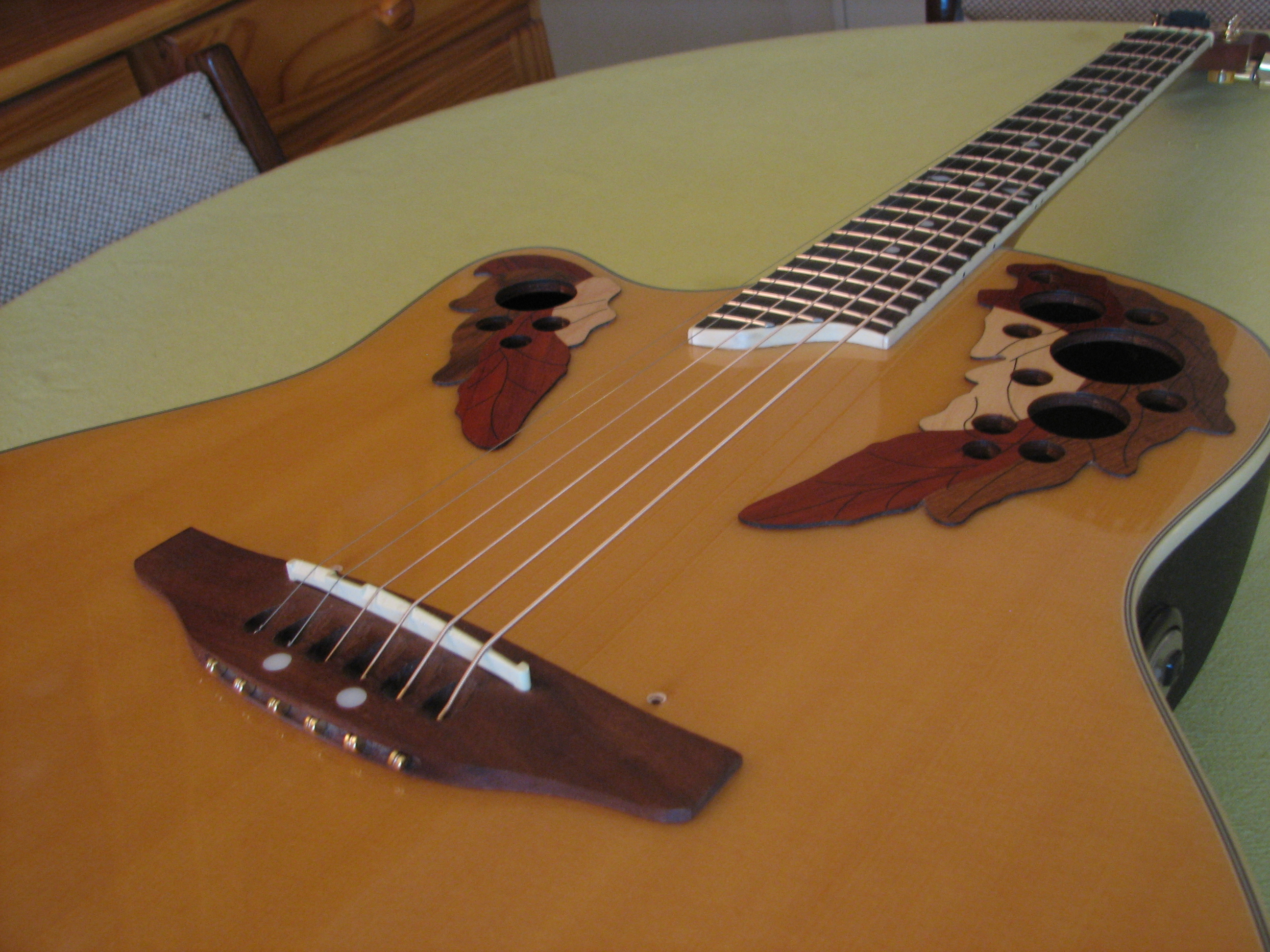 La table est en épicéa laminé, caisse Mid depth bowl (profondeur moyenne chez Ovation), vue la faible puissance acoustique une caisse moins épaisse aurait permis une prise en main plus facile.
