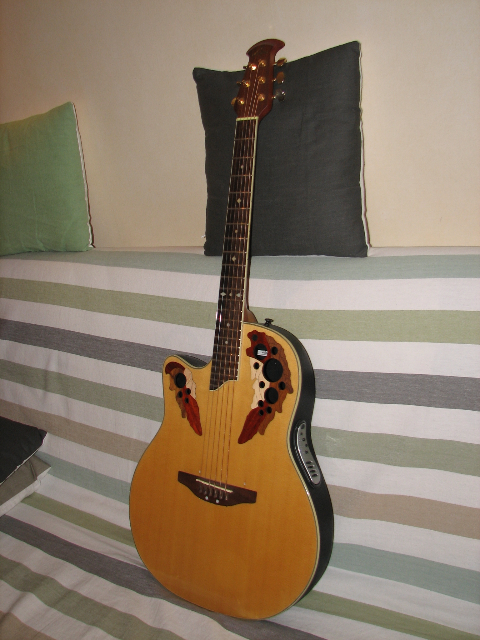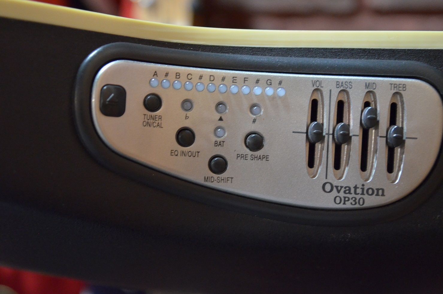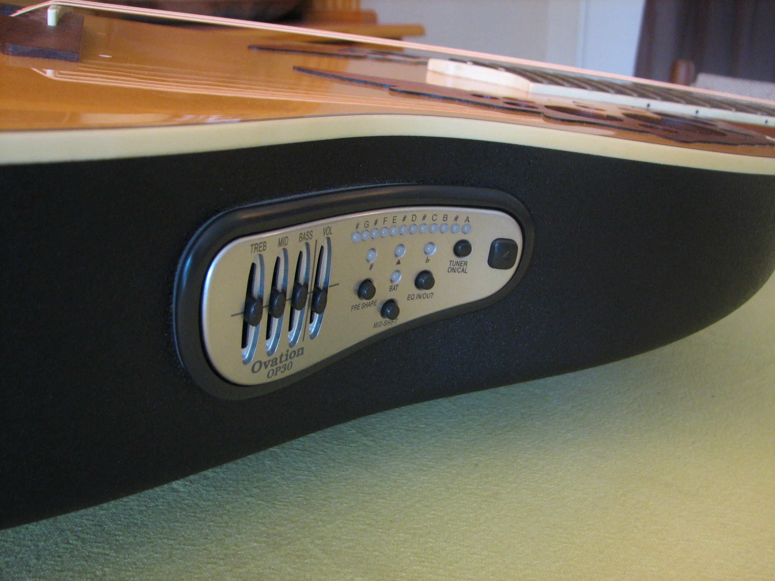 J'aime le son amplifié des Ovations,le preampli OP30 est très bon. Correction 3 bandes Bass/middle/Treble qui peut être by-passé , un volume, 2 switches Pre Shape et Mid Shift ,un accordeur très précis.