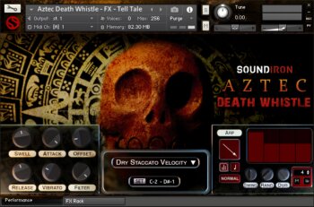 Soundiron Aztec Death Whistle est une banque de 723 échantillons sonores en 24 bits / 48 kHz enregistrés à partir d’une petite flûte en forme de crâne faite dans de la glaise. L’air insufflé dans un trou situé au dessus du crâne résonne dans deux cavités pour produire un son similaire à un râle, au souffle d’un agonisant, en résumé à quelque chose de démoniaque que vous pourrez facilement utiliser dans vos animations d’Halloween.