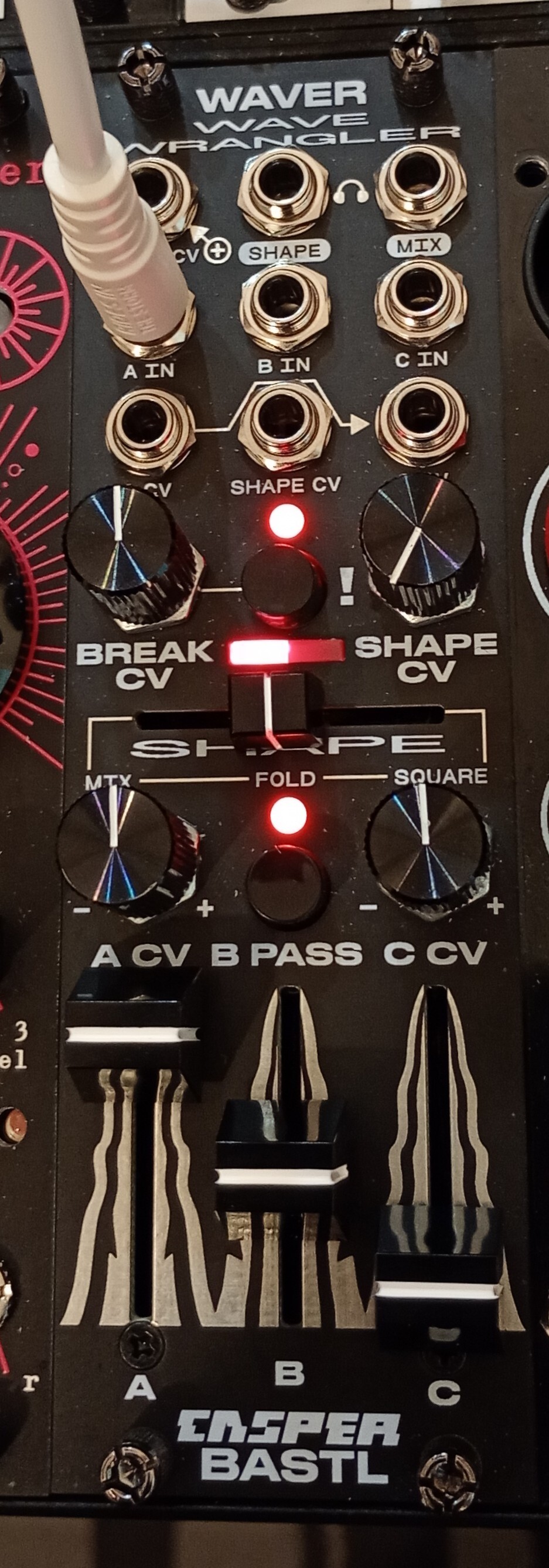 L’étage de mixage se compose des entrées A, B et C (avec faders) et de 2 VCA bipolaires avec contrôle CV d’atténuation (le Waver peut servir de compresseur et/ou d'expander). Les signaux sont traités dans la section SHAPE - via le fader dédié (contrôlable en CV) on passe d'un wavefolder à un waveshaper (square). On peut déformer davantage les signaux entrants avec le réglage BREAK (réinjection). Un module qui laisse donc la part belle aux "accidents heureux", pour peu que l'on explore ses possibilités.