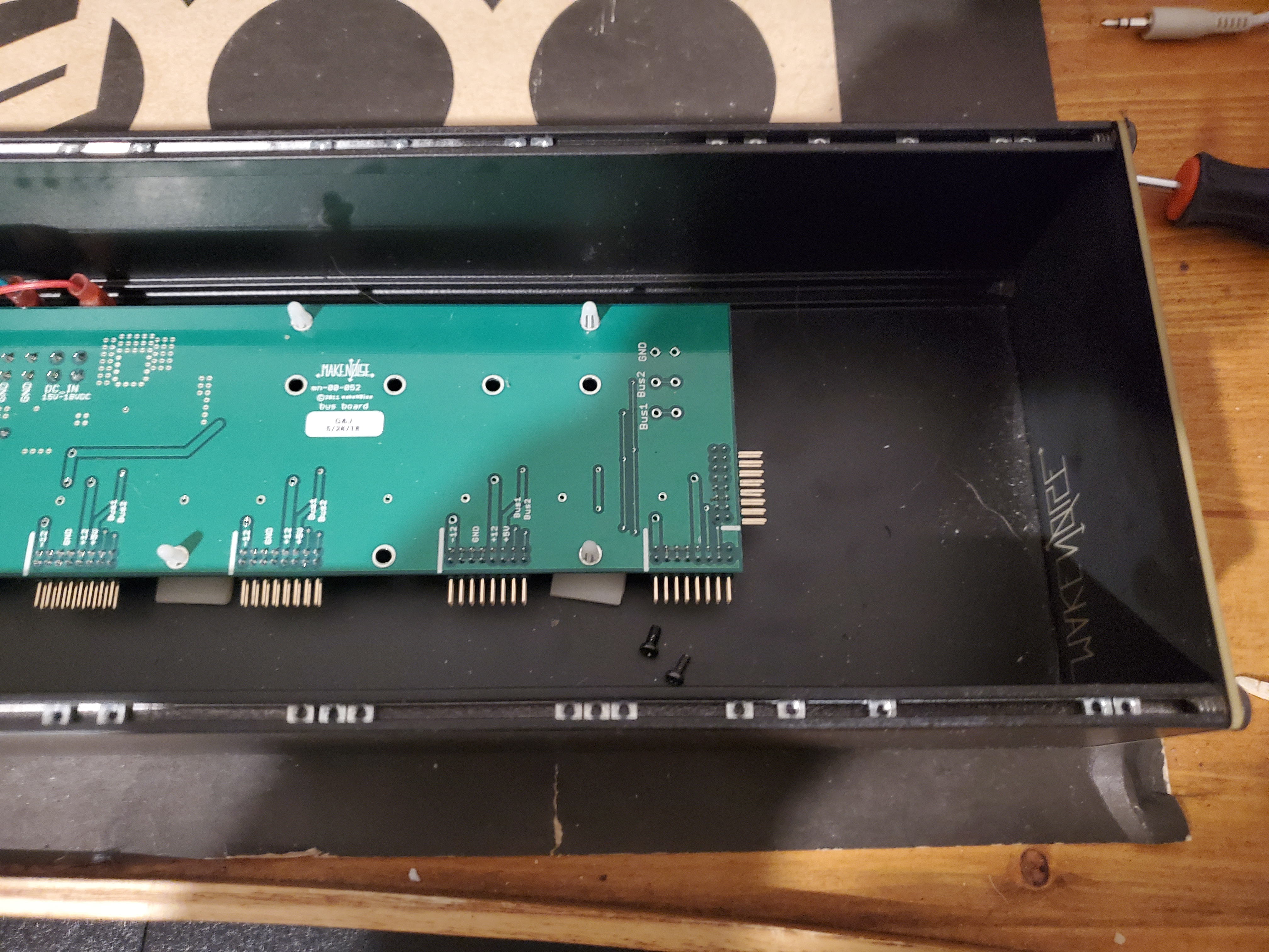 Vends mon case MN de 2022, excellent état, la qualité Make Noise : abordable, fin, robuste, chassis ergonomique, finition aluminium avec revêtement par poudre noir,Alimentation fournie côté gauche avec voyant rétro éclairé Make Noise, carte bus 1200 mA en + 12 v, 10 fiches inserts, 40 écrous coulissants (Sliding Square Nuts) et 32 vis M2.5 noires.
