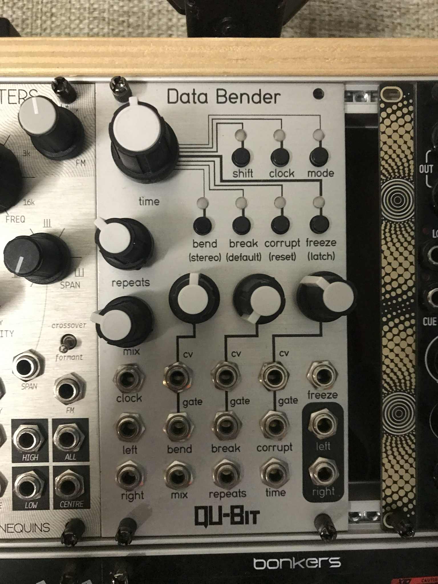Data Bender is a circuit bent digital audio buffer. It is inspired by the ways in which audio equipment can fail. The sounds of skipping CDs, software bugs, and defective tape machine playback are all accessible. The audio buffer can hold up to five minutes of stereo audio, providing a sonic canvas capable of infinite surprises and discovery.