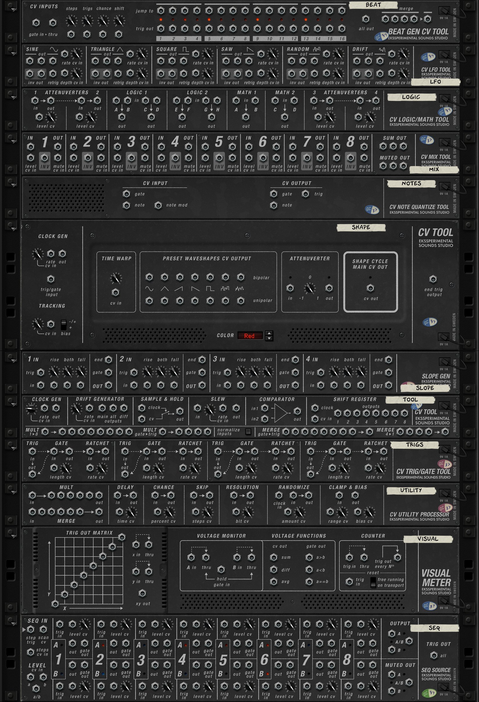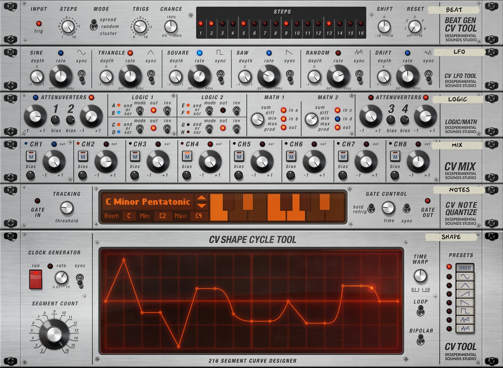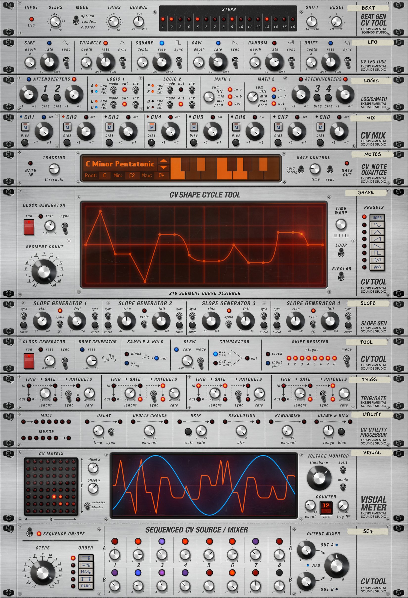 _ CV Tool • CV Mix Tool • CV Utility Processor • Sequenced CV Source/Mixer • CV LFO Tool • CV Slope Generator Tool • CV Shape Cycle Tool • CV Beat Generator Tool • CV Trig/Gate Tool • CV Logic/Math Tool • CV Note Quantize • CV Visual Meter Tool _