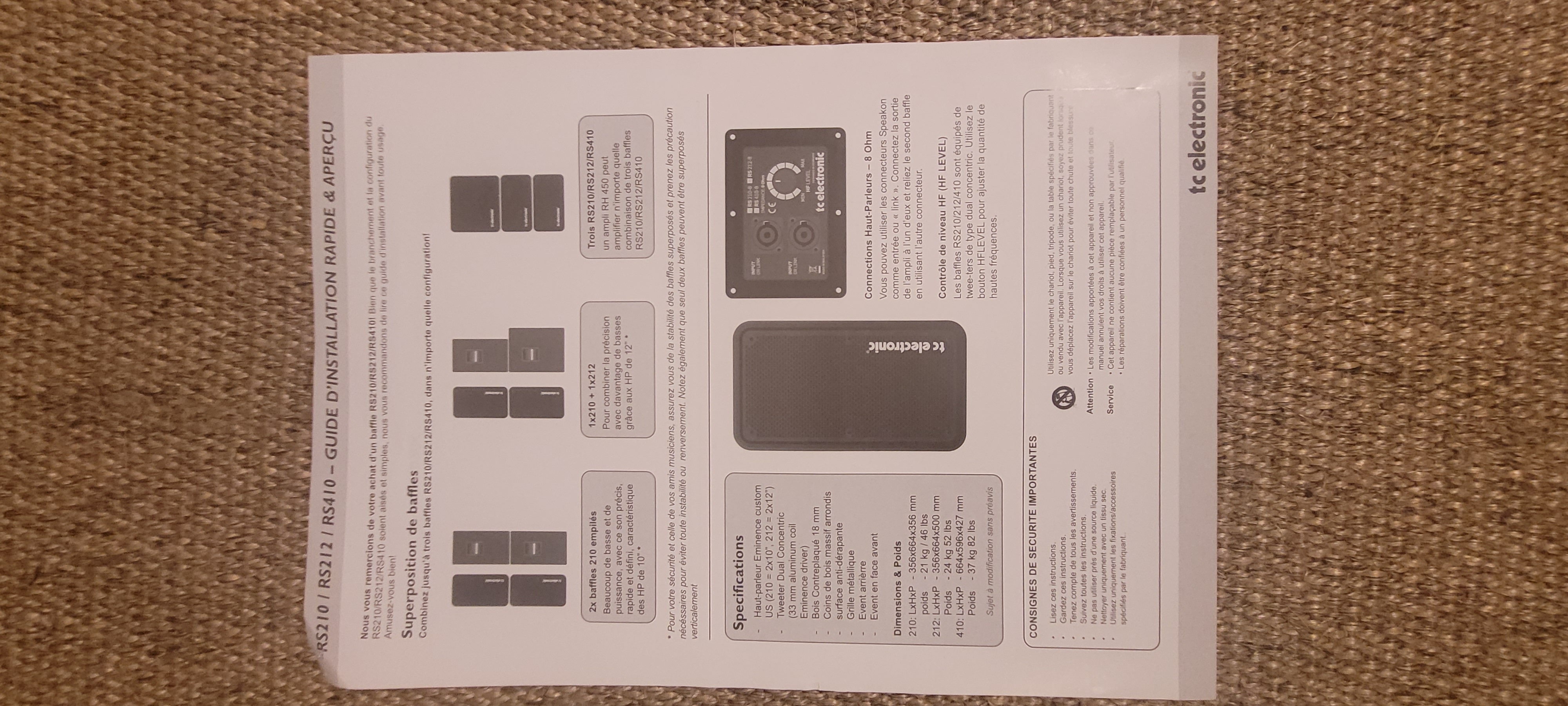 Pour les spécifications techniques, reportez- vous à la photo ci- jointe; le baffle délivre 400 Watt sous 8 Ohm.