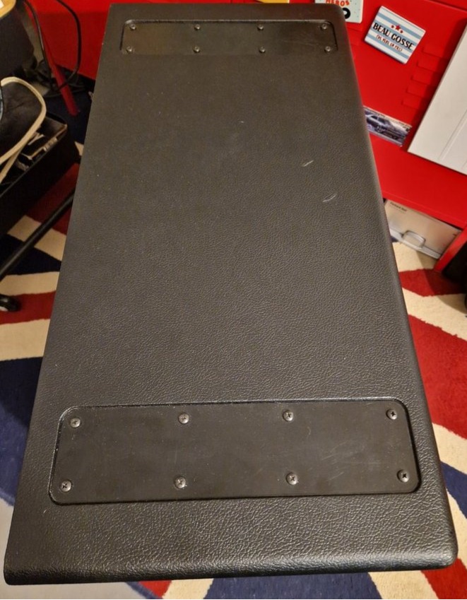 Excellent état, seules des micros marques sur les surfaces prévues pour accueillir les pieds des têtes d'ampli et deux petits coups sur le dessus (les 2 petits traits blancs) qui avaient été faits lors du transport jusque chez moi.