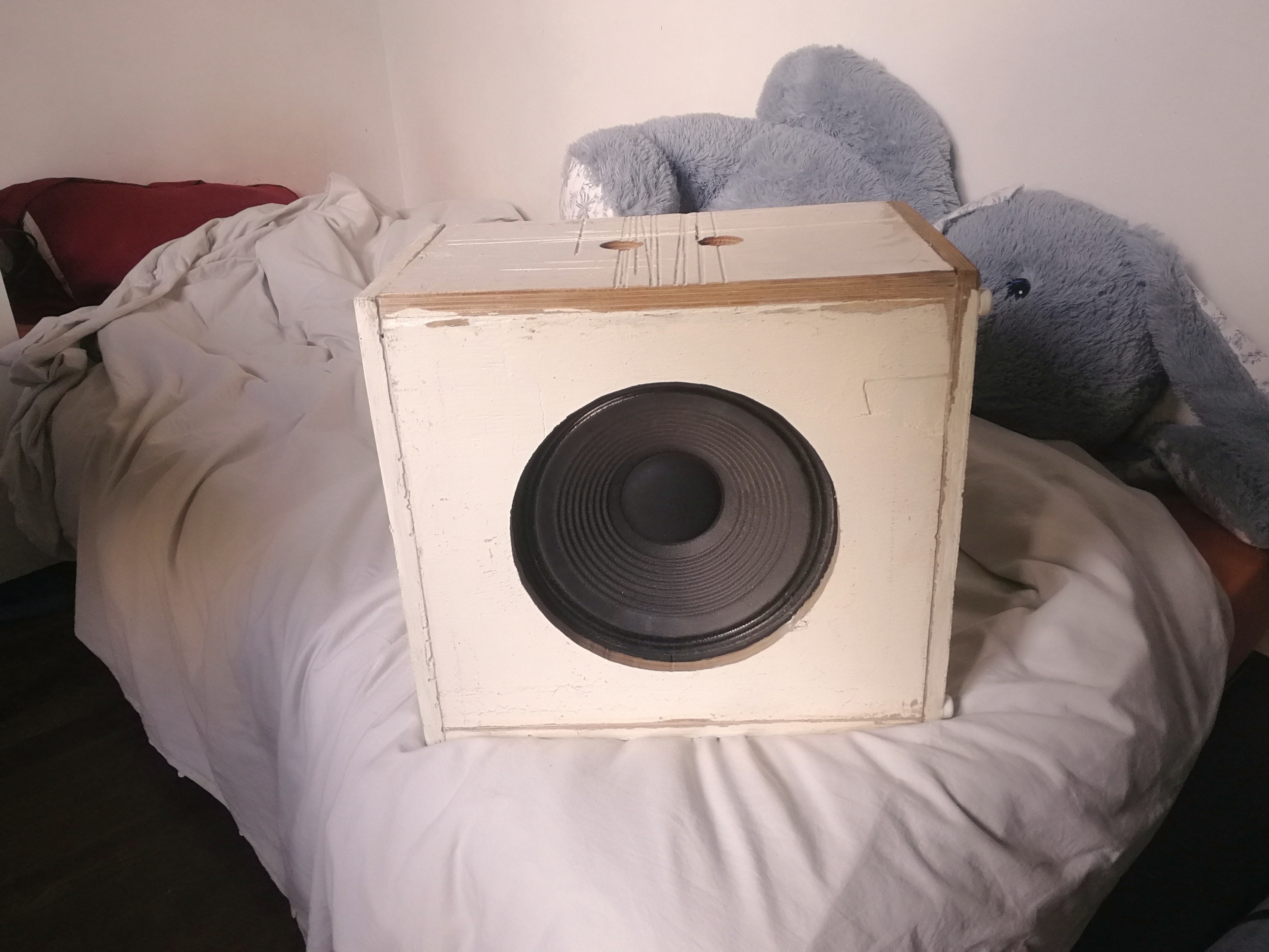 Baffle maison en CP intégral 15mm avec hp 10" 8ohms Roland issu d’un combo 40 Xl. Très suffisant chez soi avec bonnes basses sans pousser l'ampli